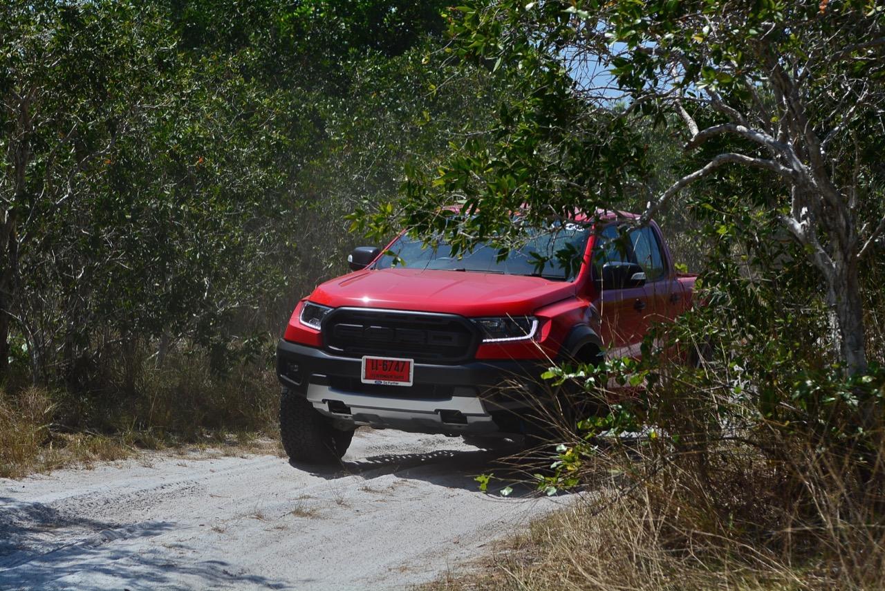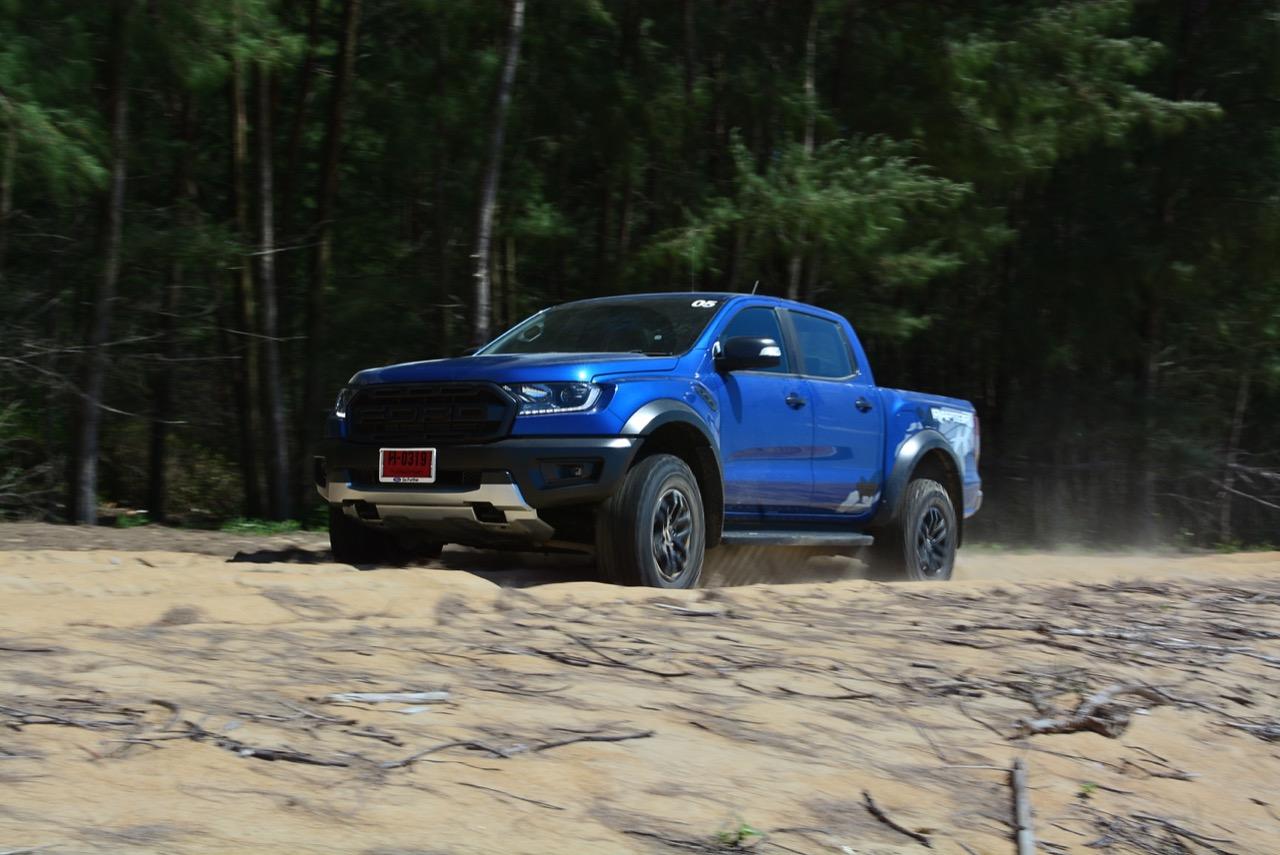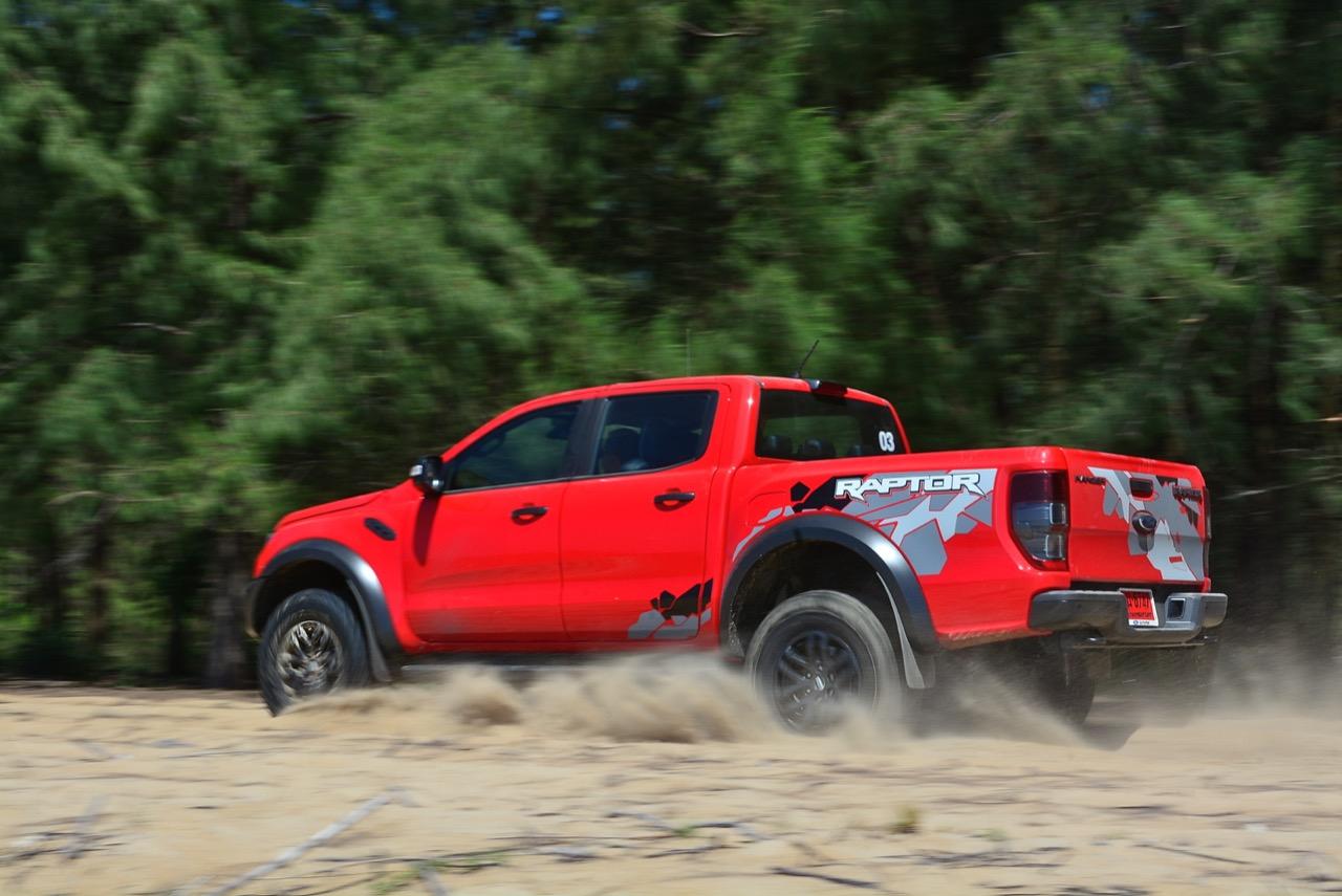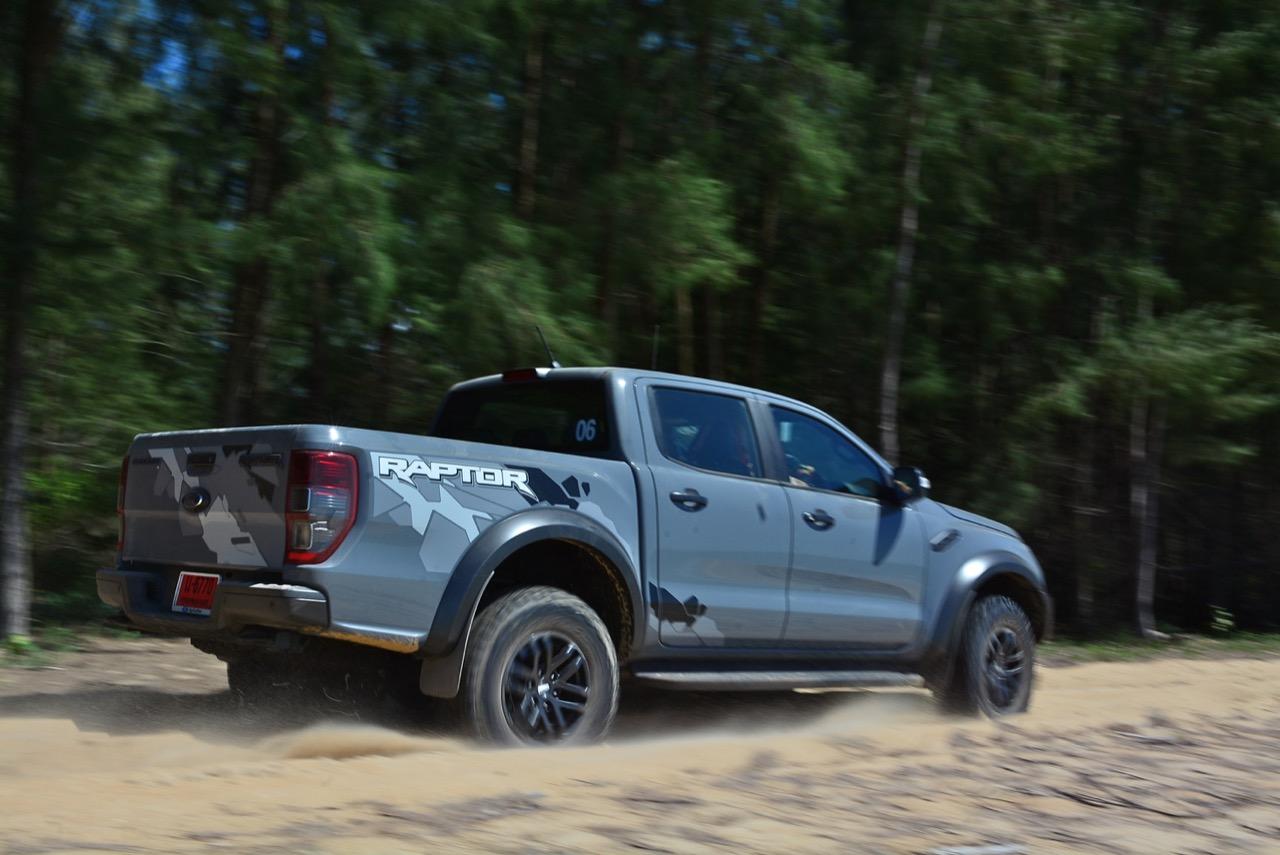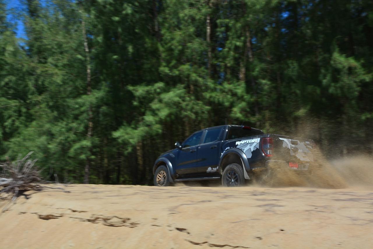เรื่องการลุยแหลกนั้นหายห่วง ด้วยความที่มีโหมดขับเคลื่อนเยอะมากถึง 6 โหมด คุณสามารถวางตำแหน่งที่ถูกต้องของรถด้วยความง่ายดายและเอาตัวรอดในเส้นทางที่ยากลำบาก ไม่ว่าจะขับบนทางลูกรัง ทราย โคลน หินหรือหญ้า เมื่อเทียบกับกระบะทั่วไปที่มีระบบขับเคลื่อน 4 ล้อก็สามารถลุยได้เหมือนกัน แต่ไม่มีโหมดที่จะช่วยให้ฟันฝ่าเส้นทางที่เป็นทรายลึก ใน Raptor ทุกอย่างง่ายๆ แค่กดปุ่มเลือกใช้โหมดให้ตรงกับสภาพของเส้นทางแค่นั้นก็พอ Ranger Raptor มีทุกอย่างที่จะช่วยให้การขับลุยกลายเป็นเรื่องง่ายดาย แค่คนขับมีทักษะในการควบคุมทิศทางและการใช้คันเร่งก็สามารถลุยฝ่าอุปสรรคได้อย่างสบายๆ จุดเด่นที่ดีงามของ Ranger Raptor อีกจุดก็คือการประกอบที่แน่นหนา เมื่อขับลุยฝ่าร่องสวนหรือหล่มลึกๆ แล้วไต่ขึ้นมาในลักษณะเอียงกระเท่เร่ ไม่มีเสียงลั่นของตัวถังดังเข้ามาให้ได้ยินแม้แต่น้อย รวมถึงคอนโซลและแดชบอร์ดก็ยังเงียบไม่ปรากฏว่ามีเสียงดังออดๆ แอดๆ ให้รำคาญใจ เป็นอีกจุดที่ทำออกมาได้โดนอยู่เหมือนกัน