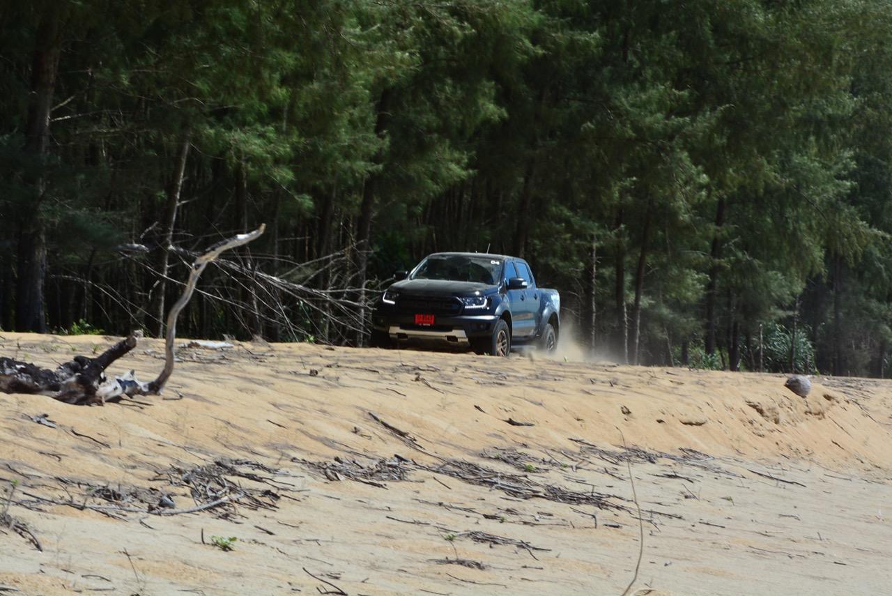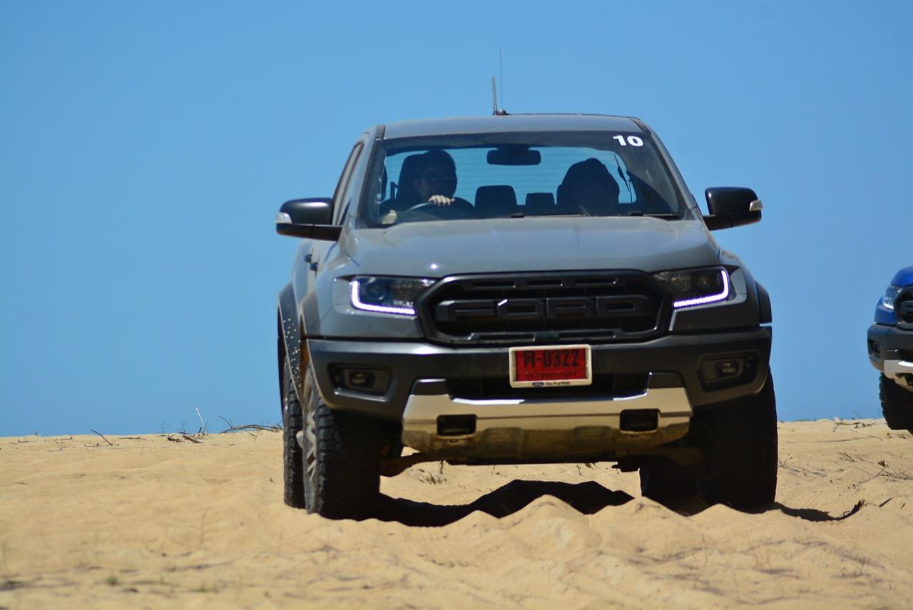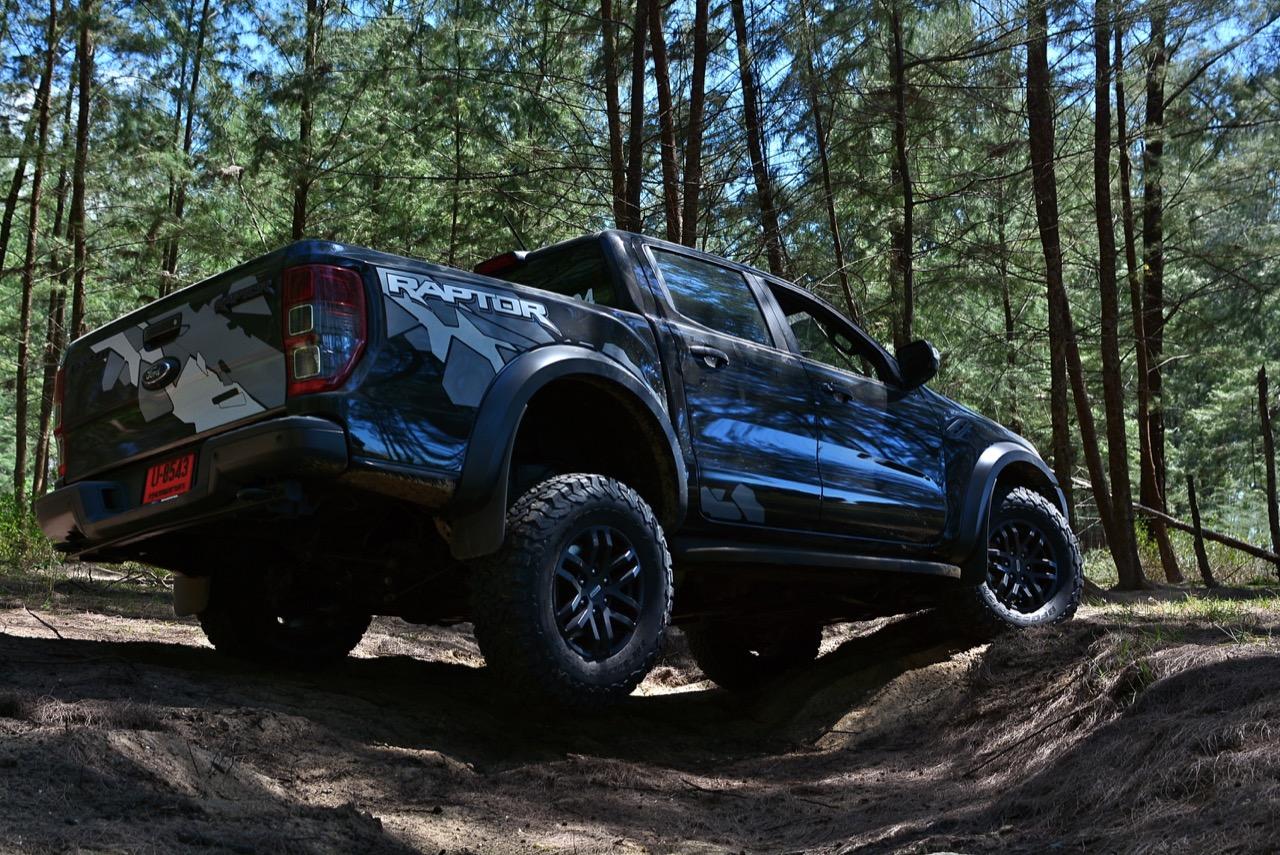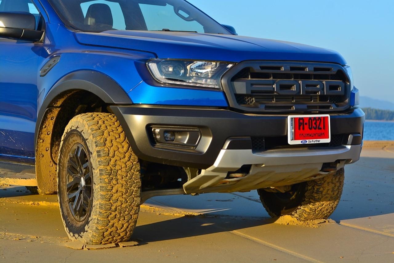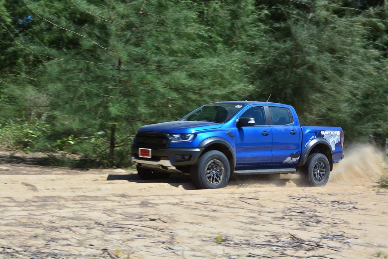 เรื่องการลุยแหลกนั้นหายห่วง ด้วยความที่มีโหมดขับเคลื่อนเยอะมากถึง 6 โหมด คุณสามารถวางตำแหน่งที่ถูกต้องของรถด้วยความง่ายดายและเอาตัวรอดในเส้นทางที่ยากลำบาก ไม่ว่าจะขับบนทางลูกรัง ทราย โคลน หินหรือหญ้า เมื่อเทียบกับกระบะทั่วไปที่มีระบบขับเคลื่อน 4 ล้อก็สามารถลุยได้เหมือนกัน แต่ไม่มีโหมดที่จะช่วยให้ฟันฝ่าเส้นทางที่เป็นทรายลึก ใน Raptor ทุกอย่างง่ายๆ แค่กดปุ่มเลือกใช้โหมดให้ตรงกับสภาพของเส้นทางแค่นั้นก็พอ Ranger Raptor มีทุกอย่างที่จะช่วยให้การขับลุยกลายเป็นเรื่องง่ายดาย แค่คนขับมีทักษะในการควบคุมทิศทางและการใช้คันเร่งก็สามารถลุยฝ่าอุปสรรคได้อย่างสบายๆ จุดเด่นที่ดีงามของ Ranger Raptor อีกจุดก็คือการประกอบที่แน่นหนา เมื่อขับลุยฝ่าร่องสวนหรือหล่มลึกๆ แล้วไต่ขึ้นมาในลักษณะเอียงกระเท่เร่ ไม่มีเสียงลั่นของตัวถังดังเข้ามาให้ได้ยินแม้แต่น้อย รวมถึงคอนโซลและแดชบอร์ดก็ยังเงียบไม่ปรากฏว่ามีเสียงดังออดๆ แอดๆ ให้รำคาญใจ เป็นอีกจุดที่ทำออกมาได้โดนอยู่เหมือนกัน