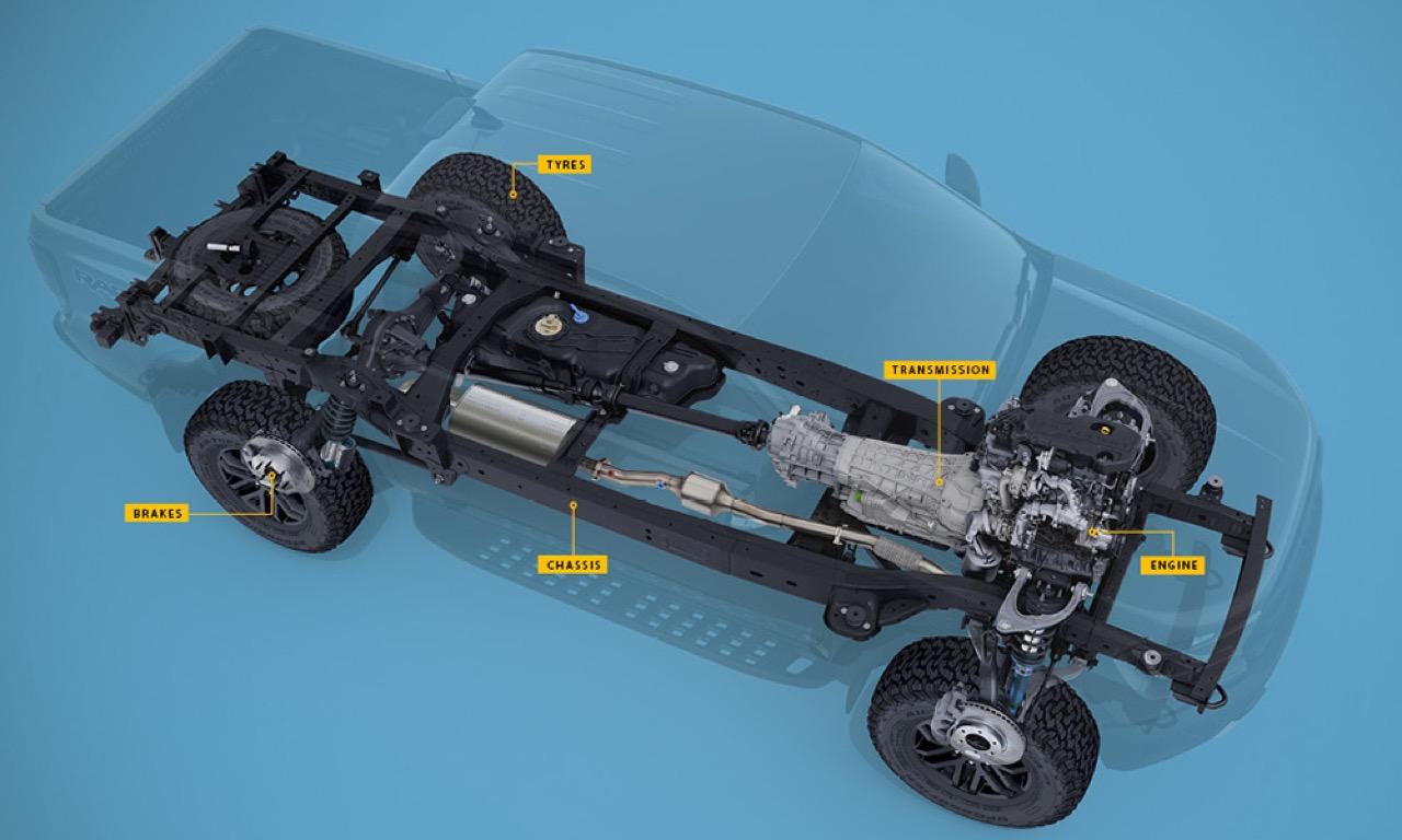 แชสซีใหม่ที่หนาบึ้กของ Raptor ออกแบบมาเพื่อรับงานหนัก เอาไปขับลุยไม่ต้องกลัวบิดหรือแตก แชสซีของ Ranger Raptor ได้รับการออกแบบใหม่มาเป็นพิเศษสำหรับการขับขี่ออฟโรดความเร็วสูง มีความแกร่งมากพอที่จะรับแรงกระแทกที่เกิดจากการขับบนทางวิบาก ระบบกันสะเทือนหลังแบบใหม่รวมถึงระบบวัตต์ลิงค์และสปริงคอยล์โอเวอร์ช็อกทำให้เพลาเคลื่อนที่มั่นคง ช่วยเรื่องการทรงตัวและการควบคุมรถ