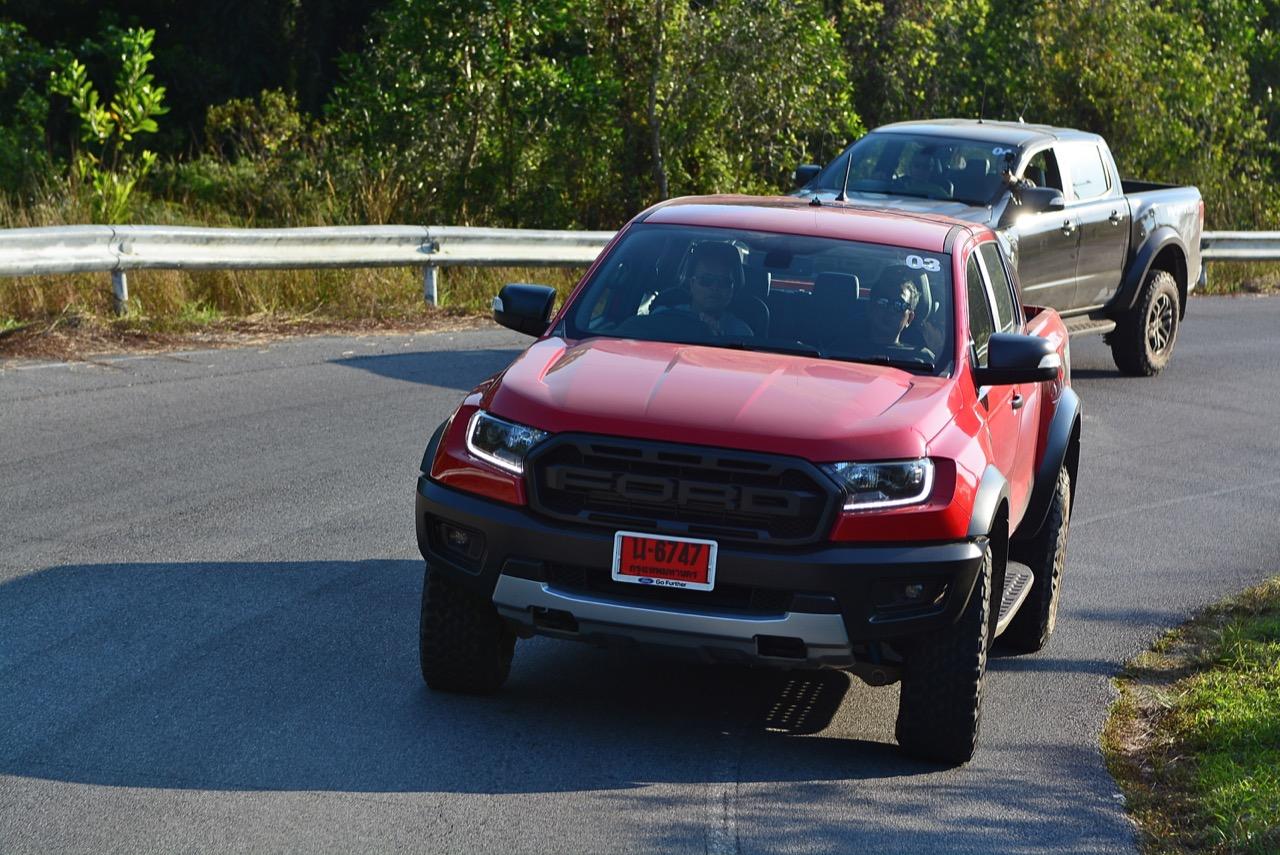 เกียร์ 10 สปีดกับโหมดขับเคลื่อน 2 ล้อหลังแบบ 2Hi ผลักดันเจ้า Raptor ไปตามเส้นทางที่คดเคี้ยวได้ดั่งใจ มันเป็นรถที่มีพวงมาลัยดีมาก โดยเฉพาะอัตราทดที่ขึ้นตรงกับโหมดและความเร็วที่ใช้ ขับช้าพวงมาลัยก็โอนอ่อนผ่อนคลาย พอหวดเร็วขึ้นพวงมาลัยไฟฟ้าจะปรับน้ำหนักแบบอัตโนมัติให้มีความกระชับรัดกุมเพื่อส่งถ่ายความแม่นยำ แค่ขยับพวงมาลัยนิดเดียวมันก็จะหันไปตามทิศทางที่คุณต้องการ ทำให้การควบคุมมีความง่ายดายไม่ต้องมานั่งแต่งนั่งขยับพวงมาลัยเหมือนรถกระบะบางรุ่น!
