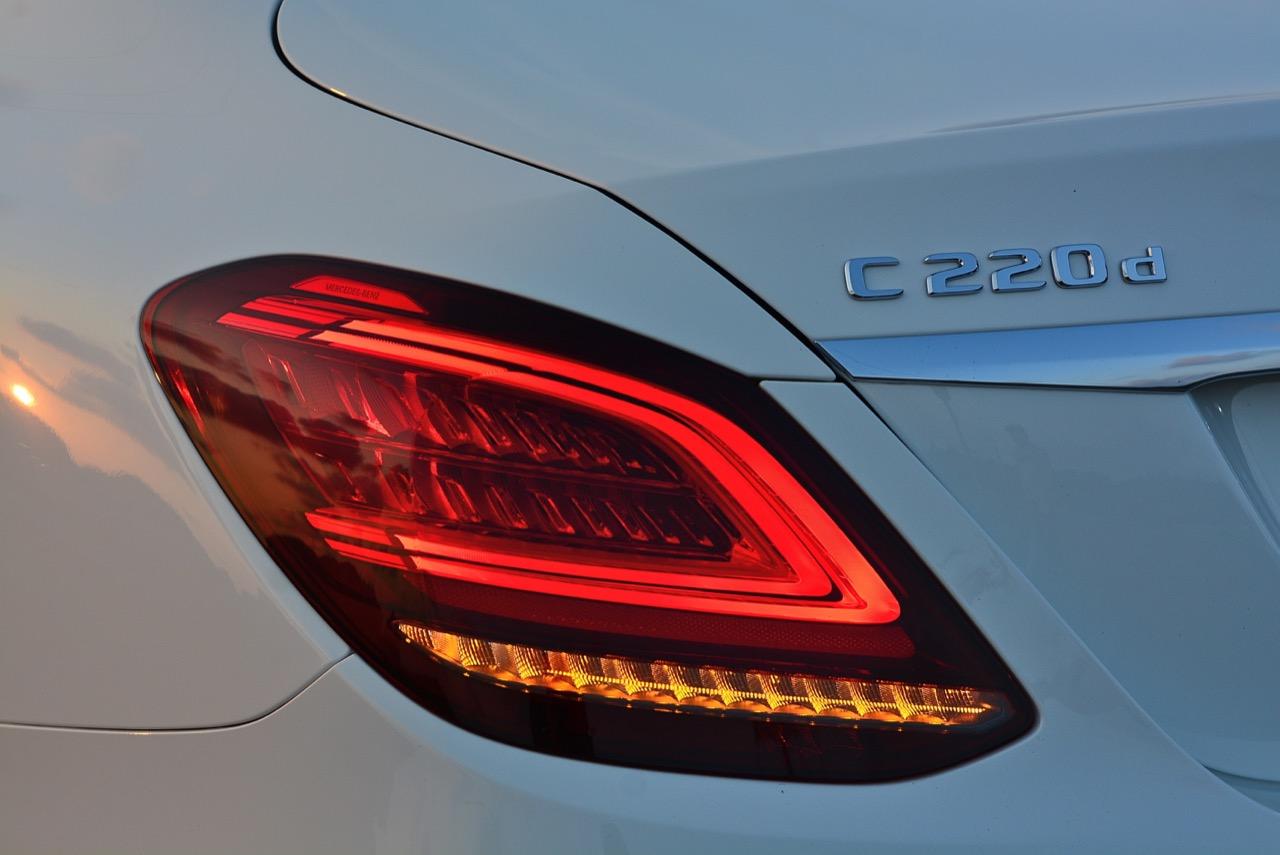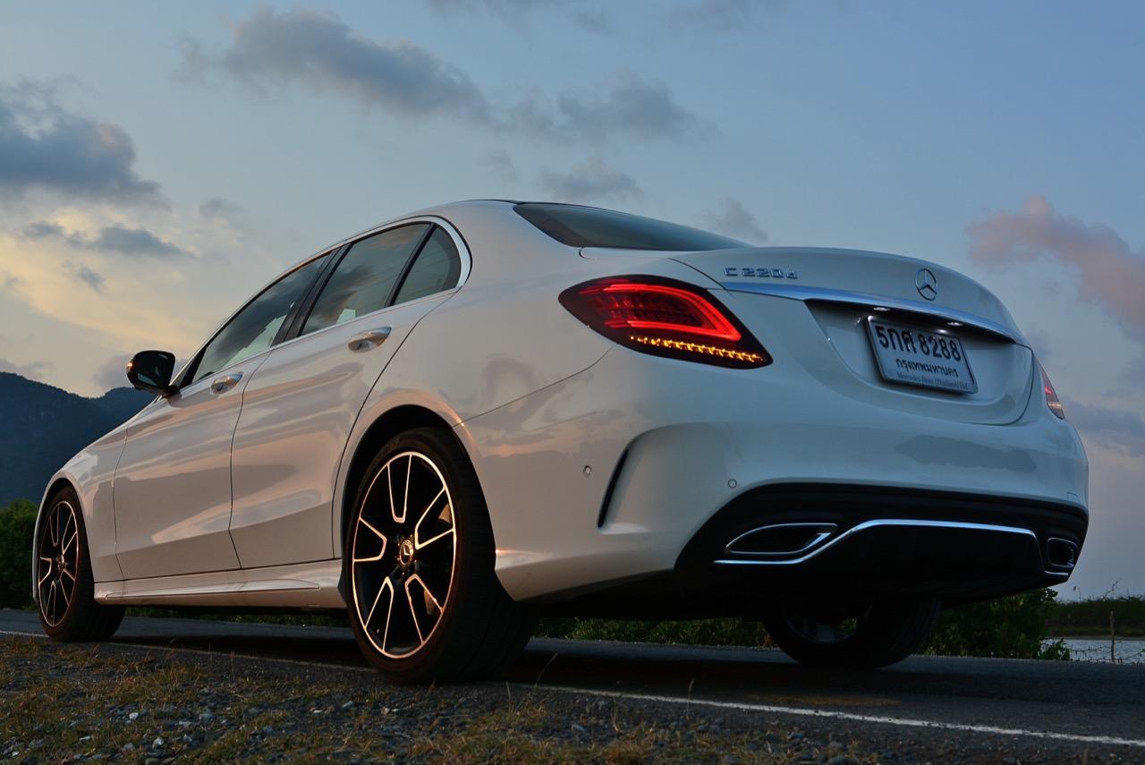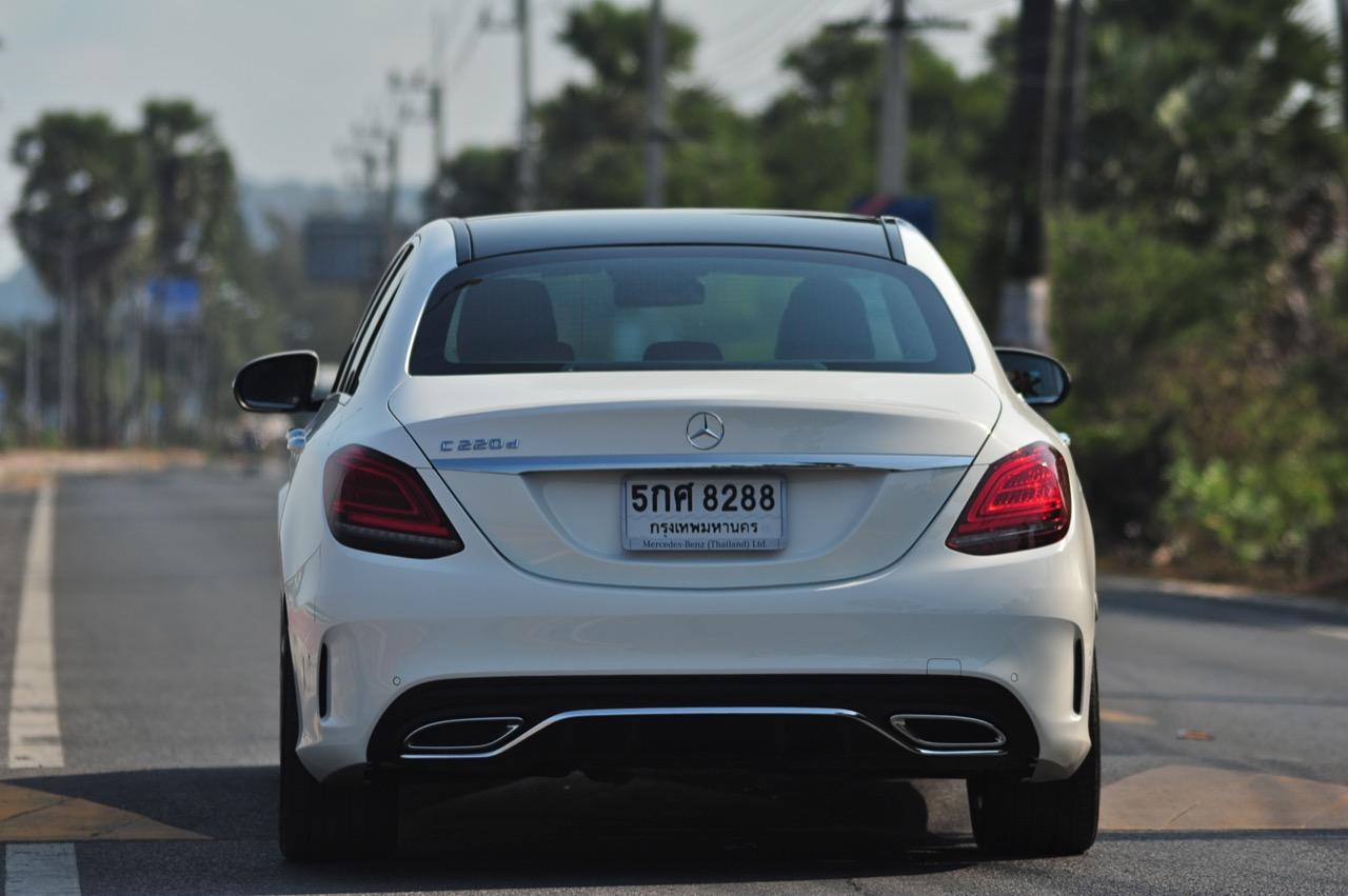 บั้นท้ายที่ลงตัวของ C-Class Minorchange เกิดจากความพยายามในการปรับรูปลักษณ์ให้มีความแตกต่าง แต่ใช้ความกลมกลืนลื่นไหลไปกับรูปทรงของตัวรถโดยเฉพาะตำแหน่งของฝาท้ายแบบ ครึ่งวงกลมที่สอดรับกับแนวโค้งของสปอยเลอร์หลังได้เป็นอย่างดี ล้ออัลลอย AMG ลายก้านขอบ 19 นิ้วในรุ่น C220d AMG Dynamic ใส่ยาง Continental Conti Sportcontact ไซส์ 225/40R19 Y XL ที่ล้อคู่หน้า ส่วนยางล้อหลังมีขนาดโตกว่าเล็กน้อยที่ 255/35R19 Y XL เนื่องจากเป็นล้อขับเคลื่อน มิติตัวถัง มีขนาดความยาว 4,686 มิลลิเมตร กว้าง 1,810 มิลลิเมตร สูง 1,442 มิลลิเมตร ฐานล้อ 2,840 มิลลิเมตร ระยะห่างล้อคู่หน้า 1,588 มิลลิเมตร หลัง 1,570 มิลลิเมตร