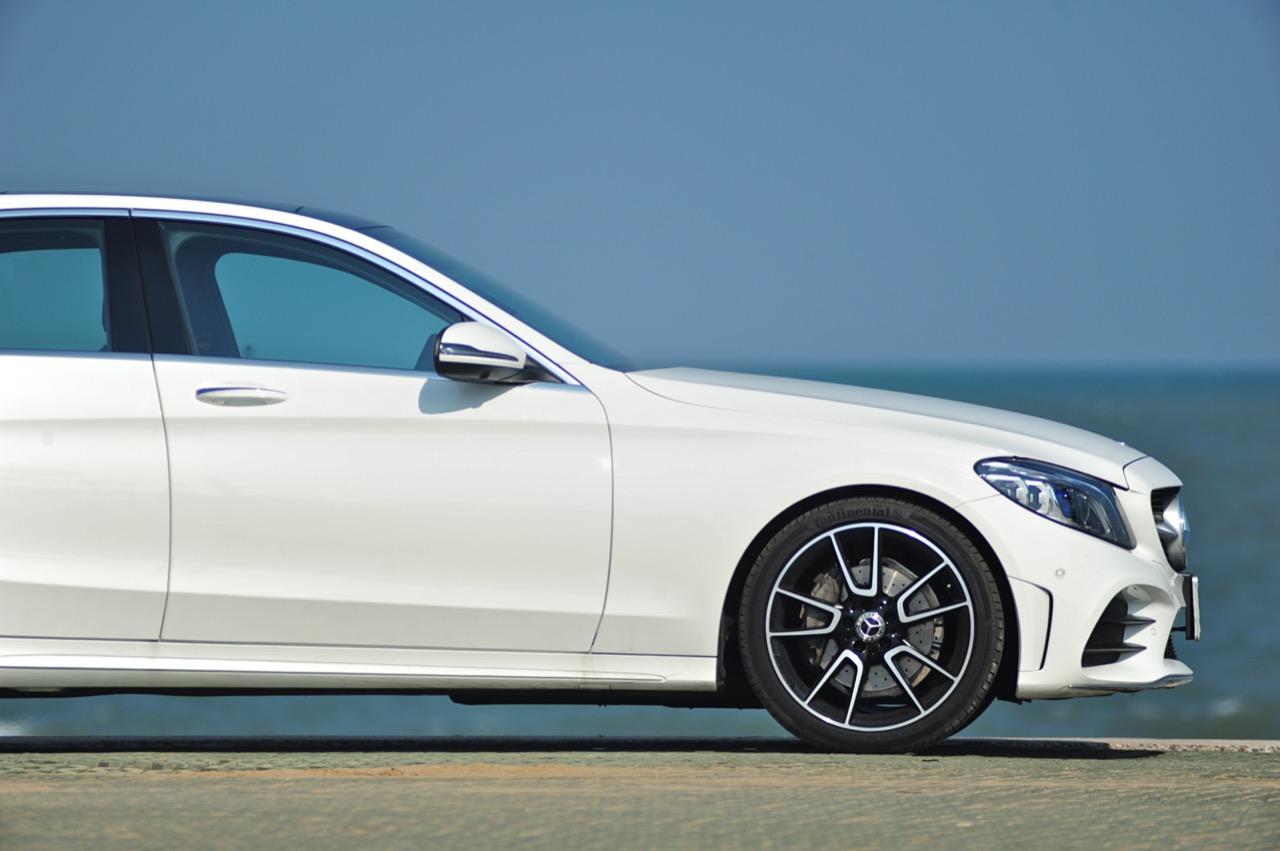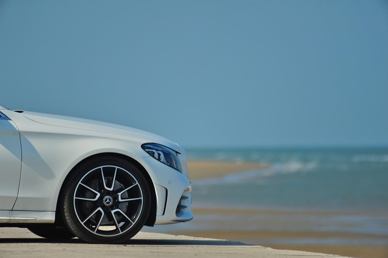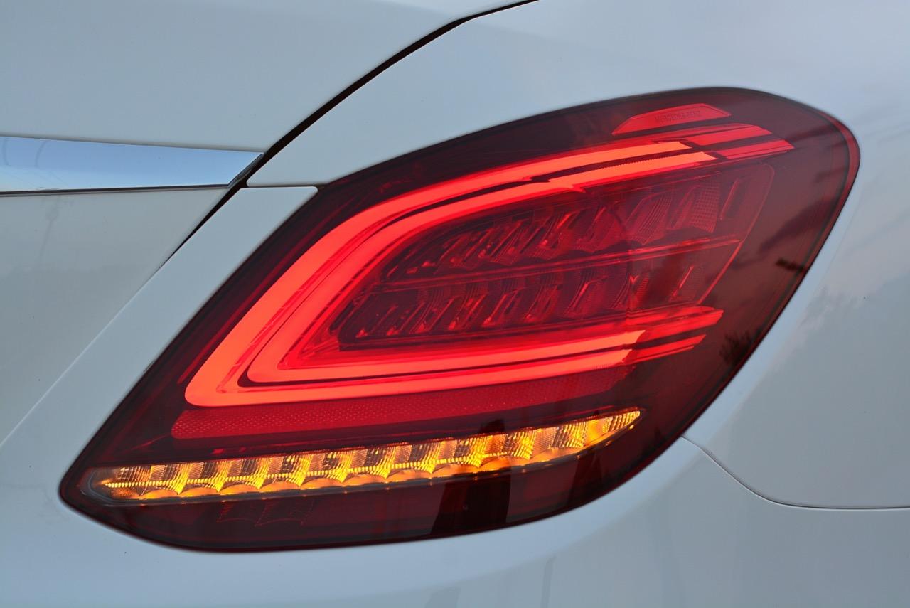 บั้นท้ายที่ลงตัวของ C-Class Minorchange เกิดจากความพยายามในการปรับรูปลักษณ์ให้มีความแตกต่าง แต่ใช้ความกลมกลืนลื่นไหลไปกับรูปทรงของตัวรถโดยเฉพาะตำแหน่งของฝาท้ายแบบ ครึ่งวงกลมที่สอดรับกับแนวโค้งของสปอยเลอร์หลังได้เป็นอย่างดี ล้ออัลลอย AMG ลายก้านขอบ 19 นิ้วในรุ่น C220d AMG Dynamic ใส่ยาง Continental Conti Sportcontact ไซส์ 225/40R19 Y XL ที่ล้อคู่หน้า ส่วนยางล้อหลังมีขนาดโตกว่าเล็กน้อยที่ 255/35R19 Y XL เนื่องจากเป็นล้อขับเคลื่อน มิติตัวถัง มีขนาดความยาว 4,686 มิลลิเมตร กว้าง 1,810 มิลลิเมตร สูง 1,442 มิลลิเมตร ฐานล้อ 2,840 มิลลิเมตร ระยะห่างล้อคู่หน้า 1,588 มิลลิเมตร หลัง 1,570 มิลลิเมตร