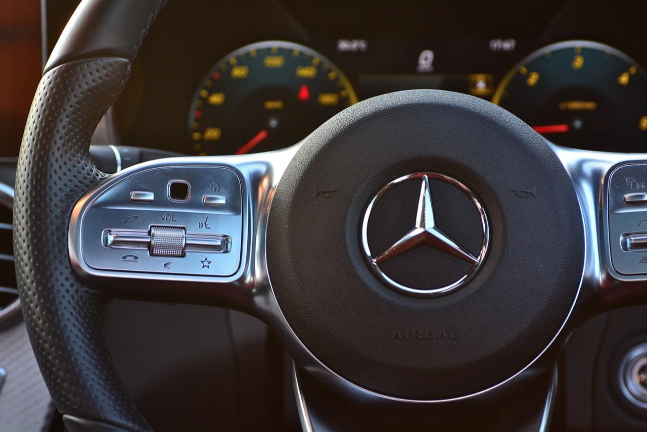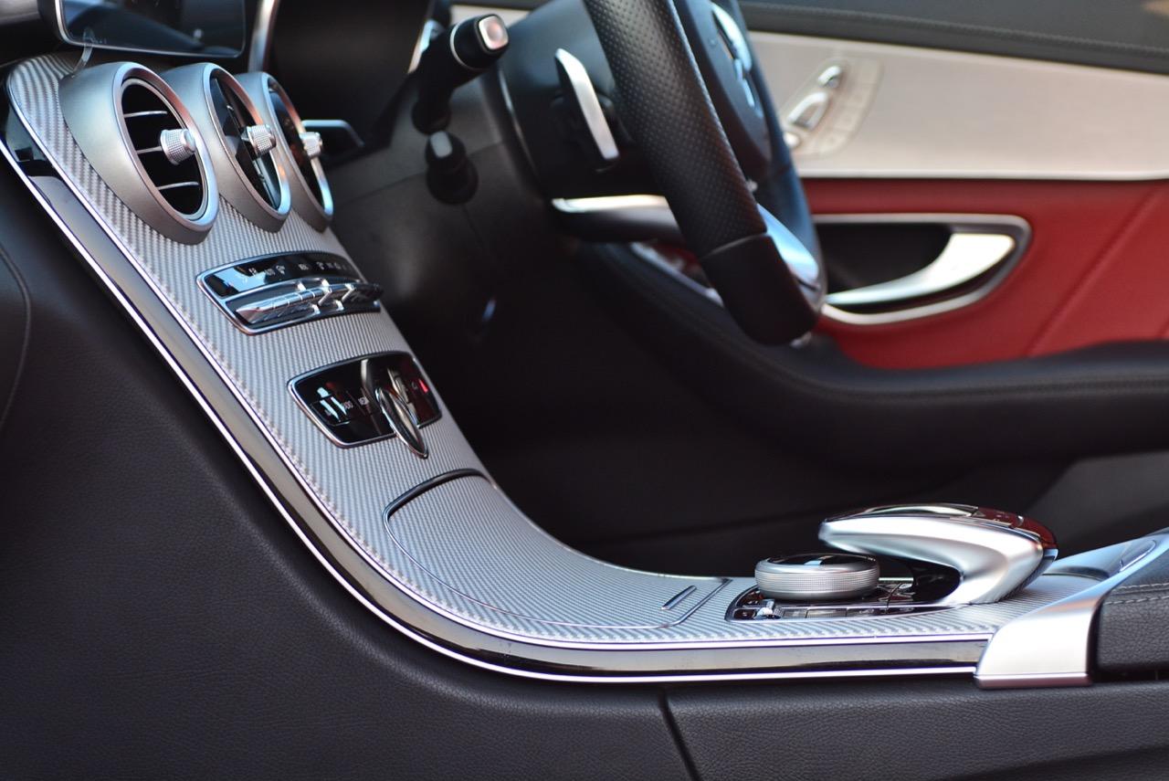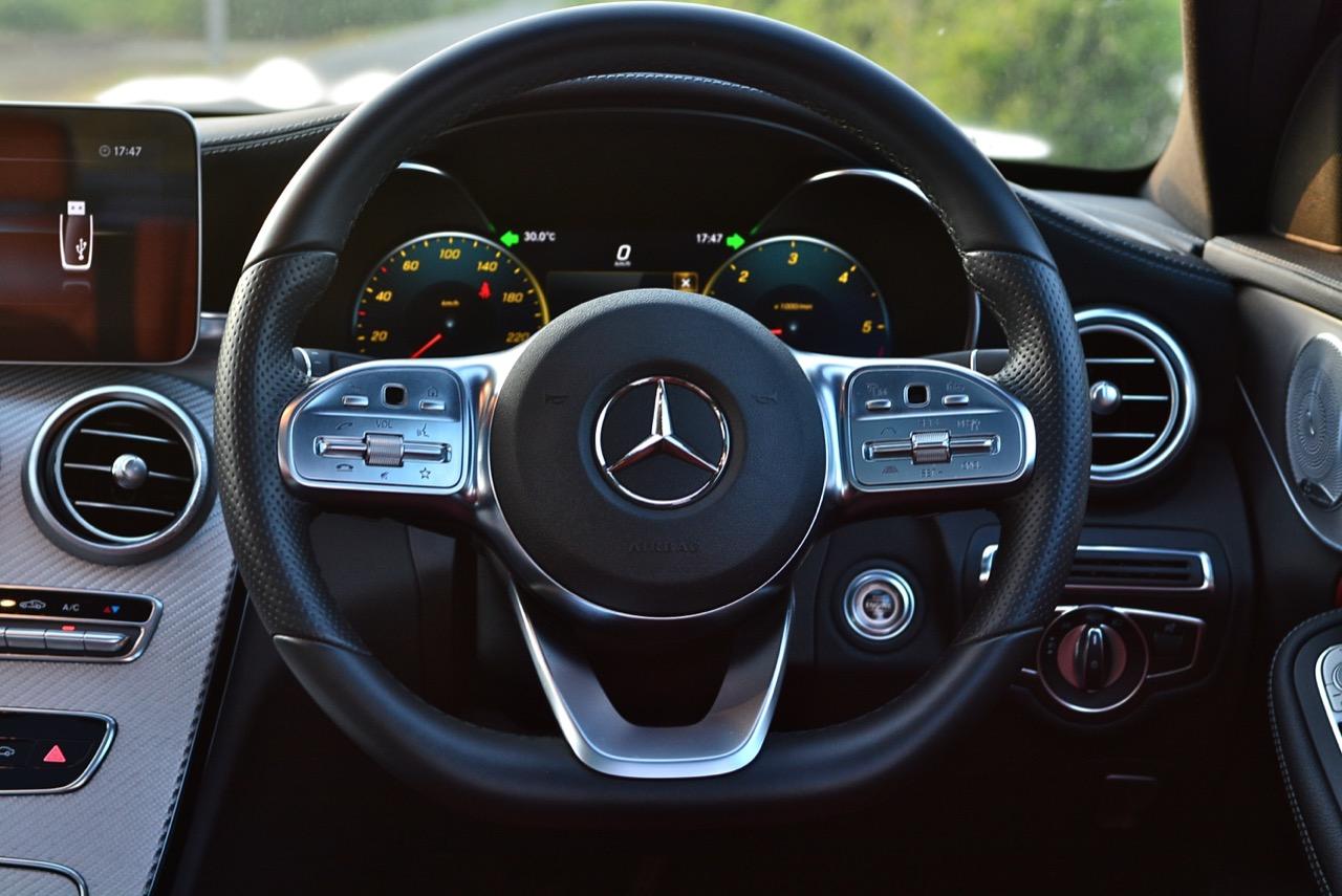 พวงมาลัยสปอร์ตแบบสามก้าน ทำจากอัลลอยหุ้มด้วยหนังแท้ มีสวิตช์ปรับตั้งอุปกรณ์ต่างๆ ติดตั้งมาให้เพื่อความสะดวกในการเข้าถึง ในรุ่น C220d AMG Dynamic ใช้พวงมาลัย 3 ก้านแบบใหม่หุ้มหนัง ส่วนรุ่น AMG C43 4-Matic ใช้พวงมาลัยแบบสปอร์ตจาก AMG ทรงฐานตัดหุ้มหนังกลับที่งดงาม พวงมาลัยของ C-Class Minor change ตกแต่งด้วยงานอะลูมิเนียมที่ละเอียดสวยงาม มีแป้นเปลี่ยนตำแหน่งเกียร์หรือ Paddle Shift ติดตั้งอยู่ด้านหลังเพื่ออำนวยความสะดวกให้กับผู้ขับเมื่อต้องการปรับเปลี่ยนอัตราทดด้วยตัวเอง