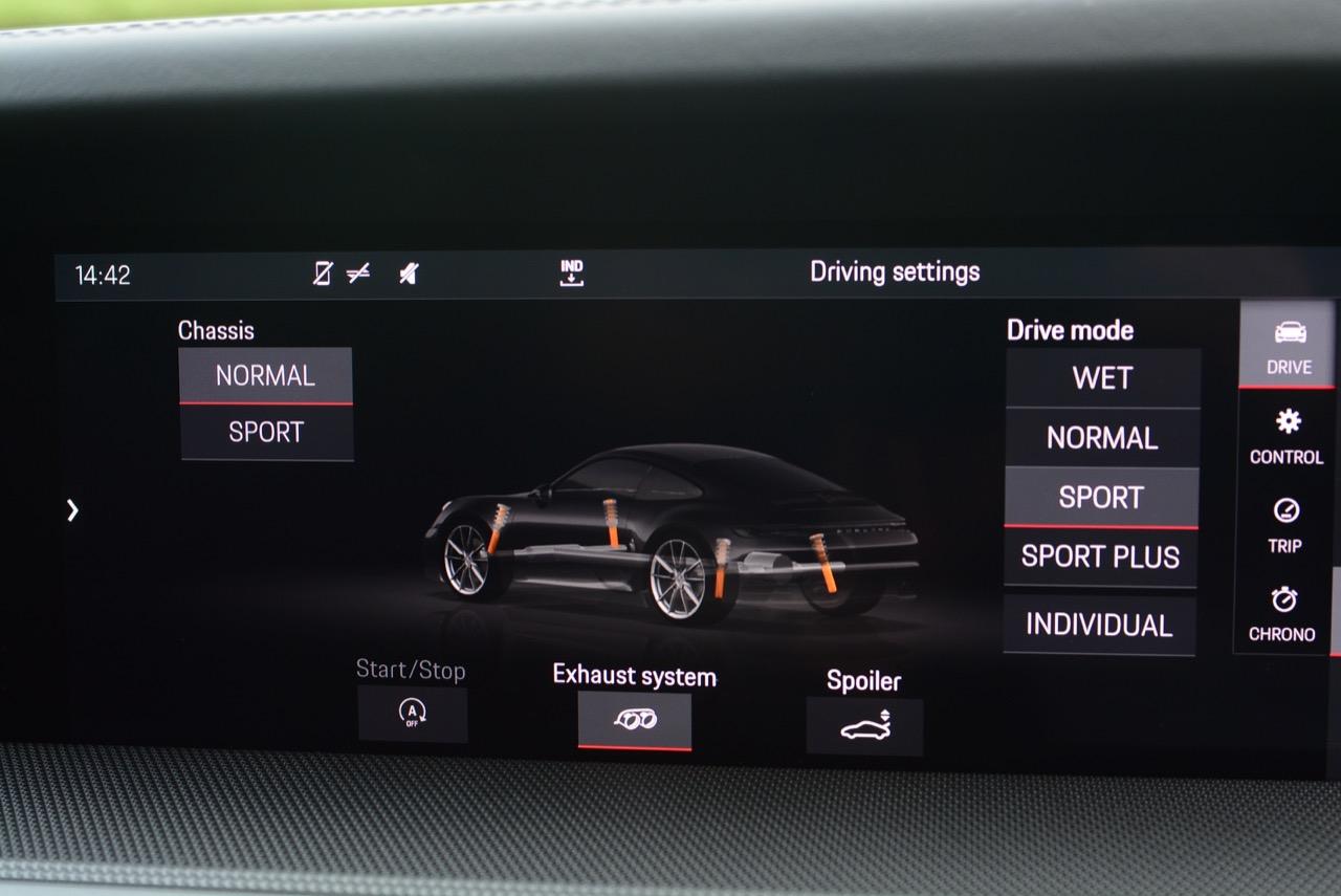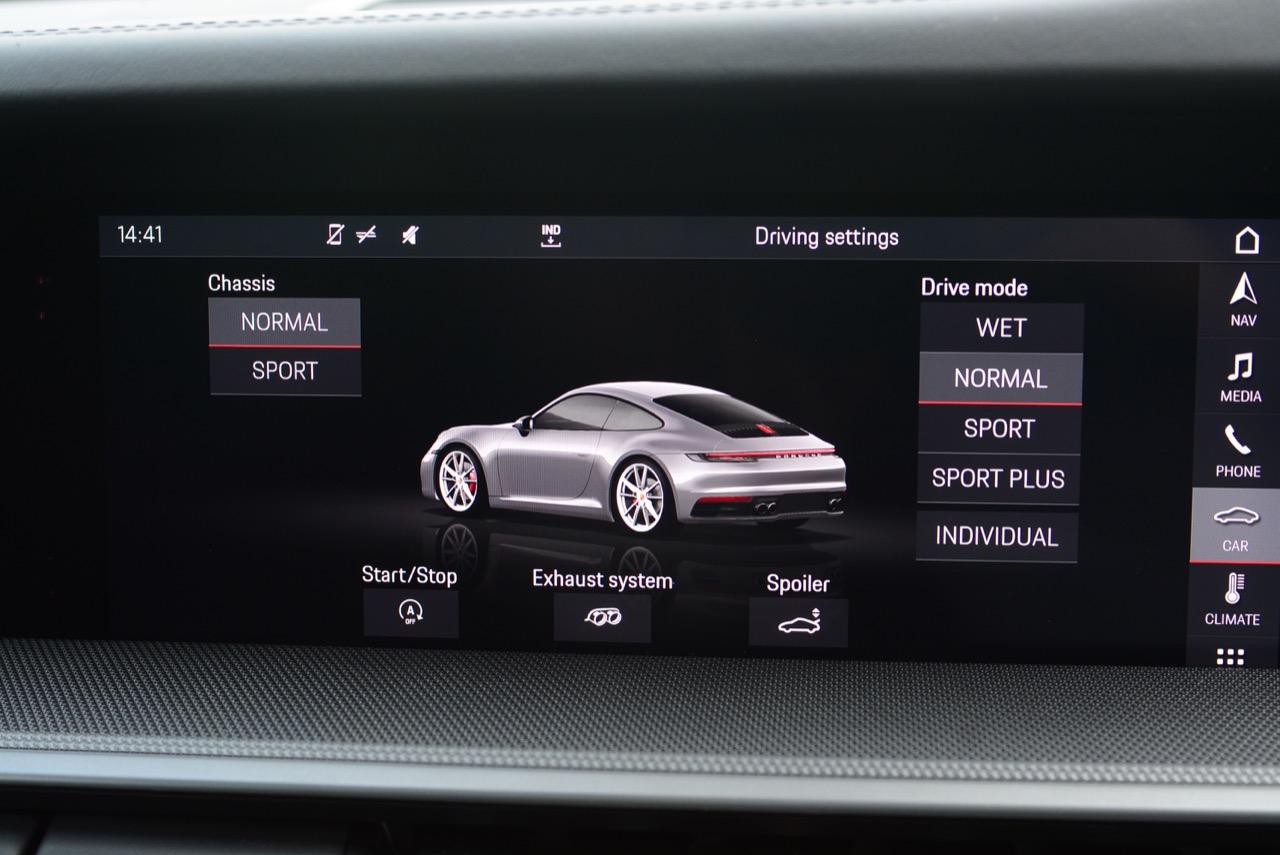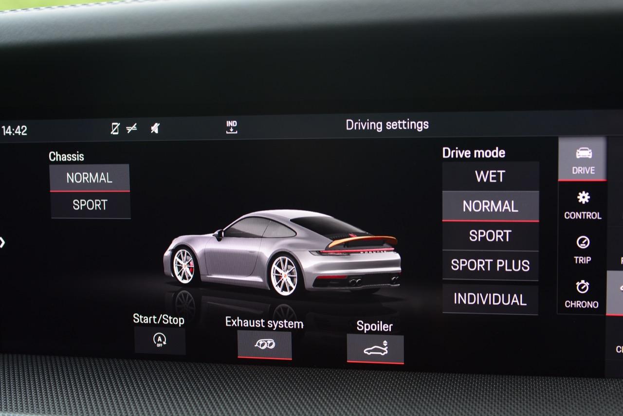 Porsche Dynamic Chassis Control ช่วยลดอาการโคลงตัวได้ดีขึ้นมาก เมื่อเลือกโหมด Sport + ทั้งระบบไม่ว่าจะเป็นแท่นเครื่องแบบพิเศษกับกันโคลงไฮดรอลิกจะทำงานหนักหน่วงขึ้นโดยรับรู้ได้จากความกระฉับกระเฉงของรถที่เพิ่มมากขึ้น ส่วนท้ายของ Carrera 4S จะแน่นและเกาะมากขึ้นแม้จะสบัดพวงมาลัยท้ายก็ยังไม่ยอมแถออกด้านข้าง ซึ่งเป็นเรื่องที่ดีมากสำหรับมือใหม่ที่ควบคุมจักรกลบ้าพลังแบบนี้บนเส้นทางสาธารณะ ทำให้ Porache 911 Carrera 4S มีอาการที่เป็นกลางคล้ายรถเครื่องวางกลางลำตัว ทั้งๆ ที่เป็นรถเครื่องวางท้ายซึ่งในอดีตนั้นรถทรงกบอย่าง 911 ยุคแรกเป็นรถที่ควบคุมอาการในโค้งได้ยากเย็นแสนเข็ญยี่ห้อหนึ่งของโลก Porsche 911/992 Carrera 4S ให้ความรู้สึกที่ลื่นไหลเป็นธรรมชาติและยึดเกาะกับถนนได้อย่างแนบสนิท โหมด Sport + มอบคันเร่งที่ไวราวกับ 911 GT3 พร้อมกับการตอบสนองของเกียร์ที่รวดเร็วเหลือเชื่อ มันทำงานได้อย่างน่าประทับใจและจะดีกว่านี้มากถ้าขับอยู่บนไฮเวย์ที่ไม่มีการจำกัดความเร็วอย่างออโต้บาร์นในเยอรมนี