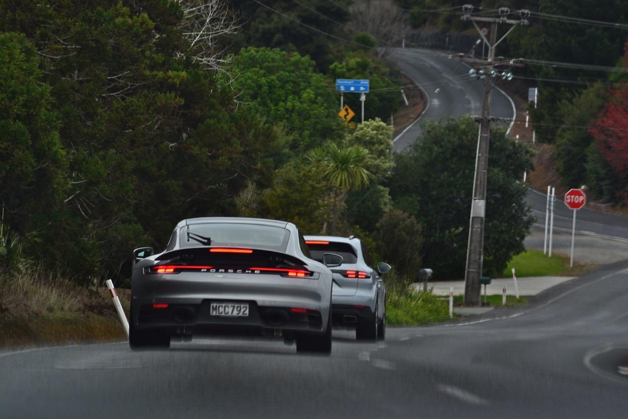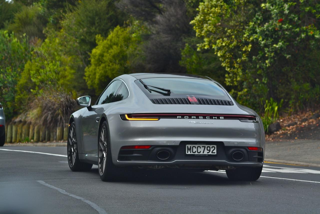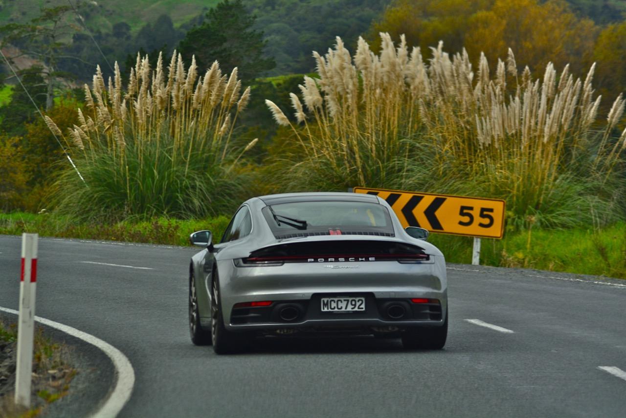 ผมชอบช่วงล่าง Adaptive ของ 911/992 ไม่ว่าจะเป็น Carrera S หรือ 4S มันถูกควบคุมด้วยซอฟต์แวร์ใหม่ล่าสุด PASM dampers featuring new technology เซนเซอร์ที่คอยตรวจจับและปรับความแข็ง-อ่อนของโช้คอัพช่วยทำให้ Carrera S และ 4S มีความเสถียรท่ามกลางเส้นทางที่คดเคี้ยววกไปวนมารอบๆ หุบเขานอกเมืองอ็อคแลนด์ ครั้งแรกกับการขับ 911 รุ่นใหม่บนแผ่นดินกีวีเปิดโอกาสให้ผมและเพื่อนๆ สื่อมวนชนได้สัมผัสกับกบรุ่นล่าสุดอย่างเต็มที่แค่ระวังเรื่องความเร็วและการรักษากฎจราจรอันเข้มงวด เจ้า Carrera S ทะยานผ่านโค้งแปลกๆ ราวกับลูกธนูพุ่งออกจากคัน ระบบส่งกำลังที่ปรับเปลี่ยนใหม่ทำให้การขับบนเส้นทางภูเขามีความเร้าใจเพิ่มมากขึ้น เมื่อใช้โหมดSport + เกียร์จะเข้าสู่โหมดแมนนวลโดยอัตโนมัติ แป้น Paddle ถูกใช้งานโดยเปลี่ยนเกียร์ขึ้นลงแค่เกียร์ 2 และเกียร์ 3 เนื่องจากอุดมไปด้วยทางโค้งขึ้นลงเนินเขา การเบรกก่อนถึงหัวโค้ง เปลี่ยนเกียร์ลงต่ำแล้วหักพวงมาลัยเลี้ยงคันเร่งเพื่อรอเข้าสู่ปลายโค้ง กดคันเร่งส่งแล้วเปลี่ยนเกียร์ไปตามรอบเครื่องยนต์เมื่อพ้นออกจากส่วนปลายของโค้งมุมกว้าง เจ้า 911 รุ่นใหม่ทำตามอย่างว่านอนสอนง่าย พอเจอเข้ากับทางตรงก็กดคันเร่งส่งได้ไม่มากเนื่องจากกล้องตรวจจับความเร็วที่มีอยู่ทั่วทุกหัวระแหงกับรถตำรวจทางหลวงที่คอยจอดซุ่มดูพฤติกรรมการขับของคนที่ชอบขับรถเร็ว การขับในเมืองต่างแดนที่มีการบังคับใช้กฎหมายควบคุมการใช้ความเร็วอย่างเข้มงวดและมีค่าปรับแพงกว่าประเทศไทยหลายสิบเท่า ทำให้ผมและทีมผู้สื่อข่าวได้แค่ขับไหลไปเรื่อยๆ และใช้บางจังหวะในโค้งสร้างความสนุกได้บ้างเป็นบางครั้งบางคราวเท่านั้น