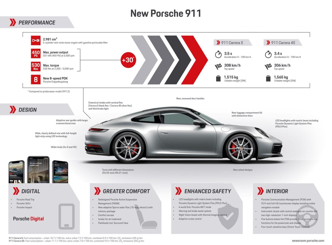 Porsche 911 แม้จะเป็นรถสปอร์ตที่สร้างตำนานและประวัติศาสตร์ให้กับ Porsche แต่มันกลับไม่ใช่รุ่นรถที่ขายดีที่สุด รถสปอร์ตรุ่น 911 กลายเป็นประวัติศาสตร์ของแบรนด์รถยนต์เยอรมันที่สืบทอดตำนานแห่งความเร็วและชัยชนะบนสนามแข่งรถยาวนานถึง 60 ปี Porsche 911/992 รุ่นใหม่ เป็นรถสปอร์ตในเจนเนอเรชั่นที่ 8 ซึ่งถูกปรับปรุงให้ดีขึ้นทุกจุดไม่ว่าจะเป็นการขับหรือระบบต่างๆ ที่คอยอำนวยความสะดวกสบาย รองรับการขับใช้งานในชีวิตประจำวัน รหัสตัวถัง 992 เติมเต็มงานวิศวกรรมยานยนต์ที่ก้าวล้ำทั้งในเรื่องวัสดุศาสตร์ การลดน้ำหนัก ขุมกำลังที่ถูกปรับจูนใหม่ในด้านวงจรการทำงานของระบบอัดอากาศ เปลี่ยนแปลงระบบจ่ายเชื้อเพลิง ย้ายตำแหน่งของยางแท่นเครื่องใหม่หมดและเปลี่ยนชุดส่งกำลังแบบ PDK จาก 7 สปีดมาเป็นเกียร์ PDK ใหม่แบบ 8 สปีด ระบบขับเคลื่อน PTM และชุดควบคุมเสถียรภาพ PASM สอดรับกับสมรรถนะในการวิ่งบนถนนที่เปียกชื้นด้วย Wet Mode