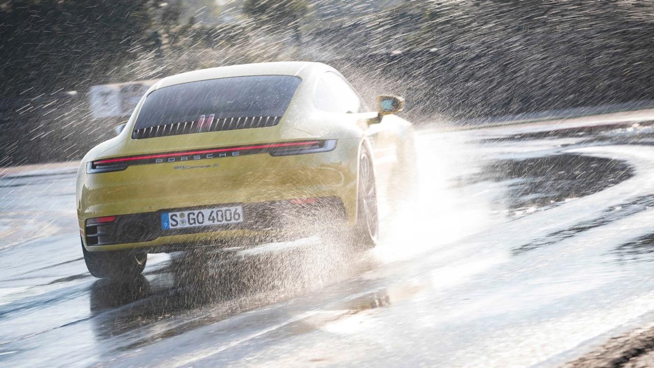เมื่อขับเคลื่อนท่ามกลางสภาพผิวถนนที่เปียกลื่น Wet mode ของ 911/992 ถูกออกแบบให้ช่วยสร้างความปลอดภัยลดอาการลื่นไถลเมื่อต้องขับตอนฝนตกถนนลื่น ระบบติดตั้งเซนเซอร์คอยตรวจจับปริมาณของน้ำฝน เมื่อพบว่าผิวถนนมีน้ำเจิ่งนองและอาจทำให้เกิดอาการลื่นไถล ระบบจะส่งสัญญาณแจ้งเตือนให้คนขับปรับเข้าสู่ Wet mode ด้วยการกดปุ่มสั่งงานบนพวงมาลัย ECU ของ Wet mode จะเข้าควบคุมเครื่องยนต์ การทำงานของระบบเกียร์ PDK ระบบขับเคลื่อน PTM และระบบ PTV Plus ระบบช่วยทรงตัว PSM จนถึง Adaptive Aerodynamics ที่จะปรับพื้นผิวของตัวรถเพื่อสร้างแรงกดและช่วยลดอาการเหินน้ำในย่านความเร็วสูง