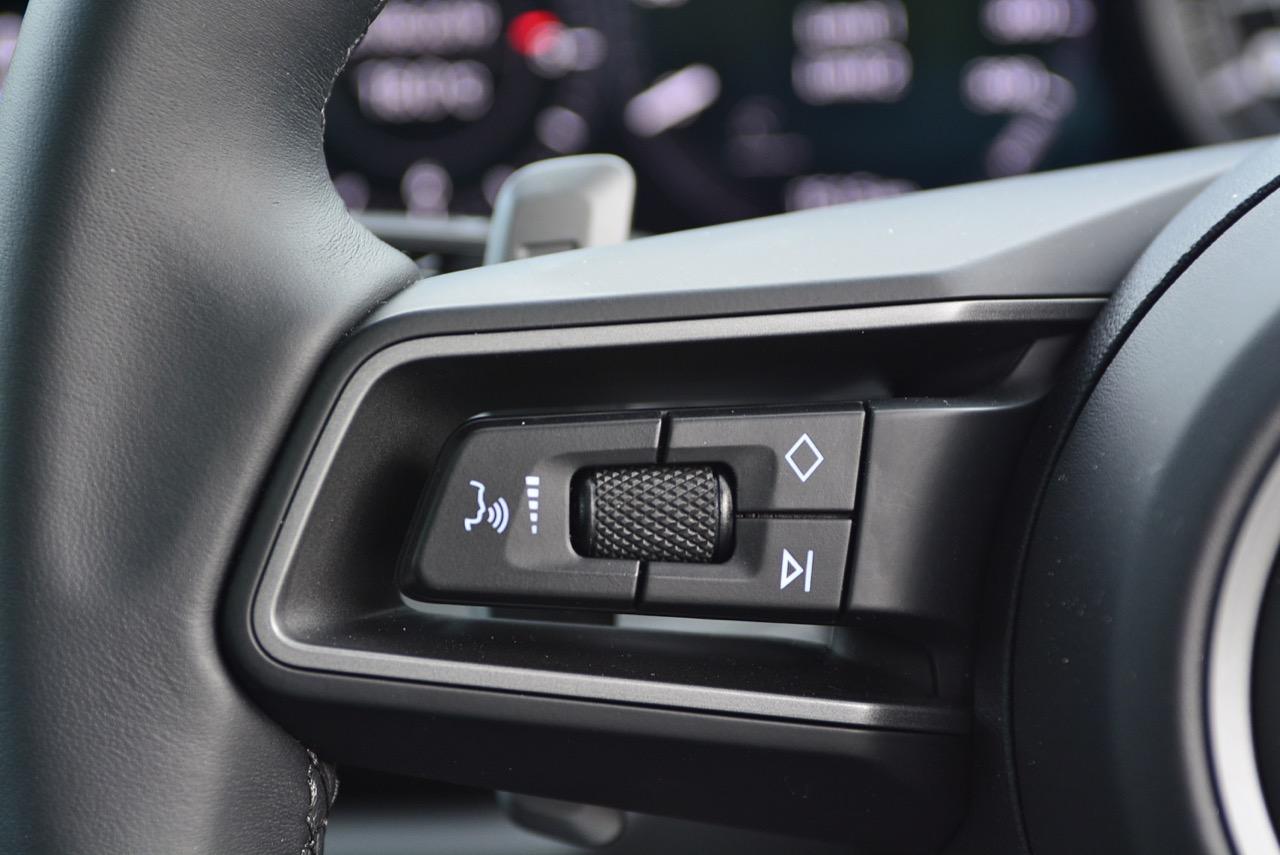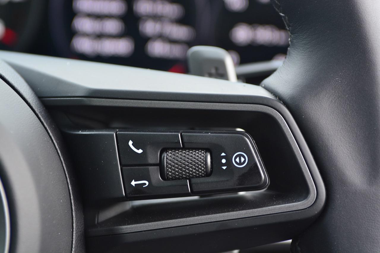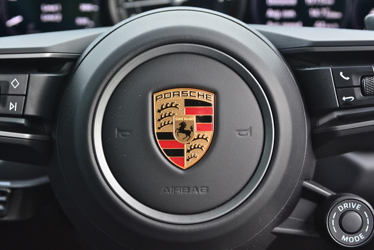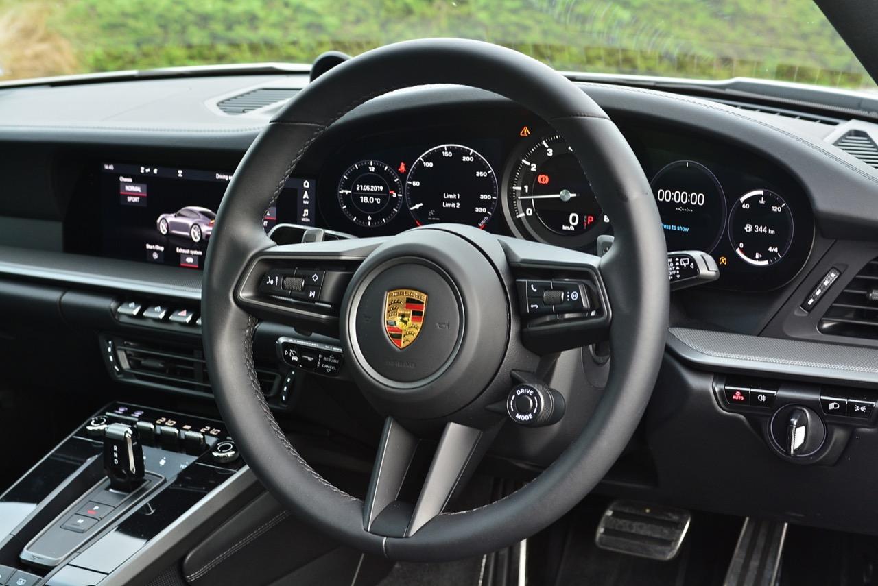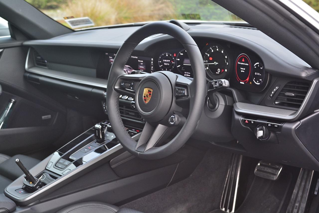 อุปกรณ์ที่คนขับหรือเจ้าของจะต้องยึดจับตลอดเวลาและถือว่ามีความสำคัญสูงสุดในการเปลี่ยนทิศทางของรถก็คือพวงมาลัย Porsche 911/992 Carrera S มาพร้อมกับพวงมาลัยแบบสปอร์ตสามก้านติดตั้งสวิตช์มัลติฟังก์ชั่นไว้สั่งงาน หลังวงพวงมาลัยติดแป้นเปลี่ยนเกียร์ Paddle Shift สีเงิน ด้านขวาของพวงมาลัยมีสวิตช์ Drive mode เพื่อความเร็วในการปรับเปลี่ยนโหมดขับเคลื่อน ปุ่มรับหรือวางสายโทรศัพท์บลูทูธ ปุ่มสั่งงานด้วยเสียงรวมถึงปุ่มควบคุมความดังของลำโพงติดรถ ทรงกลมของพวงมาลัยหุ้มหนังแท้จับได้อย่างกระชับมือและสามารถปรับตั้งได้ถึง 4 ทิศทางด้วยระบบไฟฟ้า