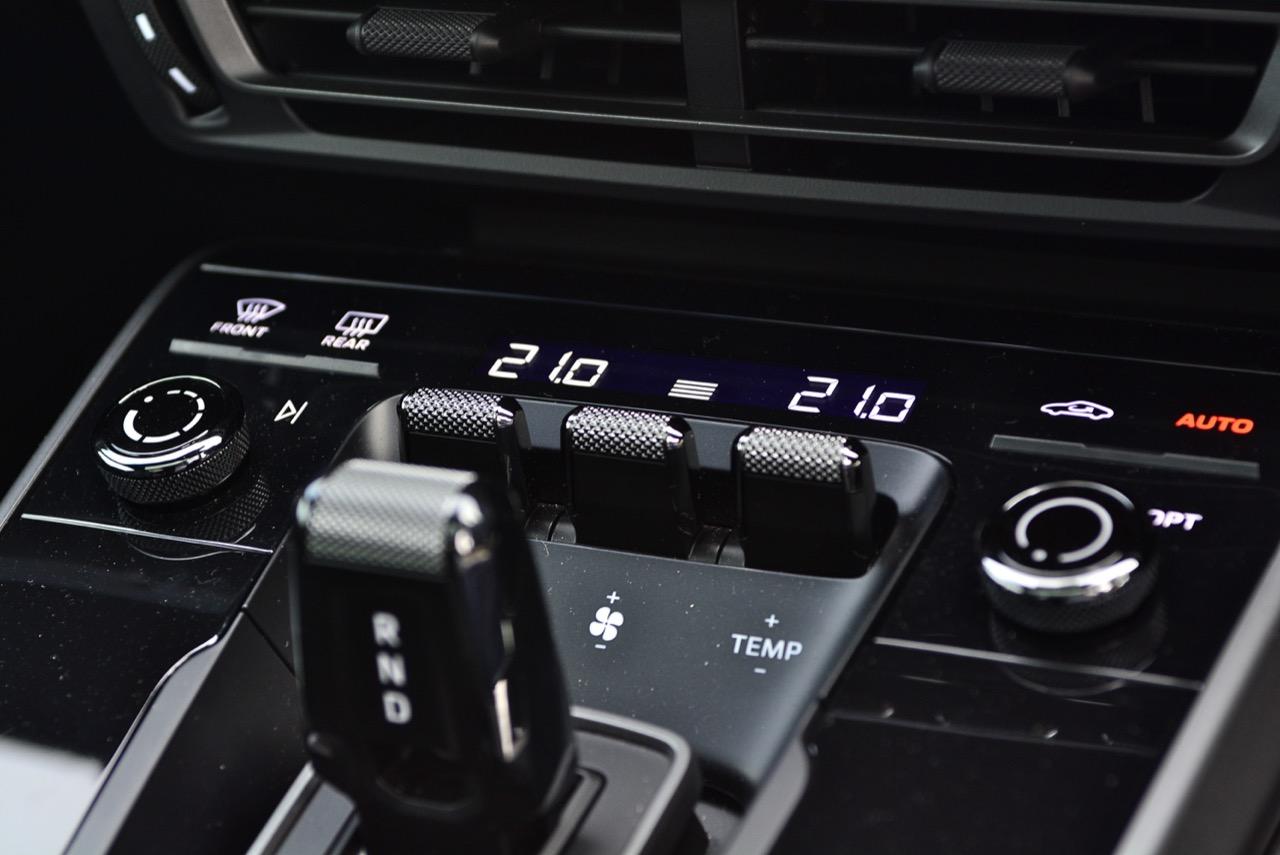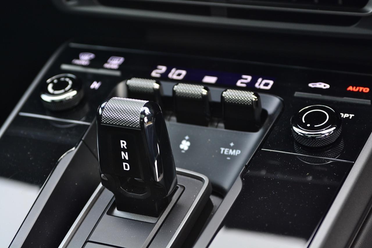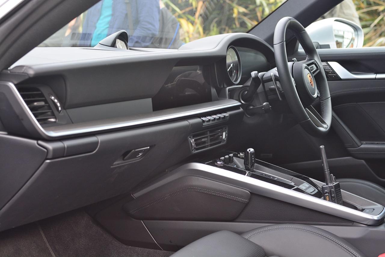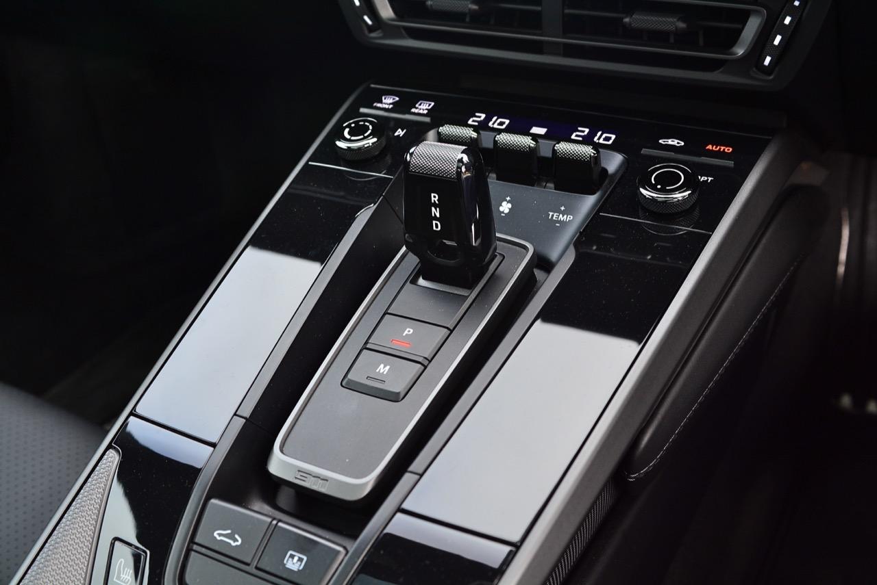 ซุ้มเกียร์ออกแบบใหม่ใช้เป็นจุดที่กั้นระหว่างผู้โดยสารกับคนขับแยกออกจากกันอย่างชัดเจน ซุ้มเกียร์ทำจากพลาสติกสีดำเงา มีปุ่มปรับเสียงและปุ่มควบคุมอุณหภูมิของระบบปรับอากาศแบบ 2 Zone ก้านคันเกียร์เล็กจิ๋วแต่ใช้งานได้อย่างสะดวก แค่กดเข้าหาตัวคนขับก็จะปรับเข้าตำแหน่ง D ทันที เมื่อดันคันเกียร์ไปข้างหน้าก็จะเข้าตำแหน่ง N ดันอีกทีจะเป็นตำแหน่ง R หรือเกียร์ถอย ส่วนเกียร์จอดหรือ P กับโหมดแมนนวลใช้กดปุ่มลงไปที่ตัวอักษร P หรือ M เกียร์ PDK 8 สปีดเป็นระบบส่งกำลังแบบทวินคลัตช์ที่ปรับเปลี่ยนเกียร์ได้อย่างรวดเร็วและแม่นยำไม่ว่าจะคาอยู่ในโหมด Auto หรือ Manual เป็นชุดส่งกำลังที่ติดตั้งอยู่ใน 911/992 Carrera S รุ่นขับเคลื่อน 2 ล้อหลังและ Carrera 4S รุ่นขับเคลื่อน 4 ล้อ