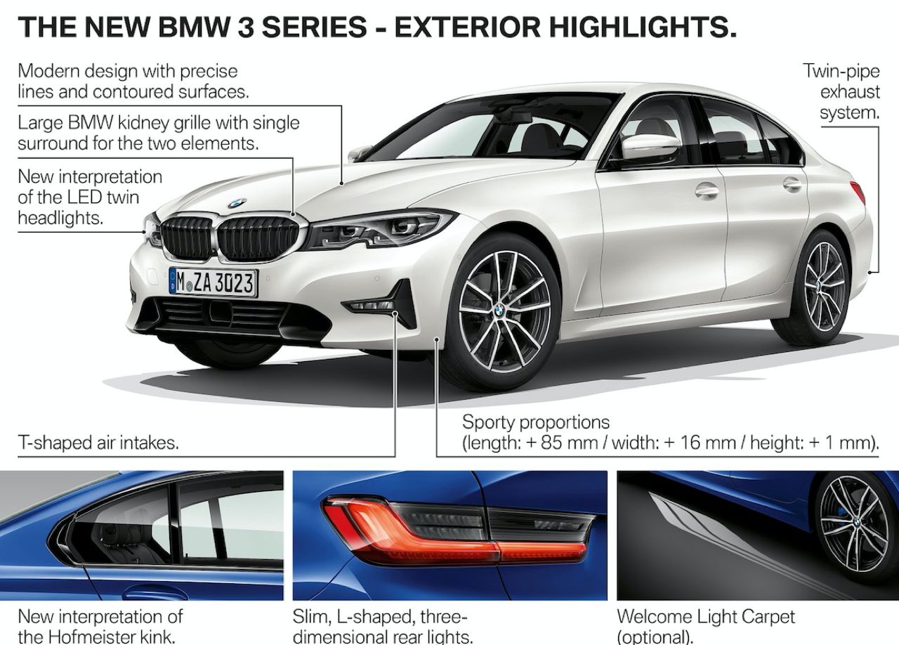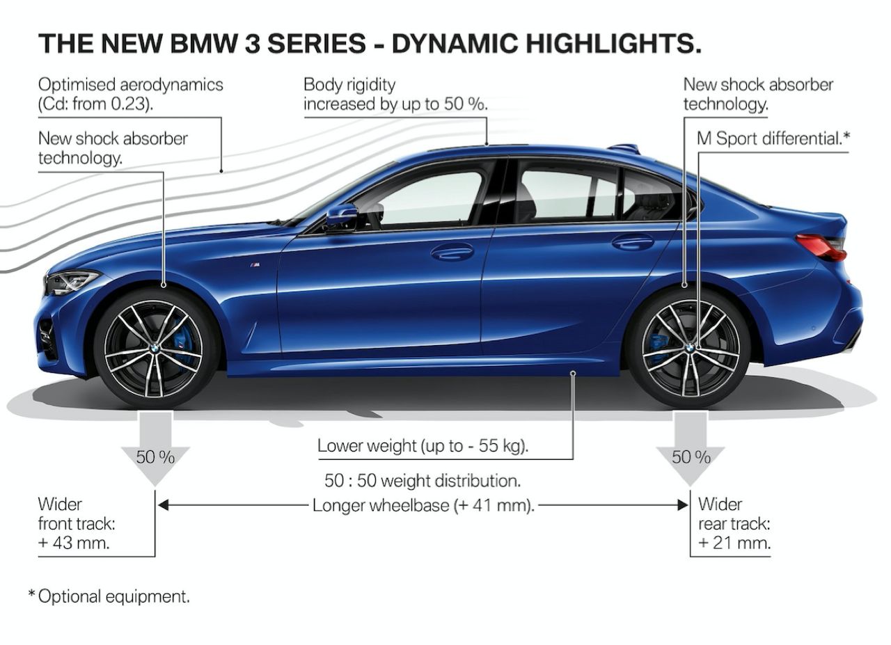 การต่อสู้ครั้งสำคัญของ BMW ทำให้ New Series-3 ต้องมีทั้งความหรูหราและขับได้ดีสมกับที่เป็นรถรุ่นขายดีของ BMW ซึ่งลูกค้าที่ซื้อ Series-3 มีความคาดหวังสูงมาก น้ำหนักตัวที่ลดลง 55 กิโลกรัม แต่มิติตัวถังมีขนาดที่ใหญ่ขึ้นคือ เรื่องที่มีความขัดแย้งกันสำหรับงานวิศวกรรมยานยนต์สมัยใหม่ BMW 320d Sport G20 มีความยาว 4,709 มิลลิเมตร ยาวขึ้น 76 มิลลิเมตร เมื่อเทียบกับ Series-3 320d F30 รุ่นที่แล้วซึ่งมีความยาว 4,624 มิลลิเมตร สัดส่วนความกว้างของ 320d G20 อยู่ที่ 1,827 มิลลิเมตร กว้างกว่า 320d F30 16 มิลลิเมตร ซึ่ง320d F30 มีความกว้างแค่ 1,811 มิลลิเมตร สำหรับความสูงของ 320d G20 อยู่ที่ 1,435 มิลลิเมตร สูงกว่ารถรุ่นพี่อย่าง 320d F30 6 มิลลิเมตร ขนาดของตัวถังที่ใหญ่ขึ้นผนวกกับฐานล้อที่ยาวขึ้นทำให้พื้นที่ห้องโดยสารของ New Series-3 G20 มีขนาดที่เกือบจะเท่ากับรถรุ่นพี่อย่าง Series-5 G30 เลยทีเดียวโดยเฉพาะพื้นที่เบาะคู่หน้าที่กว้างมากๆ ส่วนล้อและยางของ 320d Sport G20 ใส่ล้ออัลลอยลาย V-Spoke No. 780 สี Bicolour Orbit Grey ขอบ 18 นิ้ว ขนาด 7.5Jx18 ยางสปอร์ตยี่ห้อ Pirelli Cinturato P7 ไซล์ 225/45R18 เท่ากันทั้งสี่ล้อ