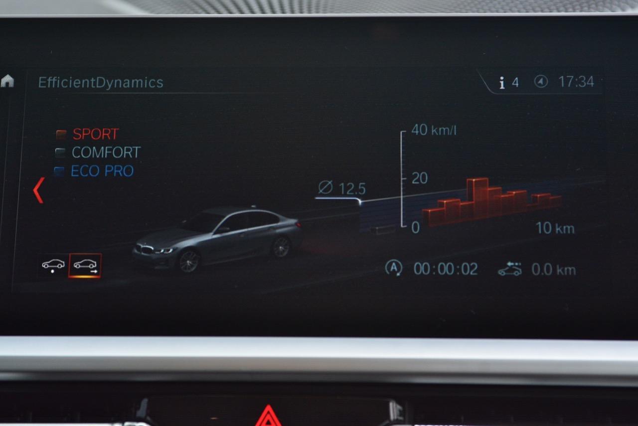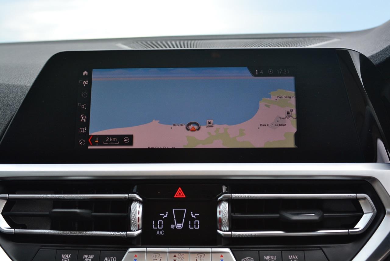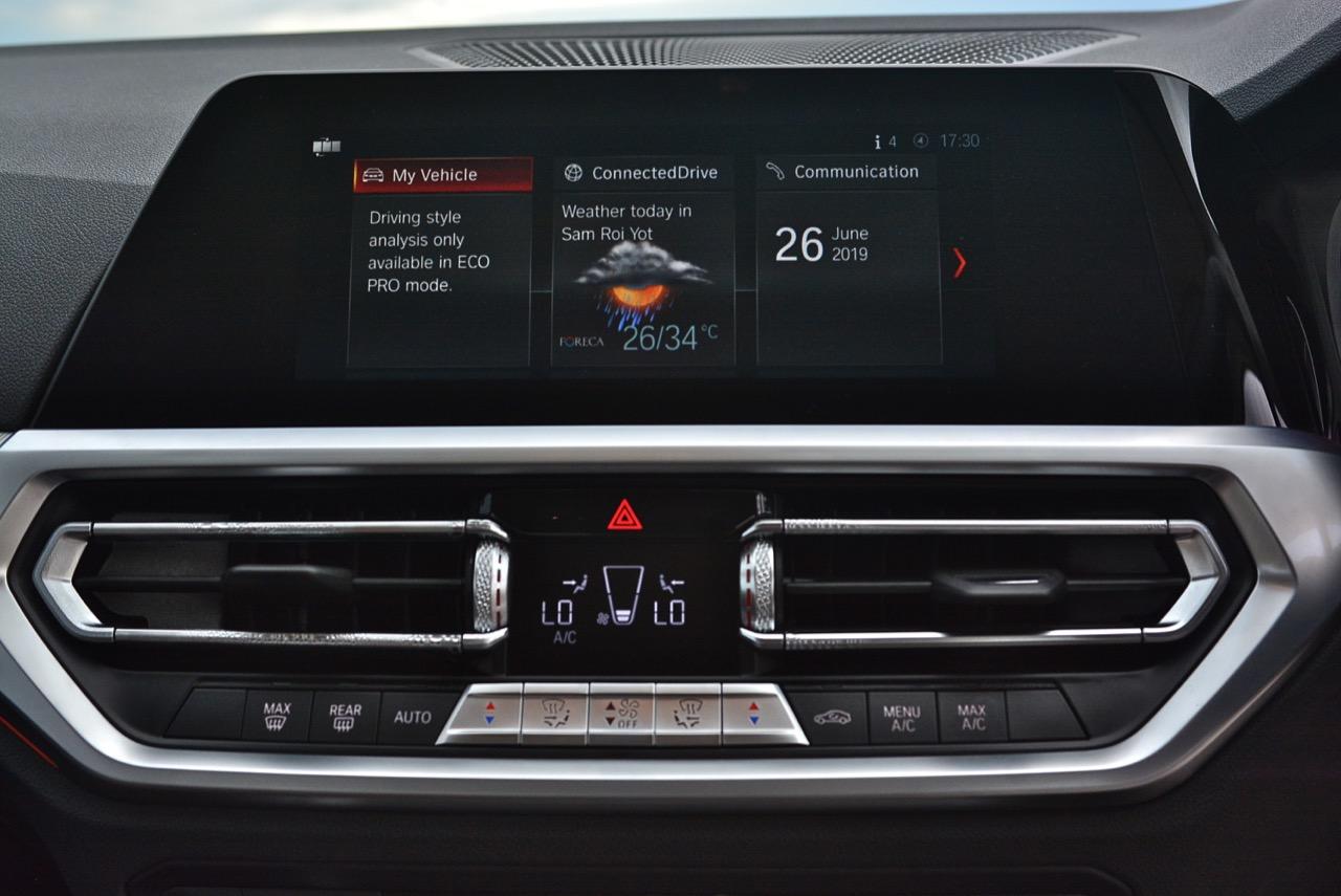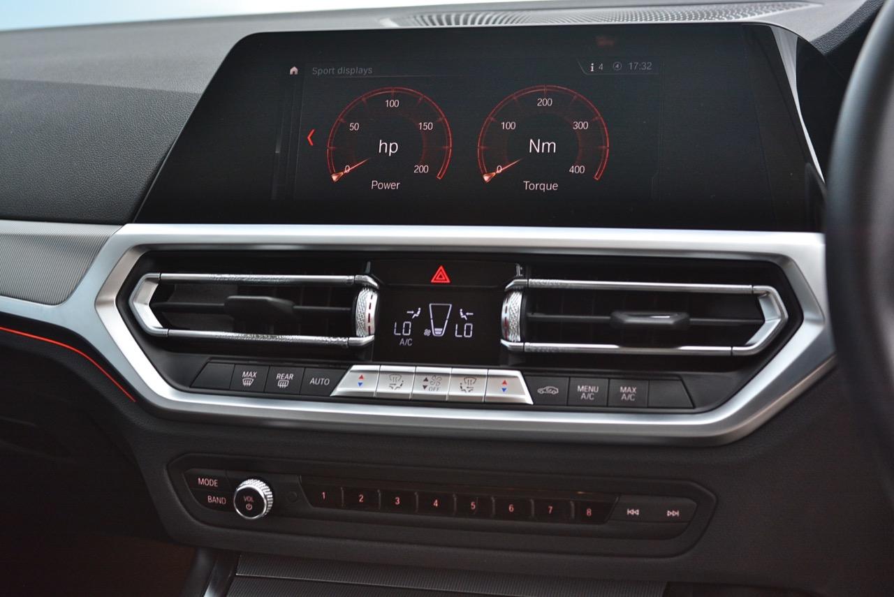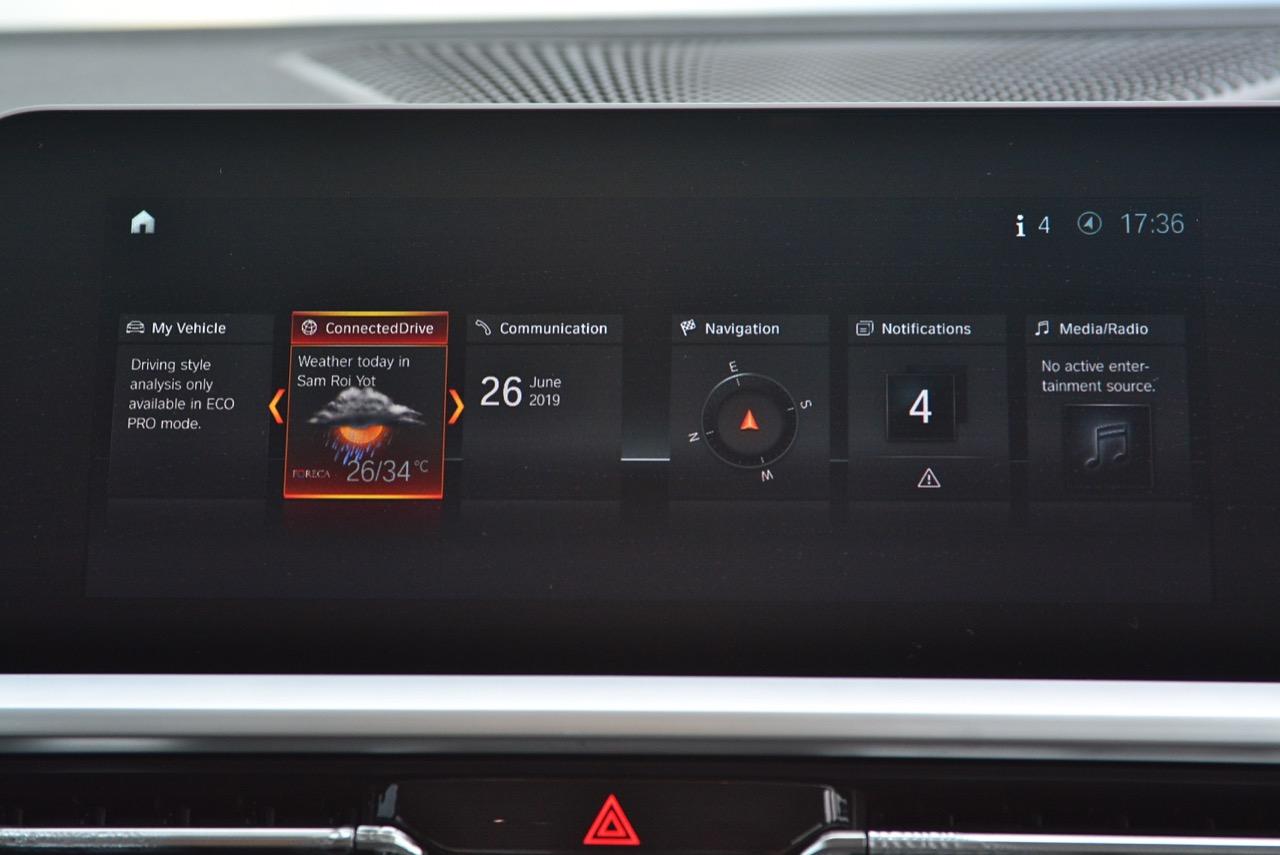 แดชบอร์ดของ BMW New Series-3 320d Sport G20 มีความลาดเอียงมากกว่าแดชบอร์ดของ Series-3 F30 จอมอนิเตอร์กลางแสดงผลด้วยความคมชัดพร้อมฟังก์ชั่นการใช้งานที่หลากหลาย มีทั้งระบบนำทางด้วยดาวเทียมเนวิเกตอร์ ฟังก์ชั่นการเชื่อมต่อต่างๆ การแสดงผลอัตราสิ้นเปลืองเชื้อเพลิง ปรับตั้งค่าและระบบต่างๆ ของรถ เป็นจอภาพของระบบให้ความบันเทิง เชื่อมต่อกับโทรศัพท์เพื่อเล่นเพลงในระบบบูลทูธ เชื่อมต่ออุปกรณ์ต่างๆ ผ่าน USB เป็นมอนิเตอร์ของการปรับตั้งระบบไฟส่องสว่างทั้งภายนอกและภายใน รวมถึงการปรับตั้งไฟตกแต่ง Ambient Lights ที่เลือกสีสันได้ 11 เฉดสี เป็นจอมอนิเตอร์ของระบบแจ้งเตือนแรงดันลมยางทั้งสี่ล้อ แจ้งเตือนสภาพอากาศและอุณหภูมิฯ จอมอนิเตอร์สามารถสั่งงานผ่านแป้นควบคุม iDRIVE หรือใช้การสัมผัสเบาๆ ที่หน้าจอภาพBMW 320d Sport G20 ไม่มีกล้องมองหลังมาให้ แต่ใช้ภาพกราฟิกในการแจ้งเตือนเมื่อถอยหลังเข้าไปใกล้กับสิ่งกีดขวางพร้อมสัญญาณเสียงคอยแจ้งเตือน สำหรับชุดเครื่องเสียงติดตั้งลำโพงและชุด Multimedia ของ BMW ให้เสียงที่คมชัดใช้ได้แต่กำลังขับยังเป็นรองเครื่องเสียงของ Harman Kardon ที่ติดตั้งอยู่ใน 330i M-Sport
