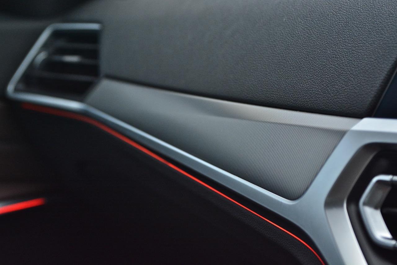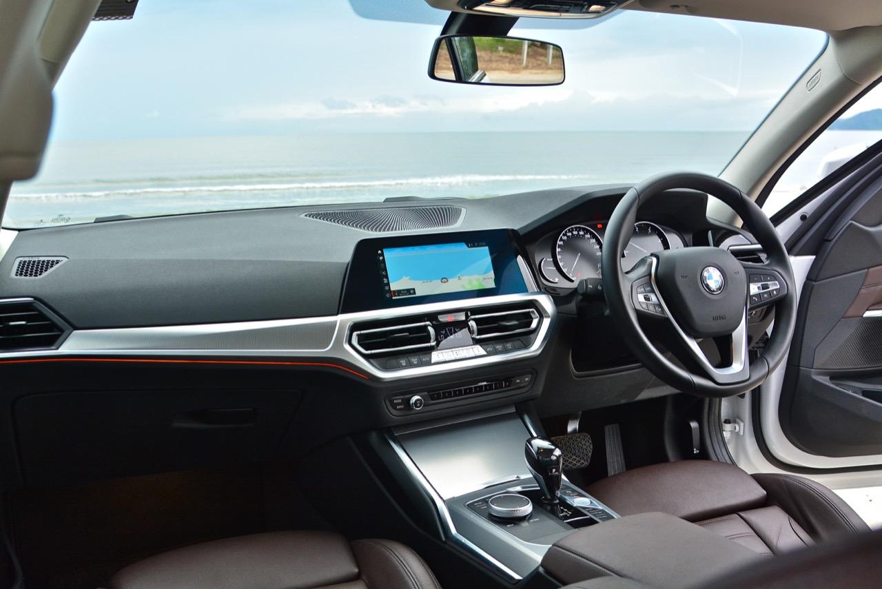 ผมชอบงานอะลูมิเนียมลาย Mesheffect ที่เฉียบคมบนแผงคอนโซลและแผงประตู ซุ้มเกียร์แบบใหม่กับหัวคันเกียร์หน้าตาประหลาดแต่จับได้ถนัดมือดีแท้ แป้นควบคุมของระบบ iDRIVE ปรับเปลี่ยนรูปแบบใหม่หมดและมีการย้ายตำแหน่งของปุ่มสตาร์ทเครื่องยนต์โดยเอามาแปะไว้ข้างๆคันเกียร์ 320d Sport G20 มีภายในที่ให้ความรู้สึกหรูหรามีระดับ ดูแพงและพิเศษ จากคุณภาพของวัสดุและงานประกอบ พวกหนัง อะลูมิเนียม พลาสติกเกรดสูง เป็นภายในของ BMW ยุคใหม่ที่ยังคงเน้นความประณีตบรรจง ซึ่งเป็นวัฒนธรรมเก่าแก่ที่คุ้นเคยของแบรนด์ตราใบพัด
