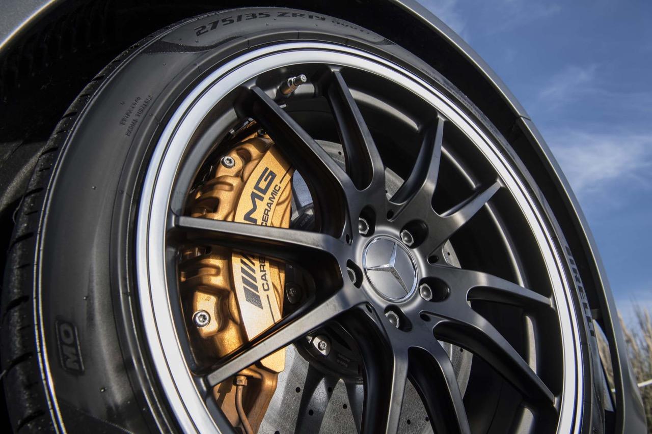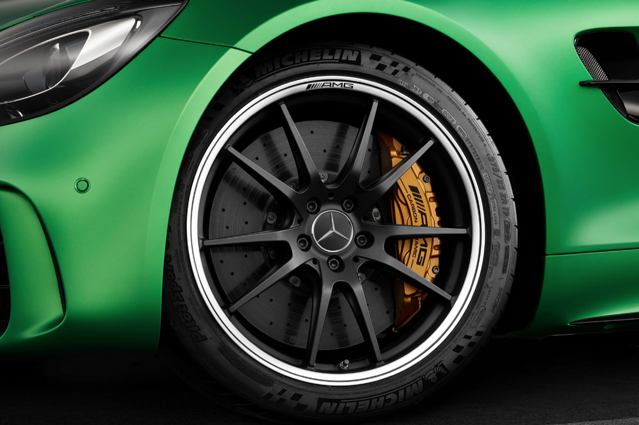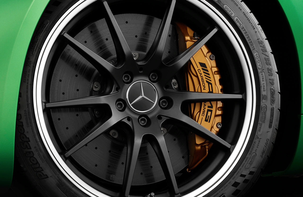 Mercedes AMG GT-R วางระบบเบรกคล้ายรถแข่งโดยใช้จานคาร์บอนเซรามิก พร้อมคาร์ลิปเปอร์ AMG สีทองแบบ 6 พอตหน้า 4 พอตหลัง จานเซรามิกหน้าขนาด 402 มิลลิเมตร ส่วนจานหลังก็ยังโตถึง 360 มิลลิเมตร หากไม่บ้าจนเกินเหตุรับรองเบรกอยู่อย่างแน่นอน AMG GT-R ยัดล้อต่างไซส์แบบหลังใหญ่หน้าเล็กเพื่อเพิ่มประสิทธิภาพของการเทม้าลงพื้นและการบังคับควบคุม ล้ออัลลอย AMG ลายก้านสีดำด้าน ล้อหน้ามีขนาด 10.0Jx19" ET65 ส่วนล้อหลังใหญ่กว่าที่ 12.0Jx20" ET52 ล้อหน้ายัดยาง Pilot Sport Cup 2 ไซส์ 275/35ZR19 ส่วนล้อหลังใส่ยางไซส์ 325/30ZR20 สาแก่ใจขาโก๋ไฮโซไปตามๆ กัน