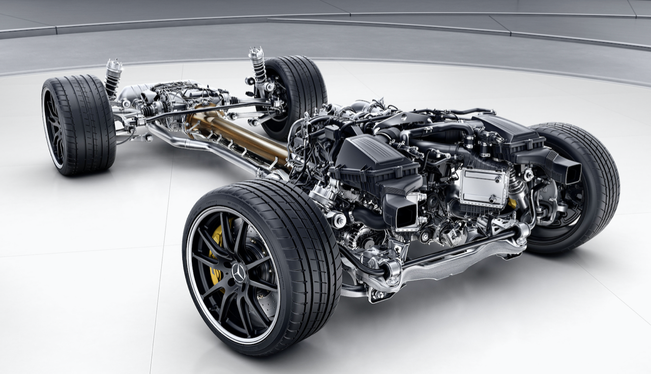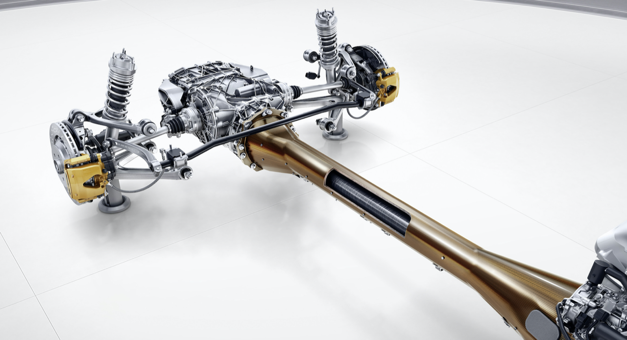 ช่วงล่างหลังติดตั้งปีกนกอัลลอย ท่อนล่างยึดด้วยข้อต่อที่ใช้ตลับลูกปืนทรงโค้งแบบเบ้า เพื่อเติมความหนึบของการยึดเกาะและความเฉียบคมของการควบคุมมีการใช้ท่อกันโคลงขนาดใหญ่และหนากว่าของ AMG GTS ชุดบังคับเลี้ยวใช้พวงมาลัยไฟฟ้าแบบ Active ในย่านความเร็ว 100 กิโลเมตรต่อชั่วโมง ล้อหลังจะแพนองศาตรงข้ามกับล้อหน้าเพื่อลดมุมองศาพวงมาลัยเมื่อเลี้ยวโค้งในย่านความเร็วสูง และเพิ่มความคล่องตัวให้กับ GT-R แต่เมื่อความเร็วในโค้งทะยานผ่าน 100 กิโลเมตรต่อชั่วโมง แกนของล้อหลังจะกลับมาเลี้ยวไปในทิศทางเดียวกับล้อหน้า เพื่อเพิ่มเสถียรภาพการทรงตัว แผ่นปิดใต้ท้องรถทำจากคาร์บอนไฟเบอร์ ป้องกันกระแสลมหมุนวนเมื่อทำความเร็ว