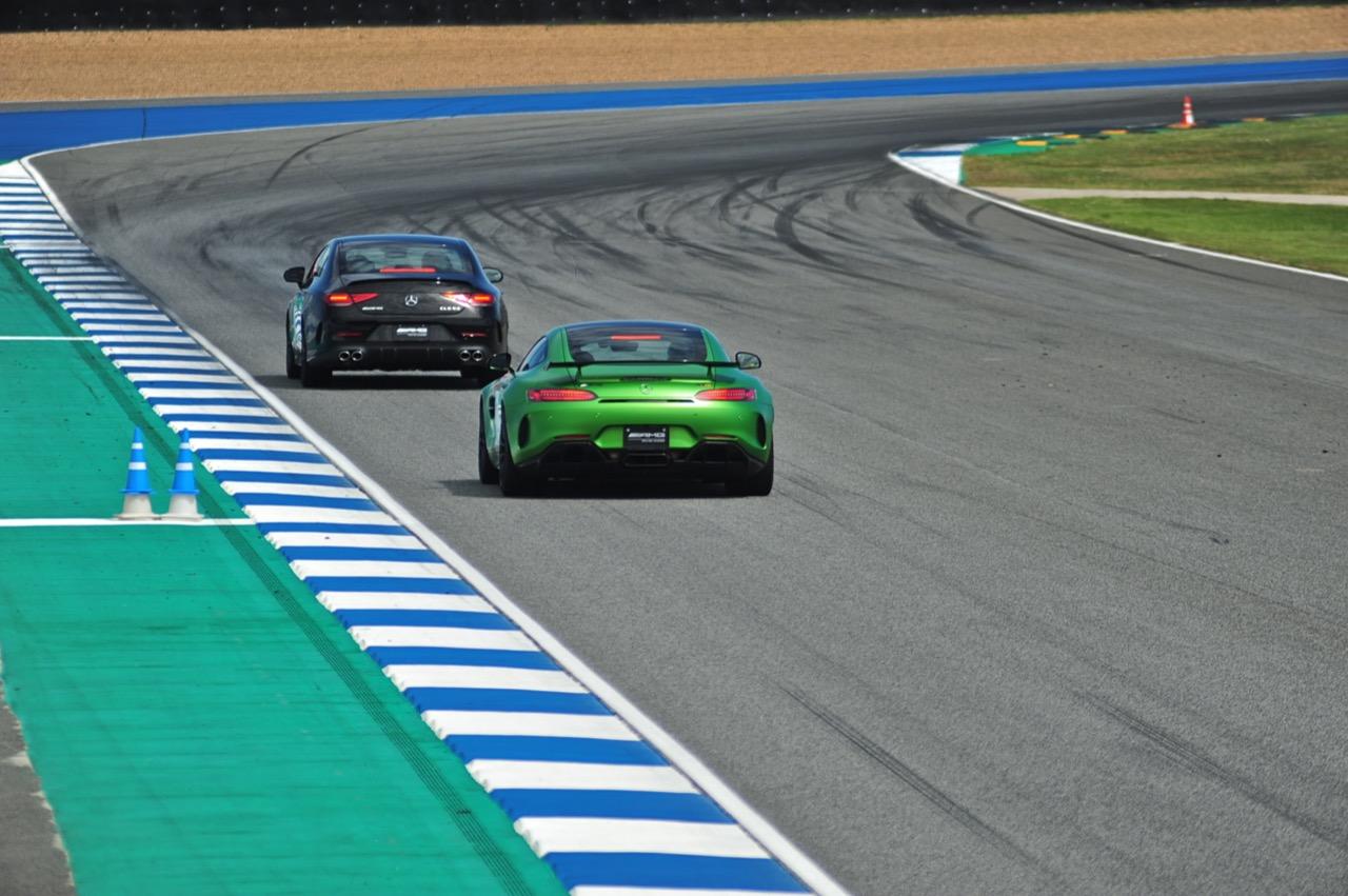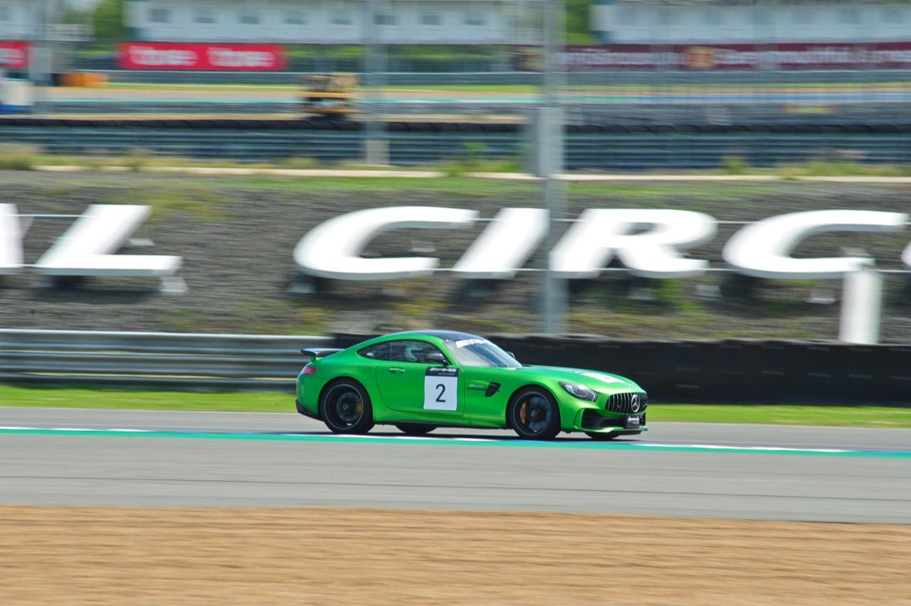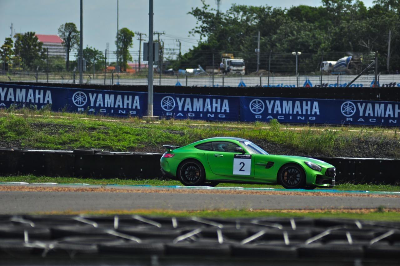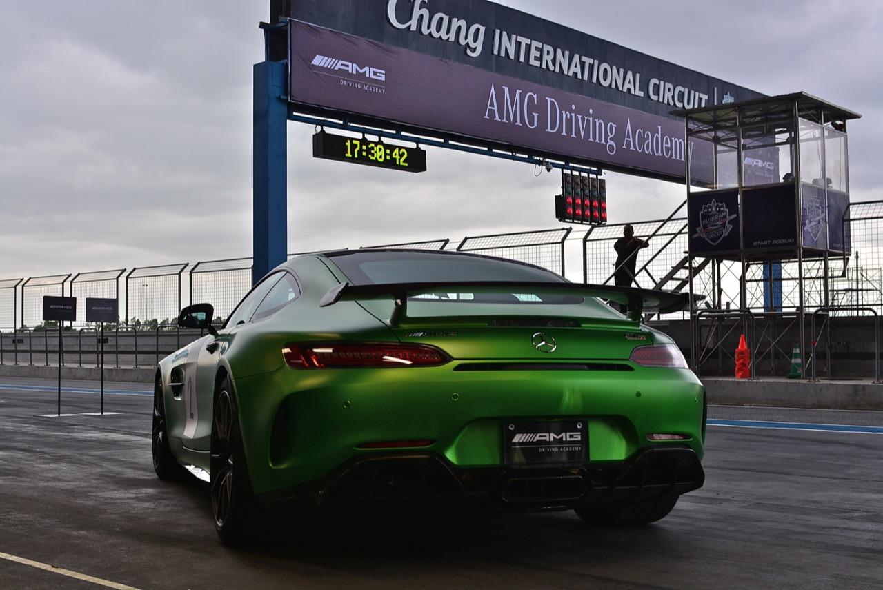 เวลาที่จะหายใจหายคอแทบไม่มีเนื่องจากสถานี Lead and Follow ซึ่งต้องขับอสุรกาย AMG คันละสามรอบ ทำให้ต้องวิ่งขึ้น-ลง เปลี่ยนรถกันเป็นว่าเล่นราวกับลิงพันแห เมื่อมองจากรูปลักษณ์แบบรถแข่ง AMG GT-R คล้ายสัตว์ร้ายที่ออกล่าเหยื่อ เอกลักษณ์ของรถรุ่นนี้คือสีเขียวแสบไส้ Green Hell บ่งบอกความโหดว่ามันเคยวิ่งเต็มข้อในสนาม Nurburgring ความยาว 26 กิโลเมตรต่อรอบ ด้วยเวลาแค่ 7 นาที กับอีก 10 วินาทีเท่านั้น เครื่องยนต์ V8 Bi-Turbo จูนกำลังมากกว่า AMG GT-S ถึง 74 แรงม้า ด้วยการปรับเทอร์โบ พอร์ตไอเสีย ฟลายวิลล์น้ำหนักเบา จูนการตอบสนองขอบคันเร่งใหม่ให้ไวขึ้น ลดอาการเทอร์โบแลคหรืออาการรอรอบ มันเบากว่า AMG GT-S 15 กิโลกรัม เกิดจากการเพิ่มวัสดุพวกคาร์บอนไฟเบอร์และอะลูมิเนียมในบางตำแหน่งที่ต้องการหั่นน้ำหนักส่วนเกิน กำลังที่ได้รับเมื่อเทียบกับมาตราส่วนแรงม้าต่อตันอยู่ที่ 377 แรงม้า/ตัน แรงกว่า 911 GT3 โฉมปัจจุบันที่ทำได้ 350 แรงม้า/ตัน ความเร็วตีนต้นจาก 0-100 กิโลเมตรต่อชั่วโมงใน 3.4 วินาที ดึงหนักจนเสียวสันหลัง ระบบที่ช่วยให้การขับเคลื่อนในย่านความเร็วสูงของ AMG GT-R เป็นไปด้วยความเสถียรก็คือชุดแอร์โรที่จะปรับความสูงของตัวรถลงอีก 40 มิลลิเมตร เมื่อขับเกิน 120 กิโลเมตรต่อชั่วโมง และ 80 กิโลเมตรต่อชั่วโมงในโหมด RACE ช่วยลดการยกตัวบริเวณเพลาหน้า ระยะห่างล้อหน้าเพิ่มขึ้น 46 มิลลิเมตร หลังก็เพิ่มเป็น 57 มิลลิเมตร เพื่อเพิ่มการยึดเกาะ แทรกชั่นคอนโทรลควบคุมด้วย ECU สามารถปรับตัวเองแบบอัตโนมัติได้อย่างหลากหลายถึง 9 ระดับ คอยควบคุมเสถียรภาพของ GT-R ตั้งแต่ขับพาเมียน้อยไปทานข้าวชิลๆ หรือไล่ล่าท้ายรถ instructor ในสนามช้างแบบที่ผมกำลังทำอยู่ในตอนนี้!