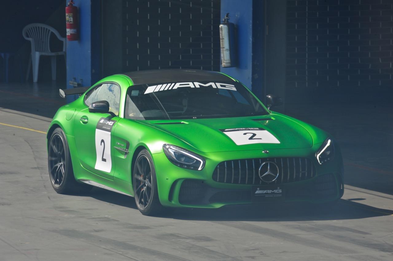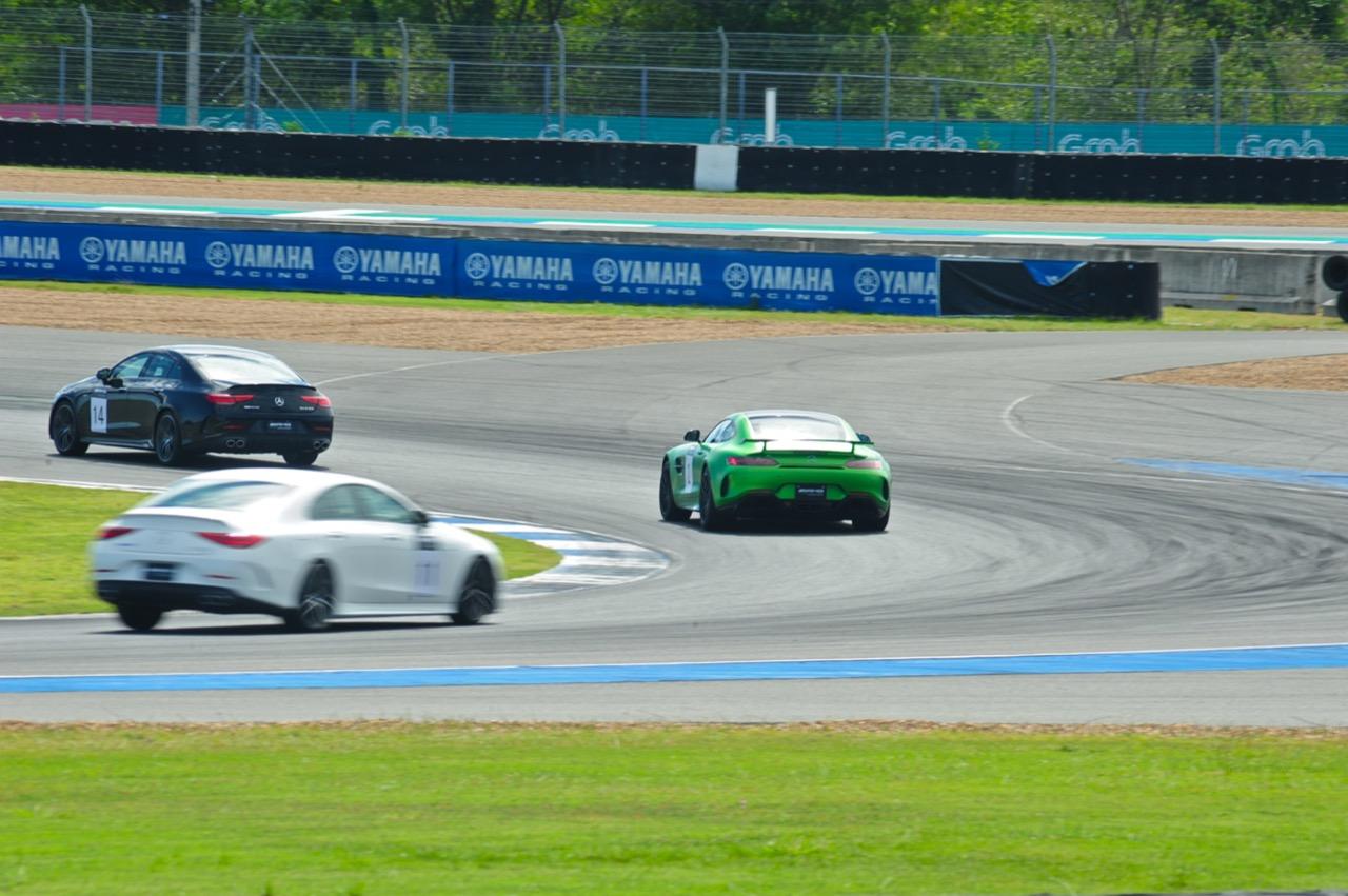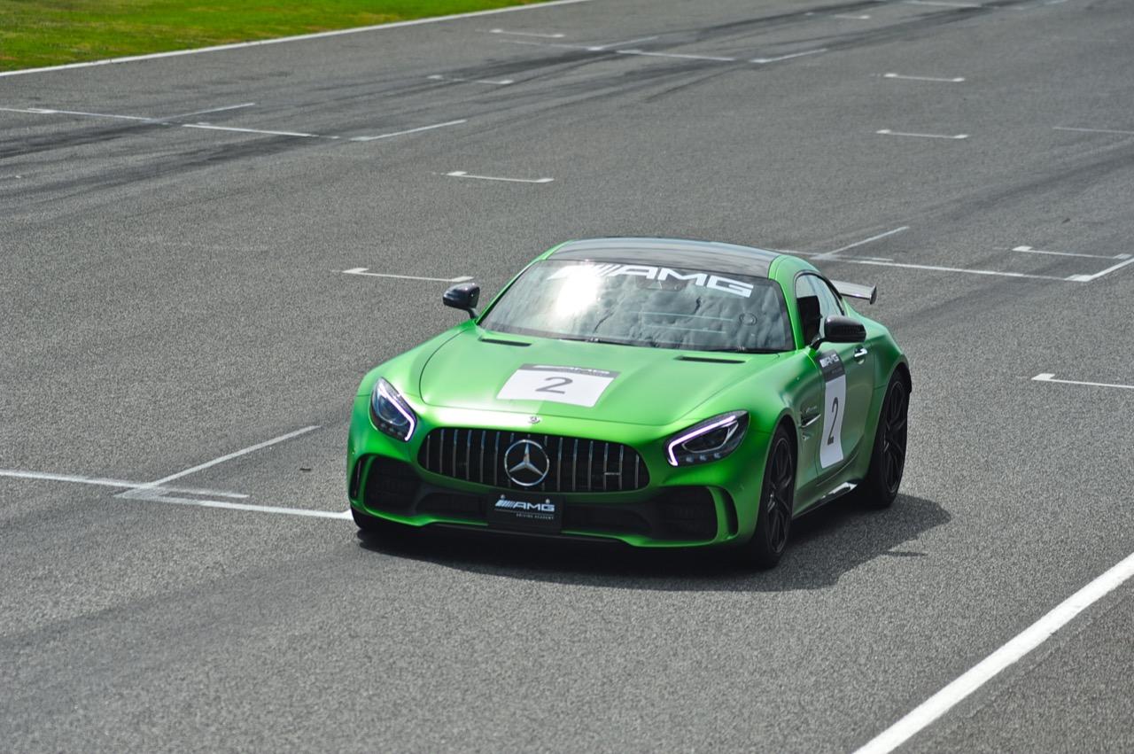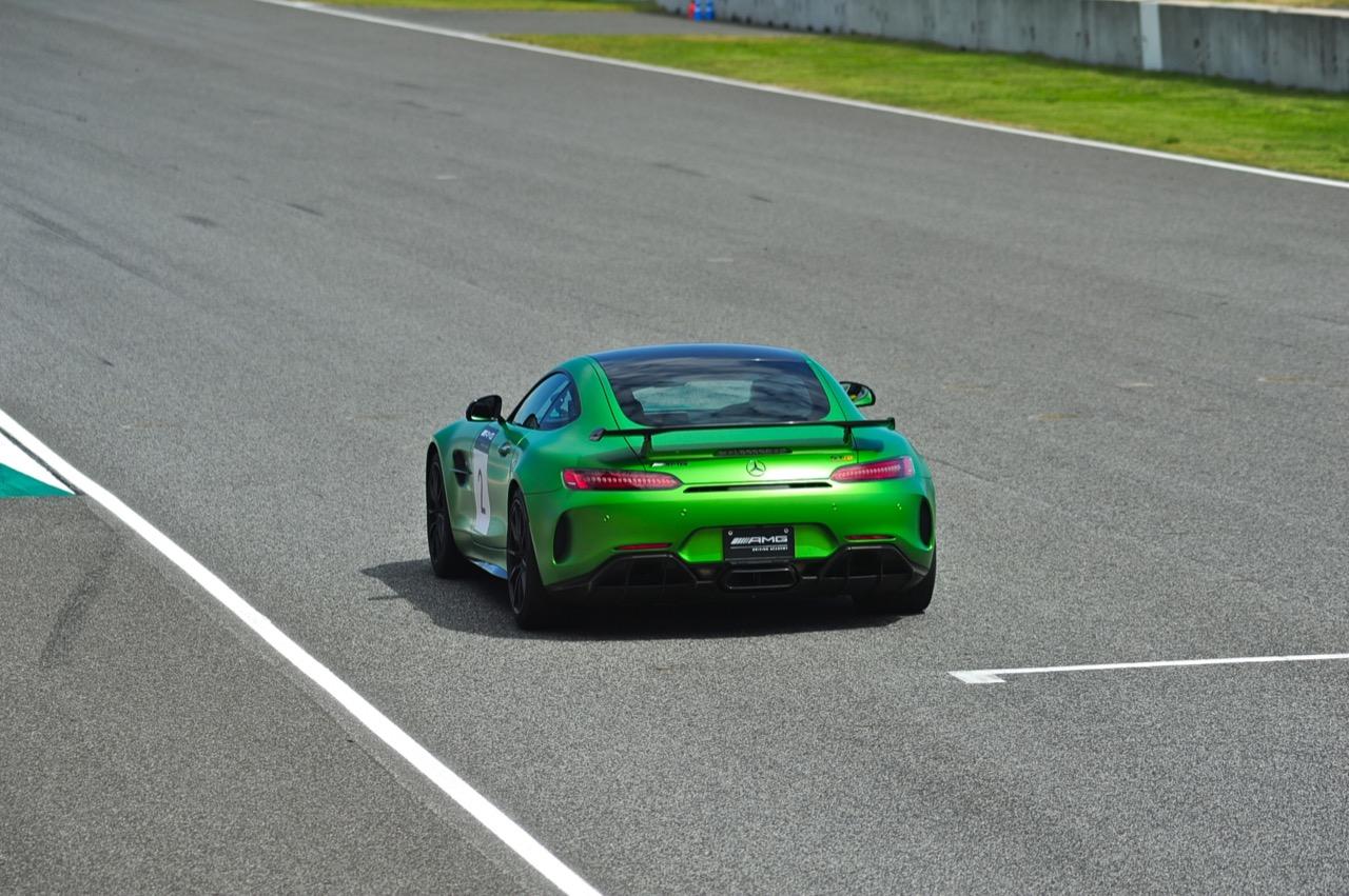 เวลาที่จะหายใจหายคอแทบไม่มีเนื่องจากสถานี Lead and Follow ซึ่งต้องขับอสุรกาย AMG คันละสามรอบ ทำให้ต้องวิ่งขึ้น-ลง เปลี่ยนรถกันเป็นว่าเล่นราวกับลิงพันแห เมื่อมองจากรูปลักษณ์แบบรถแข่ง AMG GT-R คล้ายสัตว์ร้ายที่ออกล่าเหยื่อ เอกลักษณ์ของรถรุ่นนี้คือสีเขียวแสบไส้ Green Hell บ่งบอกความโหดว่ามันเคยวิ่งเต็มข้อในสนาม Nurburgring ความยาว 26 กิโลเมตรต่อรอบ ด้วยเวลาแค่ 7 นาที กับอีก 10 วินาทีเท่านั้น เครื่องยนต์ V8 Bi-Turbo จูนกำลังมากกว่า AMG GT-S ถึง 74 แรงม้า ด้วยการปรับเทอร์โบ พอร์ตไอเสีย ฟลายวิลล์น้ำหนักเบา จูนการตอบสนองขอบคันเร่งใหม่ให้ไวขึ้น ลดอาการเทอร์โบแลคหรืออาการรอรอบ มันเบากว่า AMG GT-S 15 กิโลกรัม เกิดจากการเพิ่มวัสดุพวกคาร์บอนไฟเบอร์และอะลูมิเนียมในบางตำแหน่งที่ต้องการหั่นน้ำหนักส่วนเกิน กำลังที่ได้รับเมื่อเทียบกับมาตราส่วนแรงม้าต่อตันอยู่ที่ 377 แรงม้า/ตัน แรงกว่า 911 GT3 โฉมปัจจุบันที่ทำได้ 350 แรงม้า/ตัน ความเร็วตีนต้นจาก 0-100 กิโลเมตรต่อชั่วโมงใน 3.4 วินาที ดึงหนักจนเสียวสันหลัง ระบบที่ช่วยให้การขับเคลื่อนในย่านความเร็วสูงของ AMG GT-R เป็นไปด้วยความเสถียรก็คือชุดแอร์โรที่จะปรับความสูงของตัวรถลงอีก 40 มิลลิเมตร เมื่อขับเกิน 120 กิโลเมตรต่อชั่วโมง และ 80 กิโลเมตรต่อชั่วโมงในโหมด RACE ช่วยลดการยกตัวบริเวณเพลาหน้า ระยะห่างล้อหน้าเพิ่มขึ้น 46 มิลลิเมตร หลังก็เพิ่มเป็น 57 มิลลิเมตร เพื่อเพิ่มการยึดเกาะ แทรกชั่นคอนโทรลควบคุมด้วย ECU สามารถปรับตัวเองแบบอัตโนมัติได้อย่างหลากหลายถึง 9 ระดับ คอยควบคุมเสถียรภาพของ GT-R ตั้งแต่ขับพาเมียน้อยไปทานข้าวชิลๆ หรือไล่ล่าท้ายรถ instructor ในสนามช้างแบบที่ผมกำลังทำอยู่ในตอนนี้!