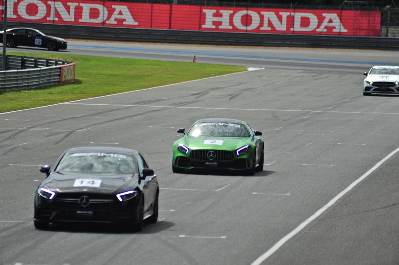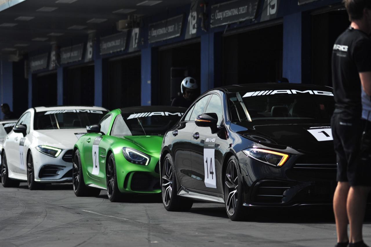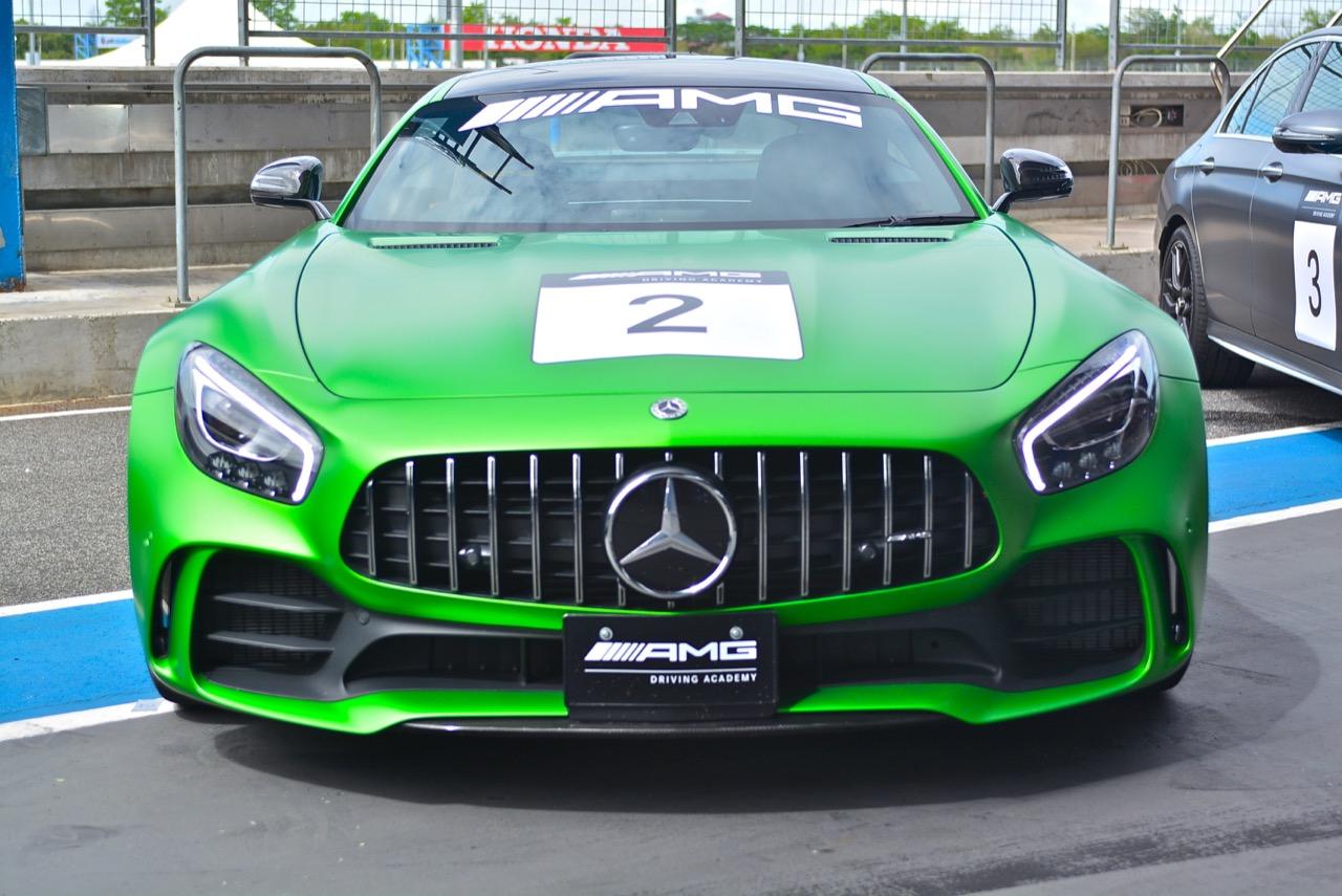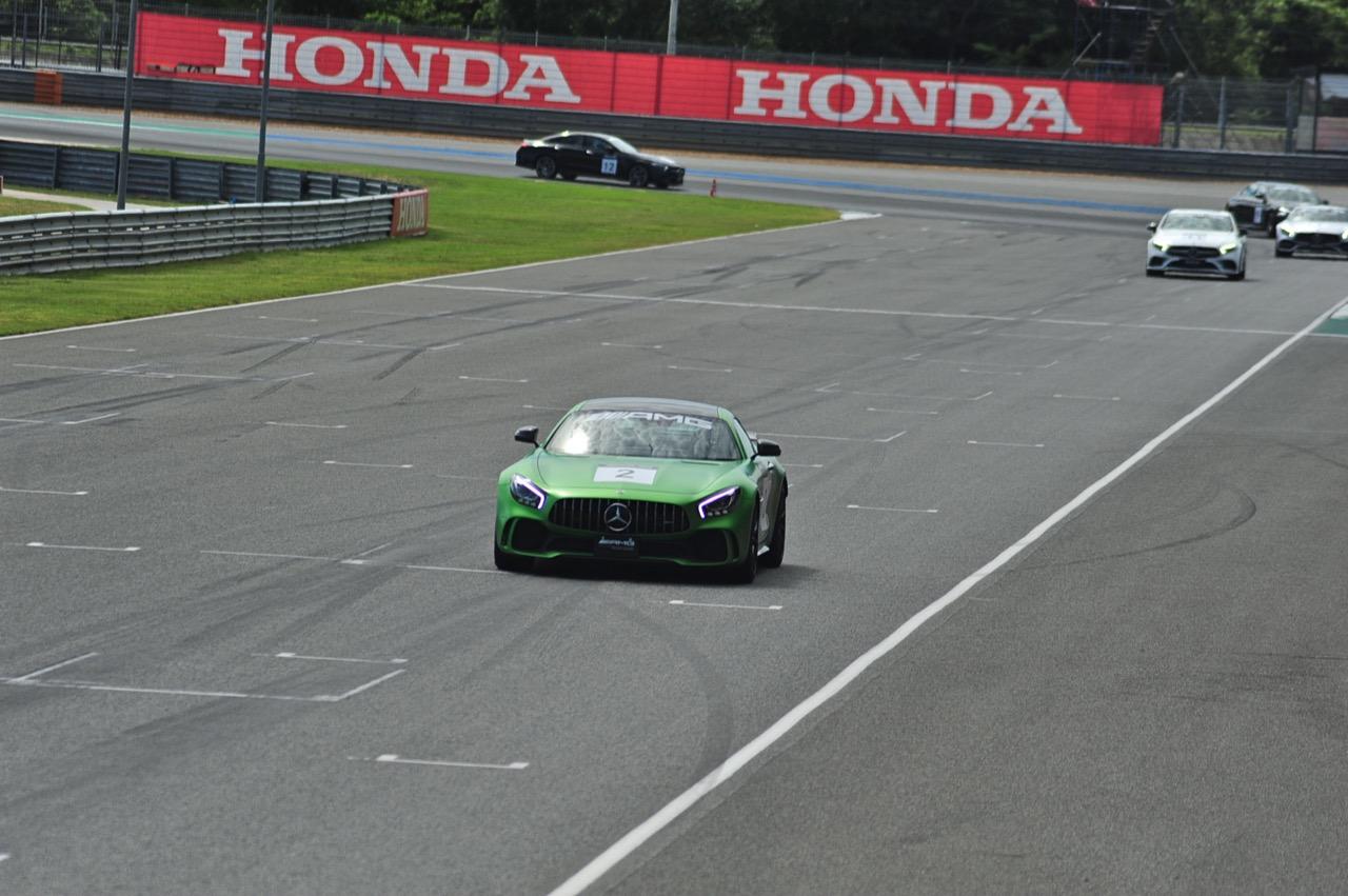 เวลาที่จะหายใจหายคอแทบไม่มีเนื่องจากสถานี Lead and Follow ซึ่งต้องขับอสุรกาย AMG คันละสามรอบ ทำให้ต้องวิ่งขึ้น-ลง เปลี่ยนรถกันเป็นว่าเล่นราวกับลิงพันแห เมื่อมองจากรูปลักษณ์แบบรถแข่ง AMG GT-R คล้ายสัตว์ร้ายที่ออกล่าเหยื่อ เอกลักษณ์ของรถรุ่นนี้คือสีเขียวแสบไส้ Green Hell บ่งบอกความโหดว่ามันเคยวิ่งเต็มข้อในสนาม Nurburgring ความยาว 26 กิโลเมตรต่อรอบ ด้วยเวลาแค่ 7 นาที กับอีก 10 วินาทีเท่านั้น เครื่องยนต์ V8 Bi-Turbo จูนกำลังมากกว่า AMG GT-S ถึง 74 แรงม้า ด้วยการปรับเทอร์โบ พอร์ตไอเสีย ฟลายวิลล์น้ำหนักเบา จูนการตอบสนองขอบคันเร่งใหม่ให้ไวขึ้น ลดอาการเทอร์โบแลคหรืออาการรอรอบ มันเบากว่า AMG GT-S 15 กิโลกรัม เกิดจากการเพิ่มวัสดุพวกคาร์บอนไฟเบอร์และอะลูมิเนียมในบางตำแหน่งที่ต้องการหั่นน้ำหนักส่วนเกิน กำลังที่ได้รับเมื่อเทียบกับมาตราส่วนแรงม้าต่อตันอยู่ที่ 377 แรงม้า/ตัน แรงกว่า 911 GT3 โฉมปัจจุบันที่ทำได้ 350 แรงม้า/ตัน ความเร็วตีนต้นจาก 0-100 กิโลเมตรต่อชั่วโมงใน 3.4 วินาที ดึงหนักจนเสียวสันหลัง ระบบที่ช่วยให้การขับเคลื่อนในย่านความเร็วสูงของ AMG GT-R เป็นไปด้วยความเสถียรก็คือชุดแอร์โรที่จะปรับความสูงของตัวรถลงอีก 40 มิลลิเมตร เมื่อขับเกิน 120 กิโลเมตรต่อชั่วโมง และ 80 กิโลเมตรต่อชั่วโมงในโหมด RACE ช่วยลดการยกตัวบริเวณเพลาหน้า ระยะห่างล้อหน้าเพิ่มขึ้น 46 มิลลิเมตร หลังก็เพิ่มเป็น 57 มิลลิเมตร เพื่อเพิ่มการยึดเกาะ แทรกชั่นคอนโทรลควบคุมด้วย ECU สามารถปรับตัวเองแบบอัตโนมัติได้อย่างหลากหลายถึง 9 ระดับ คอยควบคุมเสถียรภาพของ GT-R ตั้งแต่ขับพาเมียน้อยไปทานข้าวชิลๆ หรือไล่ล่าท้ายรถ instructor ในสนามช้างแบบที่ผมกำลังทำอยู่ในตอนนี้!