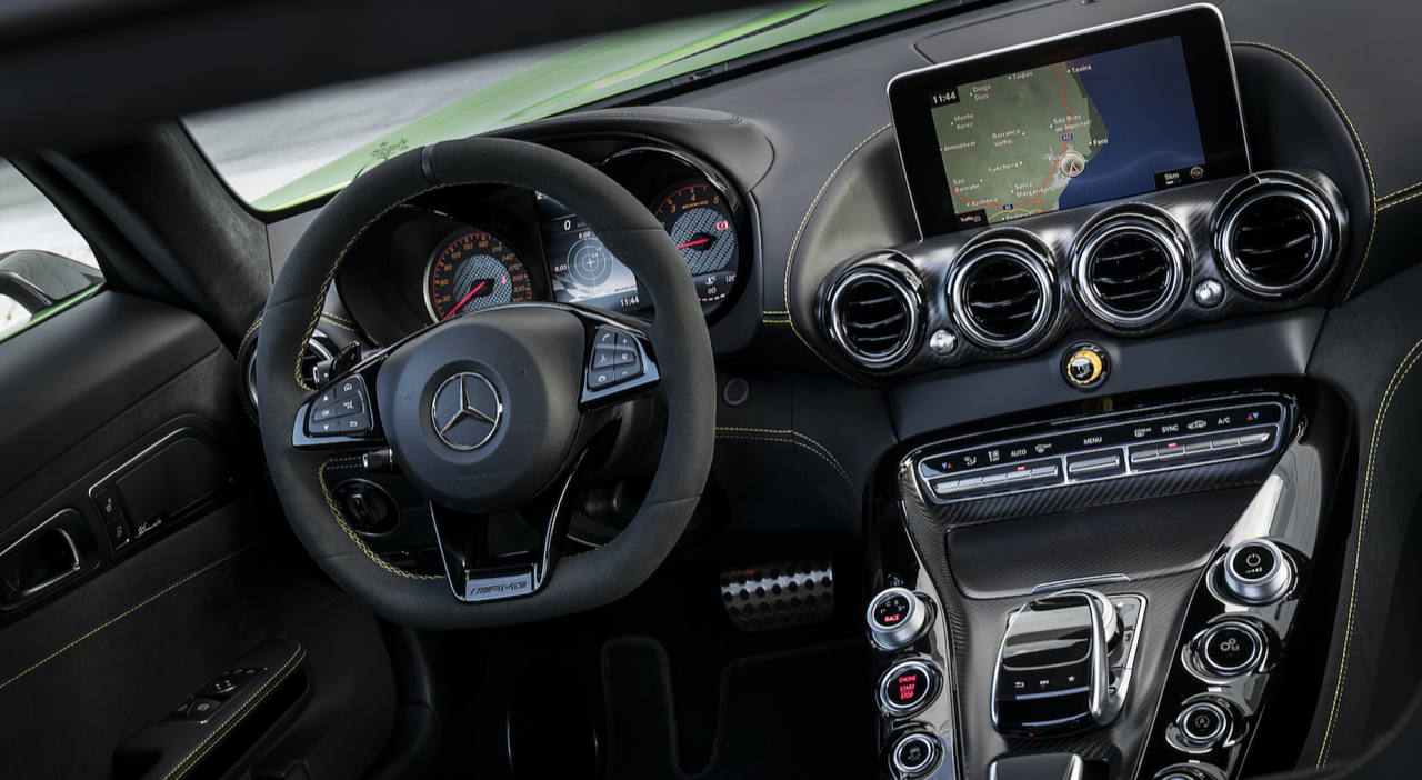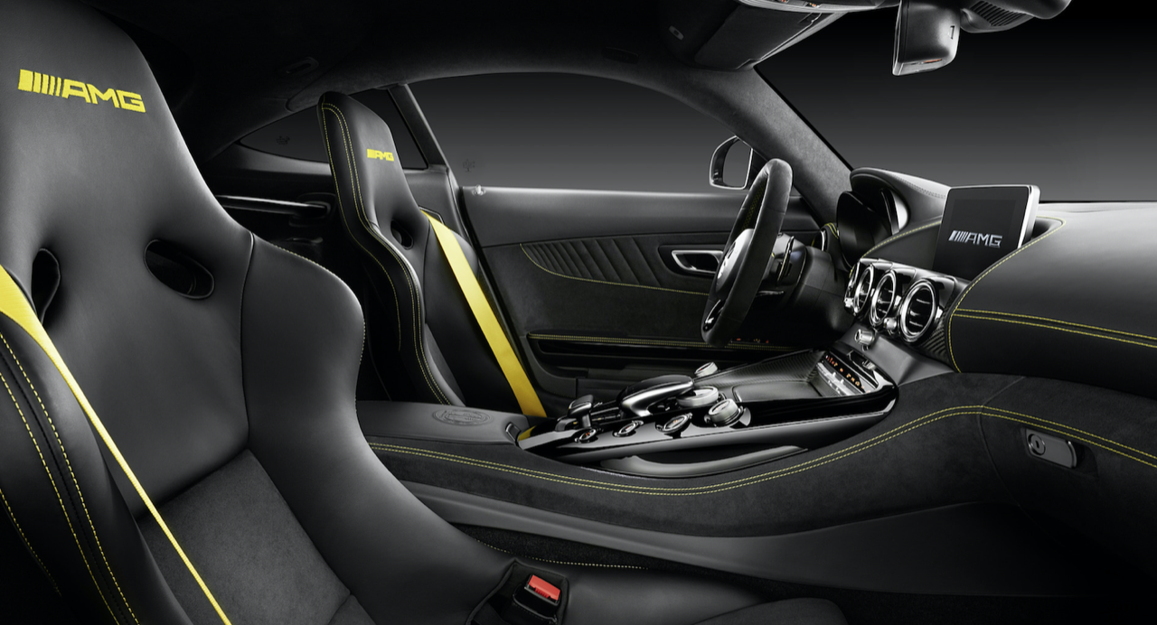 ภายในใส่เบาะรถแข่ง AMG แดชบอร์ดหุ้มหนังกลับ พวงมาลัยหนังกลับ เข็มขัดนิรภัยสีเหลืองสด ช่องแอร์ตรงคอนโซลกลางหุ้มงานคาร์บอนไฟเบอร์แนวตัวแข่ง หน้าปัดมาตรวัดมีการลงลึกด้านรายละเอียดให้แตกต่างไปจาก AMG GTS เนื่องจาก AMG GT-R นั้นถูกกำหนดมาให้ขายแพงกว่าจากของแต่งและการปรับจูนอัพแรงม้า เบาะแบบแข่งของ AMG ปรับเอนไม่ได้แต่เลื่อนเข้า-ออกได้ ห้องโดยสารหรือ Cockpit ของ Mercedes Benz AMG GT-R มีอุโมงค์เกียร์ที่ใหญ่โตราวกับอู่จอดเรือดำน้ำ ทำให้ผู้โดยสารและคนขับถูกกั้นออกจากันอย่างสิ้นเชิง พวงมาลัยทรงสปอร์ต 3 ก้านเหมือน AMG GTS แต่ก้านด้านล่างประทับตรา AMG Edition บ่งบอกถึงความไม่ธรรมดาจากสำนักแต่ง AMG