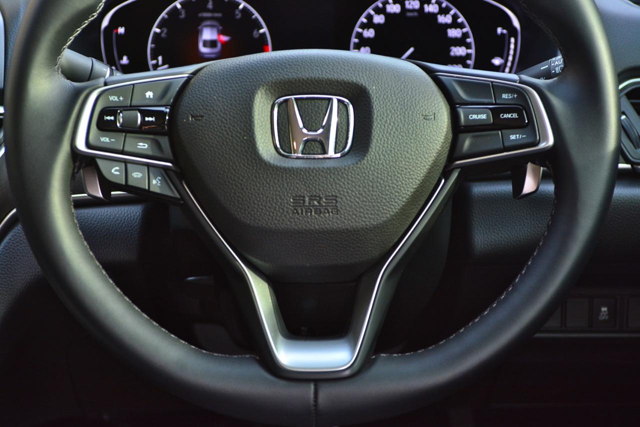 พวงมาลัยมัลติฟังก์ชั่นแบบ 3 ก้านหุ้มหนังแท้ติดตั้งสวิตช์ควบคุมระบบเครื่องเสียงและการเชื่อมต่อสั่งงานโทรศัพท์สมาร์ทโฟน ควบคุมระบบสั่งงานด้วยเสียงและปรับตั้งระบบควบคุมความเร็วอัตโนมัติหรือ cruise-control ปุ่มเลือกโหมดต่างๆ ของชุดเครื่องเสียง แป้นเปลี่ยนเกียร์ Paddle Shift อยู่หลังวงพวงมาลัยในตำแหน่งที่คล้ายกับ Civic ช่องแอร์ของผู้โดยสารตอนหลังมีมาให้เพื่อการกระจายความเย็นไปยังเบาะหลัง แผงประตูที่ดูทันสมัย ภายในโทนสีเทาดำที่ทำออกมาเอาใจผู้บริหารยังช่วยทำให้ห้องโดยสารของ Accord 2.0EL Minor change ดูเคร่งขรึมและมีความหรูหราพอสมควรเมื่อเทียบกับระดับของราคาค่าตัว 1.47 ล้าน