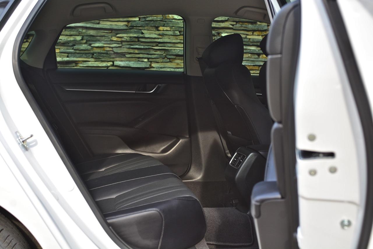 ตัวถังที่เน้นหลักอากาศพลศาสตร์ของ New Accord ทำให้ทรงด้านข้างมีความปราดเปรียวใช้ได้ การออกแบบเสาท้ายที่โค้งลงไปยังส่วนหลังของฝากระโปรงท้ายยิ่งเพิ่มความสวยงามให้กับมุมมองของตัวถังด้านข้าง New Accord ใช้เส้นด้านข้างตัวถังบริเวณส่วนบนของแก้มข้าง ลากยาวผ่านบานประตูหน้า-หลังไปจนถึงขอบของไฟท้าย เป็นสไตล์ที่คุ้นเคยของ Honda เสาอากาศทรงครีบปลาฉลามกับแนวเส้นโครเมียมที่กรุรอบบานกระจกประตูทั้งสองบานช่วยเพิ่มความหรูหราให้กับตัวรถ New Accord 1.5 เทอร์โบ ใส่ล้ออะลูมิเนียมขอบ 17 นิ้วพร้อมยาง Michelin รุ่น Primacy 3ST ไซส์ 255/50R17 ฐานล้อที่ยาว 2,830 มิลลิเมตร ยาวกว่ารุ่นเดิมช่วยเพิ่มพื้นที่สำหรับผู้โดยสารตอนหลัง ไม่ว่าจะเป็นพื้นที่ในการวางเท้าหรือพื้นที่บริเวณไหล่ ทำให้นั่งโดยสารที่เบาะหลังได้สบายตัวจากความโอ่โถงของห้องโดยสารสไตล์ซีดานขนาดกลาง บั้นท้ายเปลี่ยนไฟท้ายใหม่โดยใช้หลอด LED ผสมกับหลอดไฟท้ายแบบปกติ รุ่น 1.5 เทอร์โบ ติดตั้งกล้องมองข้างที่ทำงานร่วมแกนกับไฟเลี้ยวซ้ายในกระจกมองข้างด้านซ้าย กล้องมองภาพด้านข้างถูกออกแบบให้ซ่อนอยู่ในกรอบกระจกมองข้างด้ายซ้าย ไม่ได้ยื่นออกมาเป็นตุ่มเหมือนกล้องมองข้างของ Accord ตัวท็อปรุ่นก่อนหน้า ส่วนท่อระบายไอเสียแบบเดี่ยวฝั่งละสองท่อแทบจะมองไม่เห็นเนื่องจากถูกซ่อนอยู่ใต้กันชนหลังอย่างมิดชิด