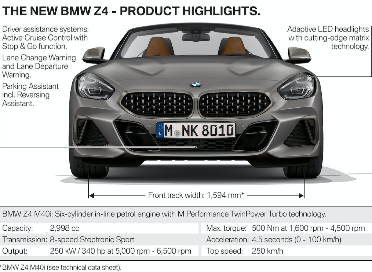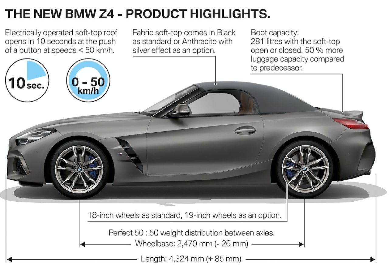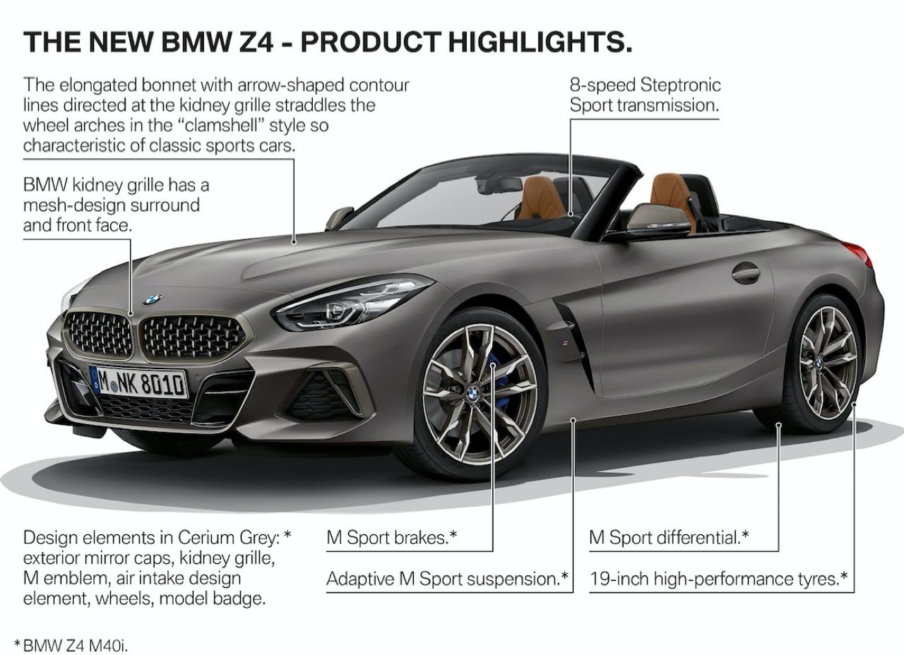 ในวันนี้ BMW Z4 รุ่นใหม่ รหัส G29 ถูกเปิดตัวในไทยไปแล้วเมื่อช่วงกลางฤดูร้อนในงานบางกอก อินเตอร์เนชั่นแนล มอเตอร์โชว์ ของคุณปราจิน เอี่ยมลำเนา ผู้บริหารของ BMW Thailand บอกว่า Z รุ่นใหม่ล่าสุดนั้นจะเป็นรถที่นับเป็นสปอร์ตโรสเตอร์ได้อย่างเต็มปากเต็มคำ และสามารถยืดหยัดซดปากกับ Porsche 718 Boxster / Audi TTRS หรือ SLC43AMG ได้อย่างไม่อายฟ้าดิน BMW Z4 M40i ใช้เครื่องยนต์ 6 สูบ อัดอากาศด้วยเทอร์โบเดี่ยว TwinScroll จากการประคับประคองของเทคนิคใหม่ๆ ใน BMW TwinPower Turbo ในขณะที่ Porsche 718 วางเครื่องสูบนอน Boxer แบบ 4 กระบอกสูบ ดังนั้นก็อาจเป็นไปได้ว่า Z4 จะกลายเป็นรถสปอร์ตระดับราคา 4.99 ล้านบาทที่ดีที่สุด ซึ่งกำลังวางขายในไทยอยู่ ณ ปัจจุบัน