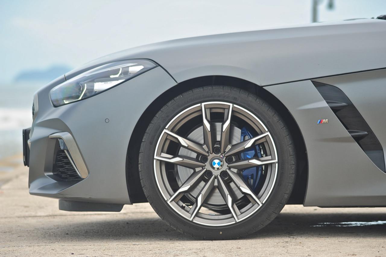 เจ้าโรสเตอร์สุดหล่อใส่ล้อลาย M อย่างสวยขนาด 19 นิ้ว ใช้ยางสมรรถนะสูงของ Michelin รุ่น Pilot Super Sport เป็นยางรุ่นเดียวกับที่ใช้ใน M2/M3/M4 และยังใช้ส่วนผสม Compound ยางแบบเดียวกัน ช่วงล่างด้านหน้าเป็นแบบแม็คเฟอร์สันสตรัท ด้านหลังเป็นแบบมัลติลิงก์ รุ่น M40i นี้จะได้โช้คอัพปรับความหนืดได้ Adaptive Dampers เป็นอุปกรณ์มาตรฐาน มีเบรก M ที่อัปเกรดรับพลังสูงขึ้นเนื่องจากต้องหยุดยั้งแรงม้า 340 ตัวให้ว่านอนสอนง่าย ไม่พาไปตำเสาไฟหรือล่อเข้ากับท้ายของรถบรรทุก! คาร์ลิปเปอร์ M แบบ 4 พอตหน้า และซิงเกอร์พอตที่ล้อหลัง คาร์ลิปเปอร์เบรกพ่นสีฟ้าประทับตรา M อย่างสวย เฟืองท้ายลิมิเต็ดสลิปไฟฟ้า ซึ่งคล้ายกับการทำงานของเฟืองท้ายแจ่มๆ ใน BMW M5 ที่ถูกย่อส่วนลงมา