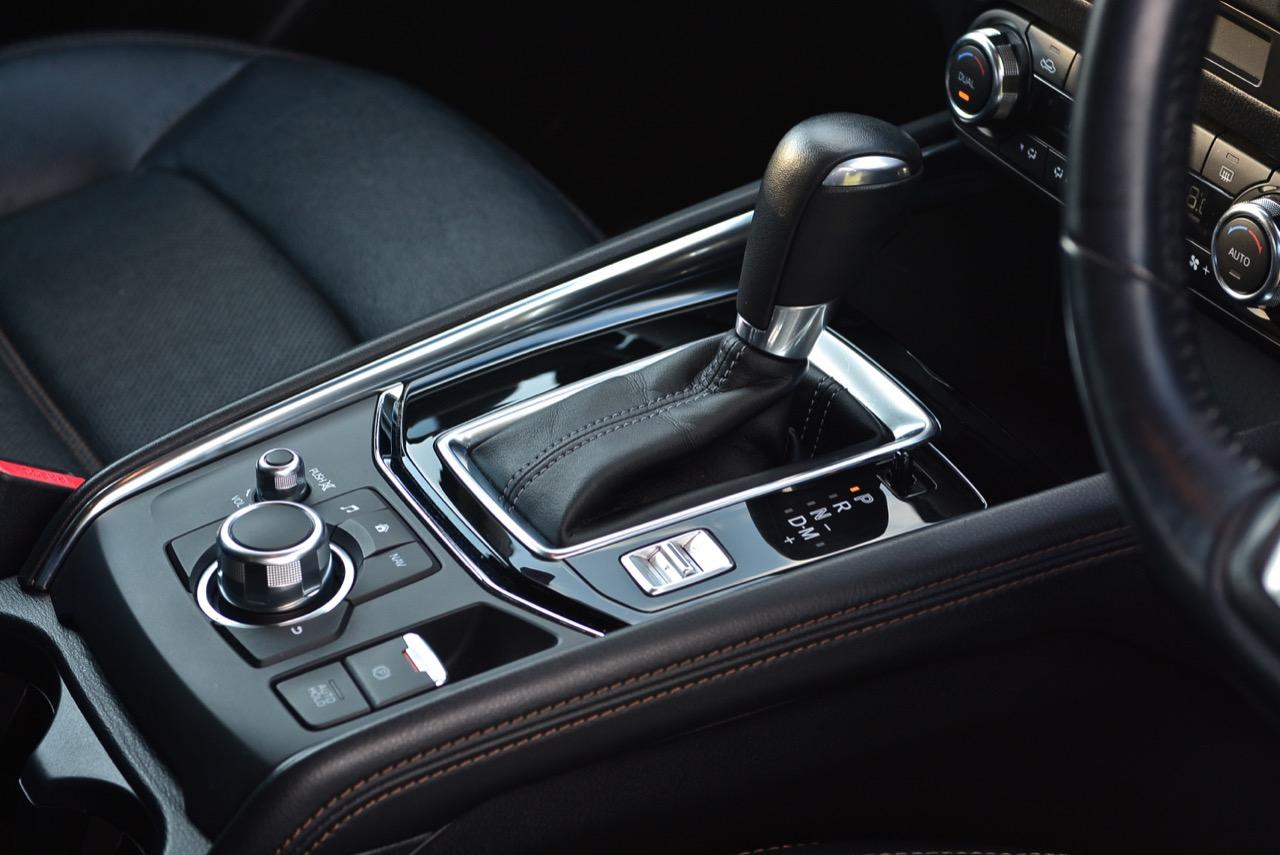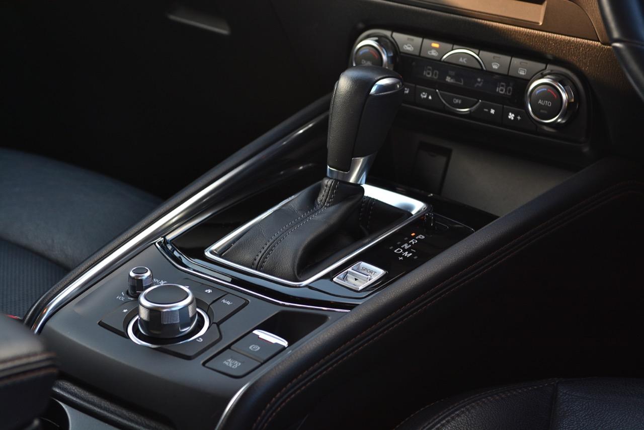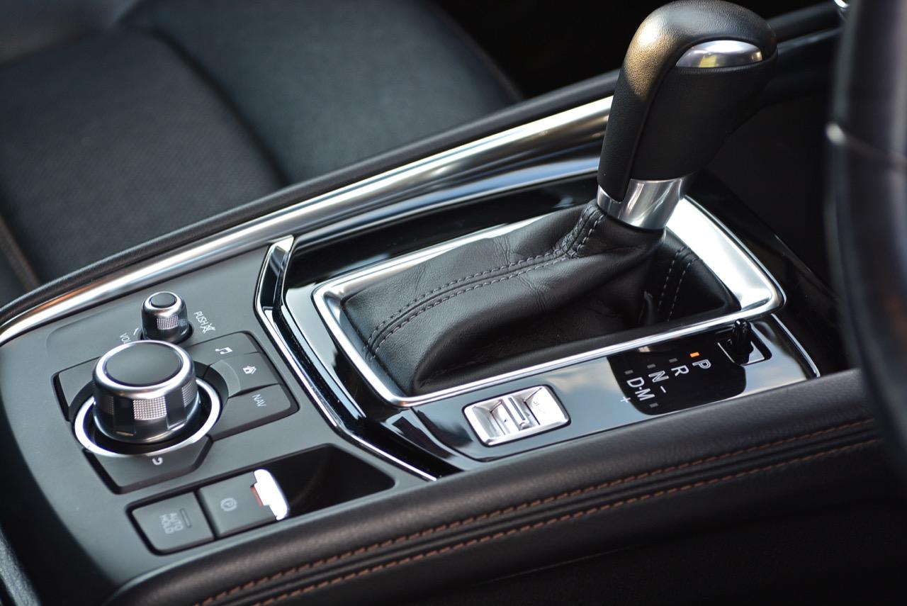 เกียร์ออโต้ 6 สปีด Skyactiv transmission เป็นเกียร์อัตโนมัติแบบฟันเฟืองทอร์คคอนเวอร์เตอร์ที่ปรับอัตราทดให้ครอบคลุมการใช้งาน แถมยังช่วยลดรอบเครื่องยนต์เมื่อวิ่งที่ย่านความเร็วเดินทางทำให้เกิดความประหยัด สวิตช์ Sport Mode ในรุ่นเบนซินมีการปรับการทำงานของเครื่องยนต์ให้ตอบสนองได้ไวขึ้น เกียร์ก็ฉลาดหลักแหลมมากพอที่จะปรับความสมดุลของอัตราทดให้เข้ากับความเร็วและสภาพเส้นทาง ผมลองทดสอบการตอบสนองของเกียร์โดยผลักคันเกียร์มาทางขวาเพื่อเข้าสู่โหมดแมนนวลสำหรับการปรับอัตราทดด้วยตัวคนขับเอง เกียร์ทำงานได้รวดเร็วเมื่อชิฟขึ้น-ลง ตอบสนองไวในการเลือกอัตราทดที่มีความเหมาะสมกับเส้นทางภูเขาของตัวคนขับ ให้ความรู้สึกที่ดีกว่าเกียร์ CVT เป็นชุดส่งกำลังที่น่าชื่นชมและเป็นอุปกรณ์ในระบบส่งกำลังของ Mazda ที่มีการปรับจูน ECU ใหม่ ช่วยทำให้ CX-5 ขับสนุกมากยิ่งขึ้น