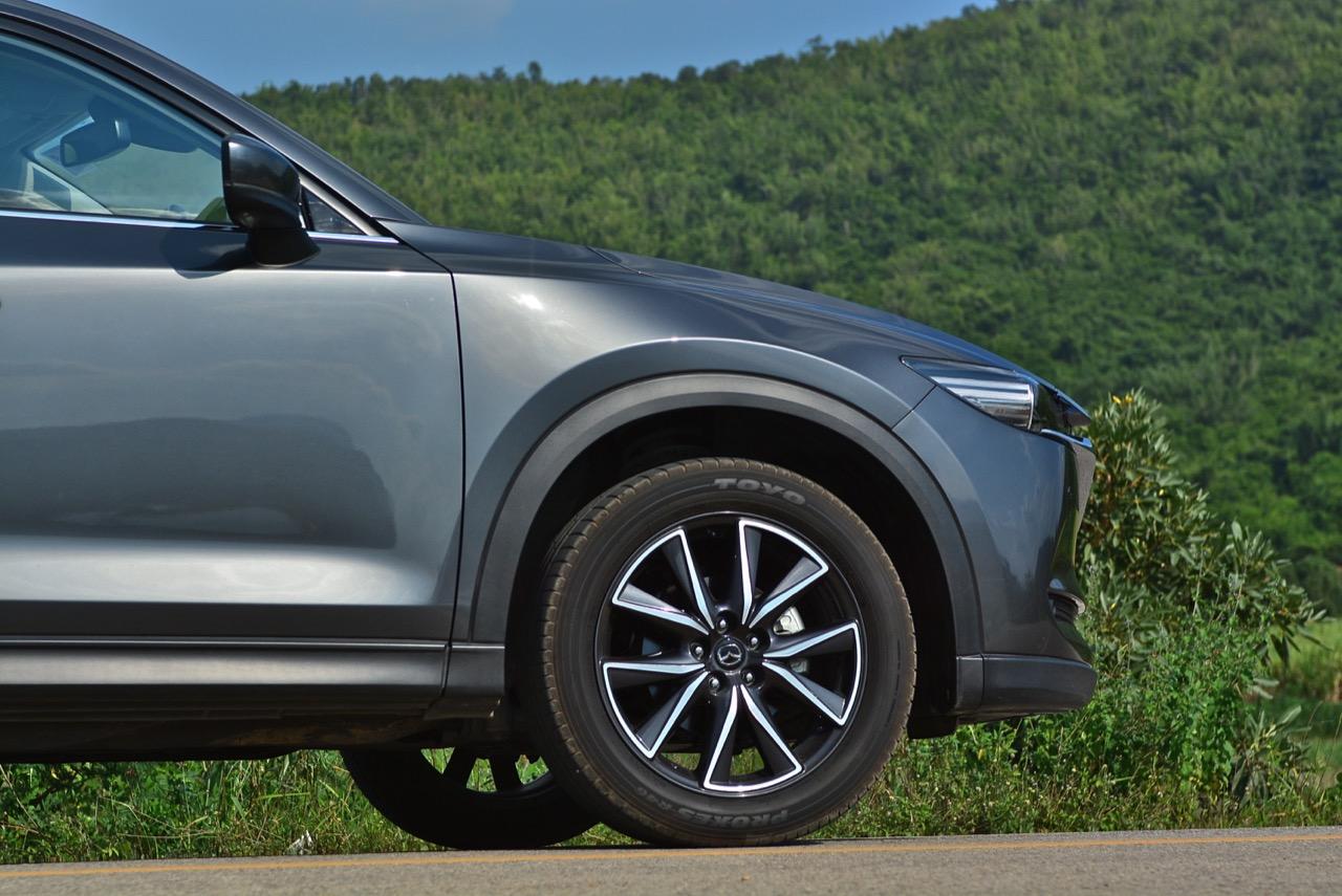 จุดยึดและมุมต่างๆ ของช่วงล่างใน New CX-5 แม้จะถูกปรับให้นิ่มลงก็ยังคงสอดคล้องกับความเป็นไดนามิก แชสซีส์และช่วงล่าง SkyAciv Chassis มอบความรู้สึกเป็นหนึ่งเดียวระหว่างคนขับและรถตามเอกลักษณ์ที่ Mazda ยึดถือ ด้วยคุณสมบัติของการออกแบบในเชิงเรขาคณิต เพื่อนำเอาส่วนที่ดีที่สุดของระบบรองรับมาปรับใช้ใน CX-5 ก่อให้เกิดการตอบสนองที่เป็นกลางของตัวรถในทุกๆ ย่านความเร็ว แม้จะผ่านการขับทดสอบอย่างหนักหน่วงของสื่อมวลชนมากถึง 21,293 กิโลเมตร แต่ช่วงล่างของรถทดสอบรุ่น 2.0 SP คันนี้ก็ยังปกติดี ไม่มีเสียงดัง หรือย้วยยวบยาบ ยาง TOYO Proxes R46 ไซล์ 225 /65 R17 ยังอยู่ในสภาพดีแต่ขอบยางด้านบนมีร่องรอยของการใช้งานหนักปรากฏให้เห็นอย่างเด่นชัด