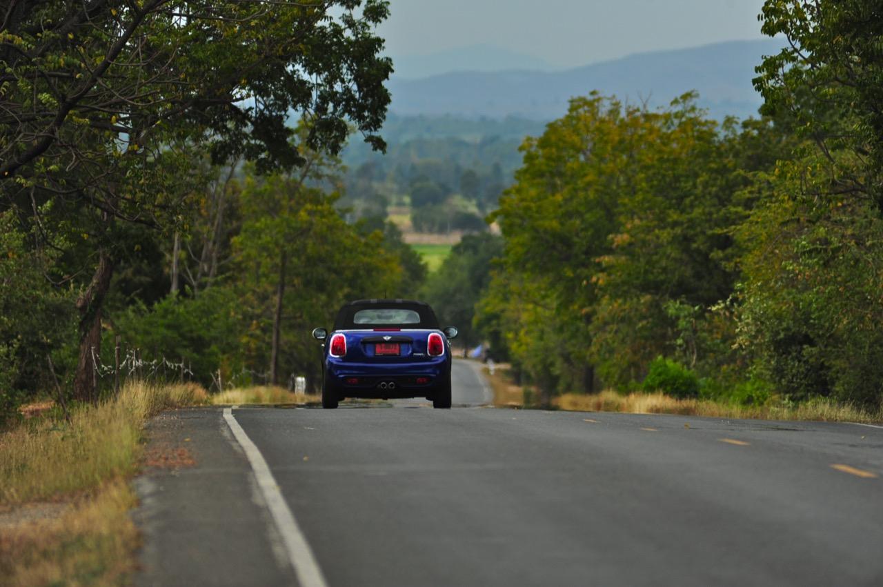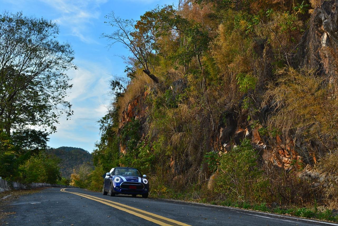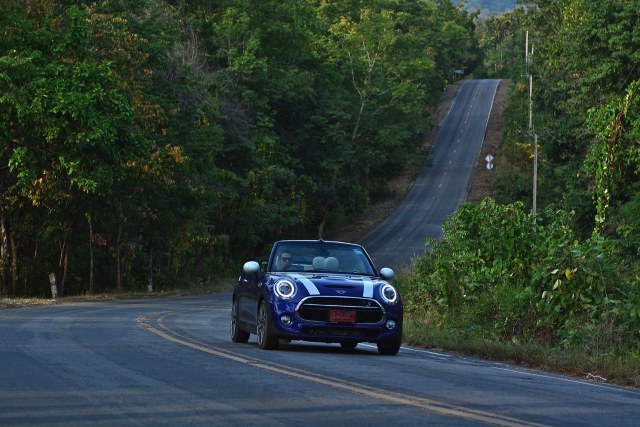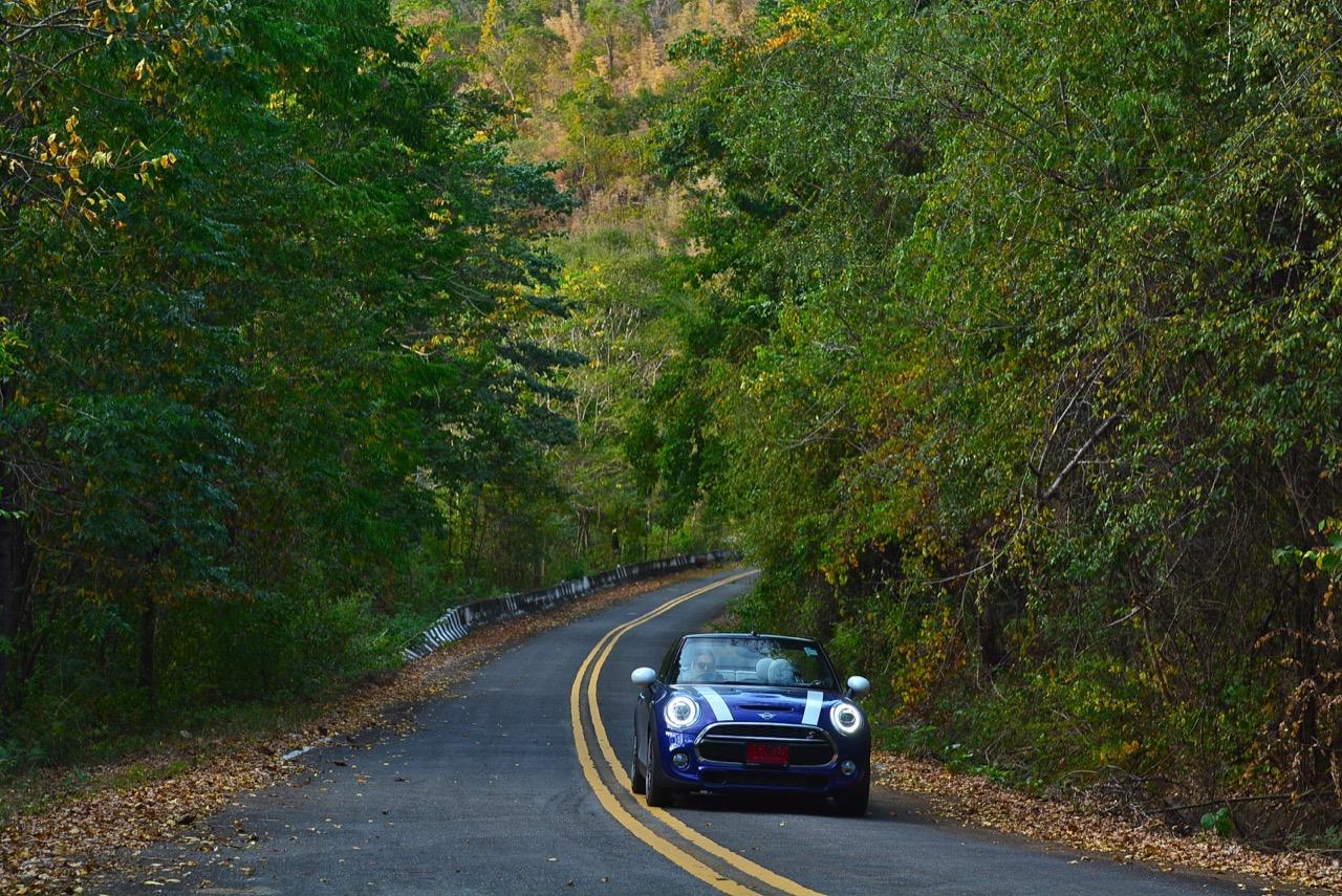 ความคล่องตัวกับรถขนาดเล็กนั้นเป็นของที่คู่กันแต่ MINI Cooper S Convertible ยังมีความสบายให้คุณได้ผ่อนคลายเวลาขับแบบเปิดหลังคา ความคล่องตัวช่วยทำให้การขับบนทางหลวงหมายเลข 4041 สมบูรณ์แบบมากยิ่งขึ้นเนื่องจากเป็นทางลาดยางสองเลนสวนที่คับแคบรกร้างว่างเปล่าท่ามกลางดงดิบของผืนป่าฝั่งตะวันตก เป็นเส้นทางที่วกไปวนมาหลังเขื่อนศรีนครินทร์ที่ไม่มีใครผ่านจากความเปลี่ยวของป่าที่เต็มไปด้วยภูเขาสูงชันซึ่งครอบคลุมจังหวัดกาญจนบุรี สุพรรณบุรี อุทัยธานีไปจนถึงจังหวัดตาก ล้อ 18 นิ้วกับยาง 205/40R18 มีแก้มที่เตี้ยติดพื้นทำให้ต้องระวังหลุมบนถนนที่มีอยู่ทั่วไปหมด เมื่อเปิดหลังคาแล้ววิ่งด้วยความเร็วต่ำมันก็เป็นรถที่ขับกินลมชมวิวได้ดีเหมือนรถเปิดประทุนทั่วไป กระจกบังลมบานประตูถ้ายกขึ้นมาก็ช่วยลดกระแสลมที่พัดเข้ามาในห้องโดยสารทำให้ทรงผมที่เซ็ตมาเป็นอย่างดีไม่ยุ่งเหยิงเป็นรังนกกระจาบ