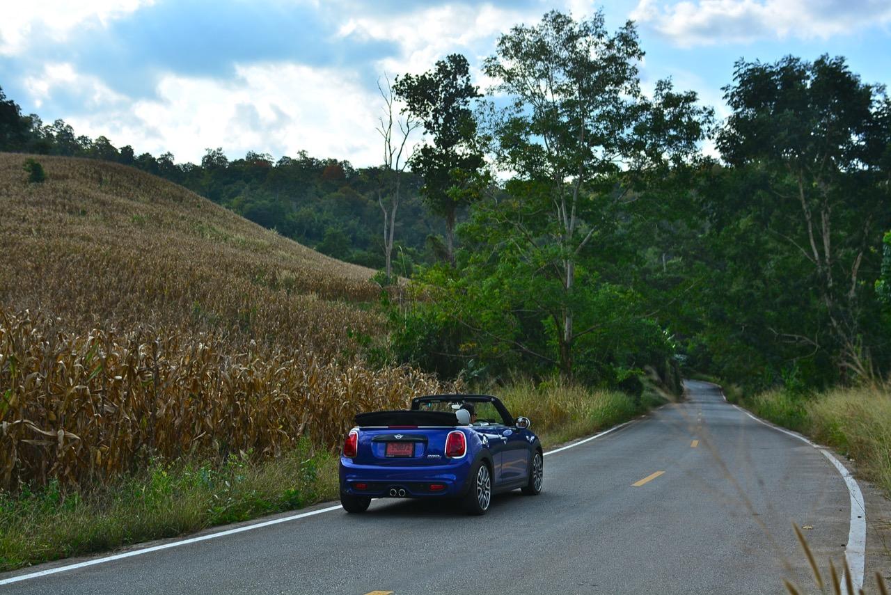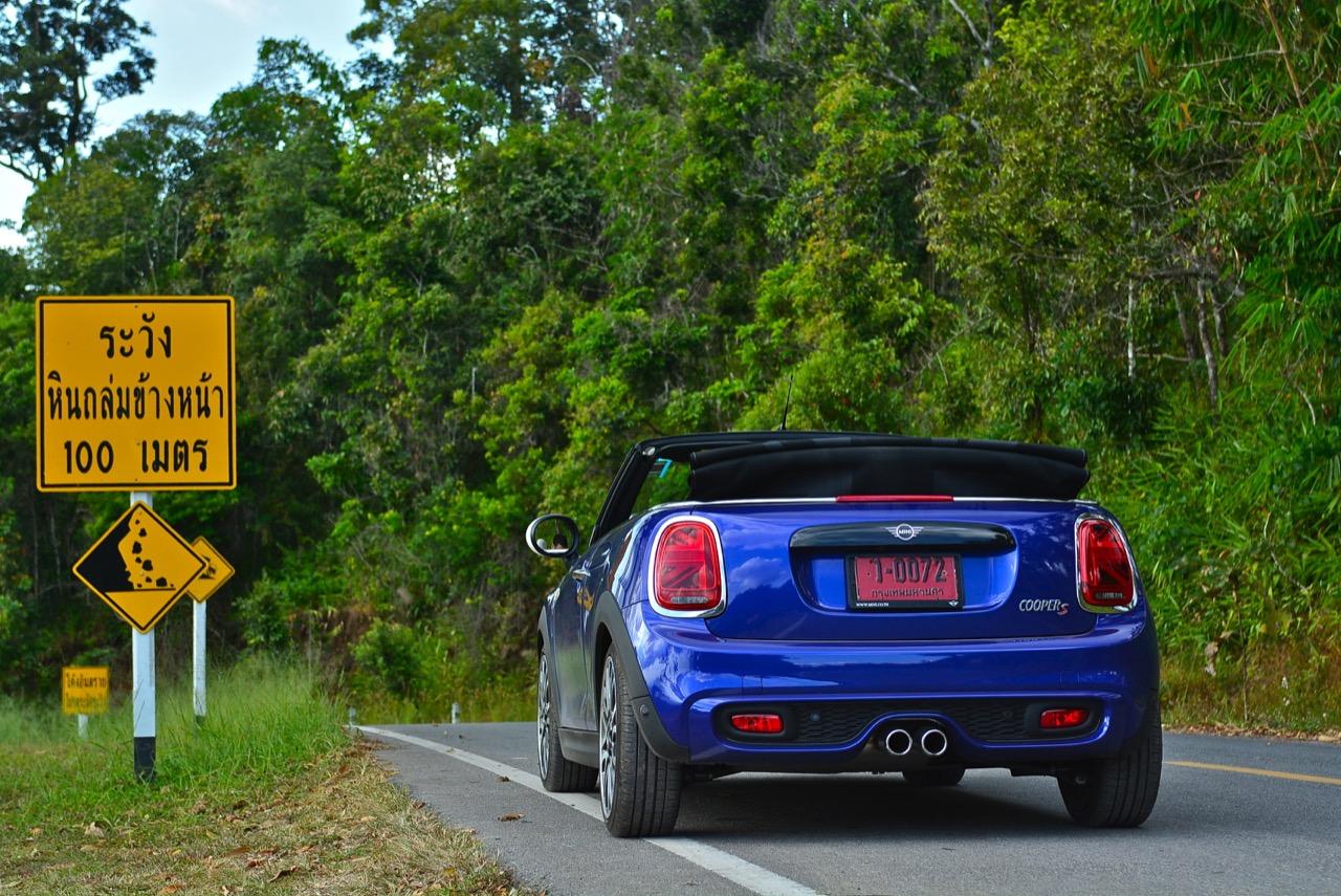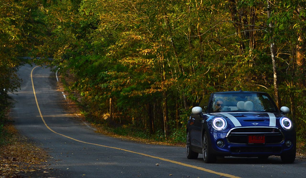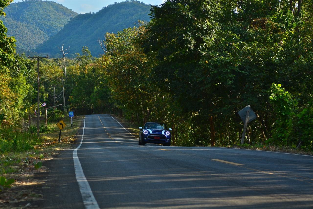 ความคล่องตัวกับรถขนาดเล็กนั้นเป็นของที่คู่กันแต่ MINI Cooper S Convertible ยังมีความสบายให้คุณได้ผ่อนคลายเวลาขับแบบเปิดหลังคา ความคล่องตัวช่วยทำให้การขับบนทางหลวงหมายเลข 4041 สมบูรณ์แบบมากยิ่งขึ้นเนื่องจากเป็นทางลาดยางสองเลนสวนที่คับแคบรกร้างว่างเปล่าท่ามกลางดงดิบของผืนป่าฝั่งตะวันตก เป็นเส้นทางที่วกไปวนมาหลังเขื่อนศรีนครินทร์ที่ไม่มีใครผ่านจากความเปลี่ยวของป่าที่เต็มไปด้วยภูเขาสูงชันซึ่งครอบคลุมจังหวัดกาญจนบุรี สุพรรณบุรี อุทัยธานีไปจนถึงจังหวัดตาก ล้อ 18 นิ้วกับยาง 205/40R18 มีแก้มที่เตี้ยติดพื้นทำให้ต้องระวังหลุมบนถนนที่มีอยู่ทั่วไปหมด เมื่อเปิดหลังคาแล้ววิ่งด้วยความเร็วต่ำมันก็เป็นรถที่ขับกินลมชมวิวได้ดีเหมือนรถเปิดประทุนทั่วไป กระจกบังลมบานประตูถ้ายกขึ้นมาก็ช่วยลดกระแสลมที่พัดเข้ามาในห้องโดยสารทำให้ทรงผมที่เซ็ตมาเป็นอย่างดีไม่ยุ่งเหยิงเป็นรังนกกระจาบ