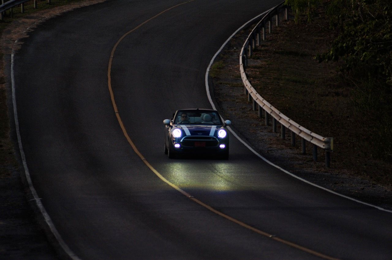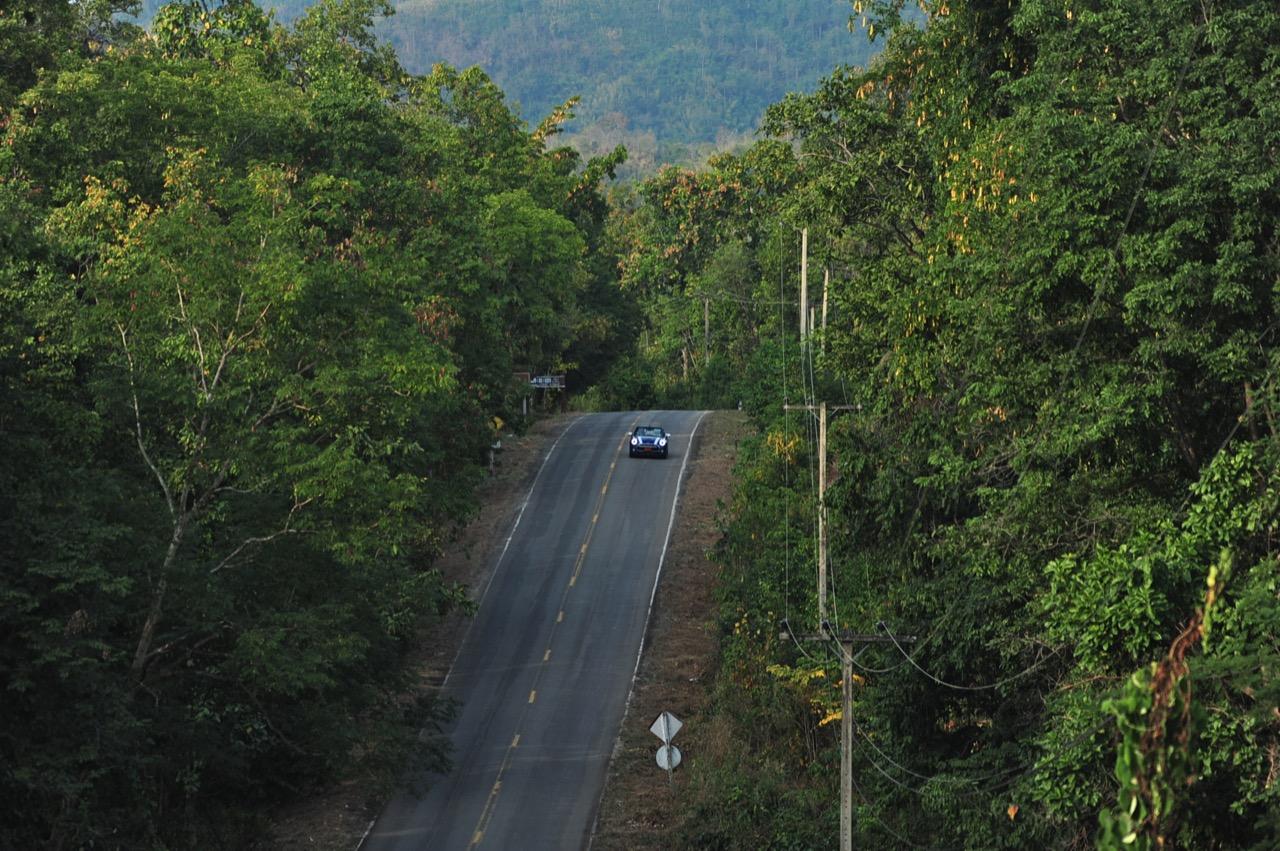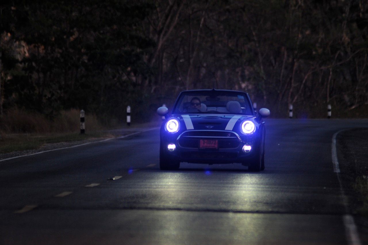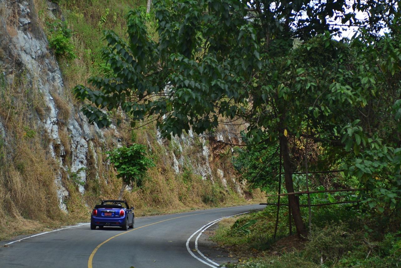 ความคล่องตัวกับรถขนาดเล็กนั้นเป็นของที่คู่กันแต่ MINI Cooper S Convertible ยังมีความสบายให้คุณได้ผ่อนคลายเวลาขับแบบเปิดหลังคา ความคล่องตัวช่วยทำให้การขับบนทางหลวงหมายเลข 4041 สมบูรณ์แบบมากยิ่งขึ้นเนื่องจากเป็นทางลาดยางสองเลนสวนที่คับแคบรกร้างว่างเปล่าท่ามกลางดงดิบของผืนป่าฝั่งตะวันตก เป็นเส้นทางที่วกไปวนมาหลังเขื่อนศรีนครินทร์ที่ไม่มีใครผ่านจากความเปลี่ยวของป่าที่เต็มไปด้วยภูเขาสูงชันซึ่งครอบคลุมจังหวัดกาญจนบุรี สุพรรณบุรี อุทัยธานีไปจนถึงจังหวัดตาก ล้อ 18 นิ้วกับยาง 205/40R18 มีแก้มที่เตี้ยติดพื้นทำให้ต้องระวังหลุมบนถนนที่มีอยู่ทั่วไปหมด เมื่อเปิดหลังคาแล้ววิ่งด้วยความเร็วต่ำมันก็เป็นรถที่ขับกินลมชมวิวได้ดีเหมือนรถเปิดประทุนทั่วไป กระจกบังลมบานประตูถ้ายกขึ้นมาก็ช่วยลดกระแสลมที่พัดเข้ามาในห้องโดยสารทำให้ทรงผมที่เซ็ตมาเป็นอย่างดีไม่ยุ่งเหยิงเป็นรังนกกระจาบ