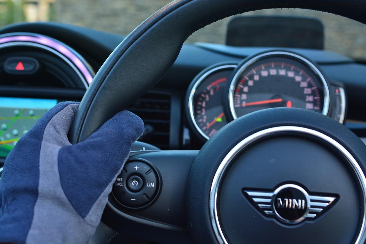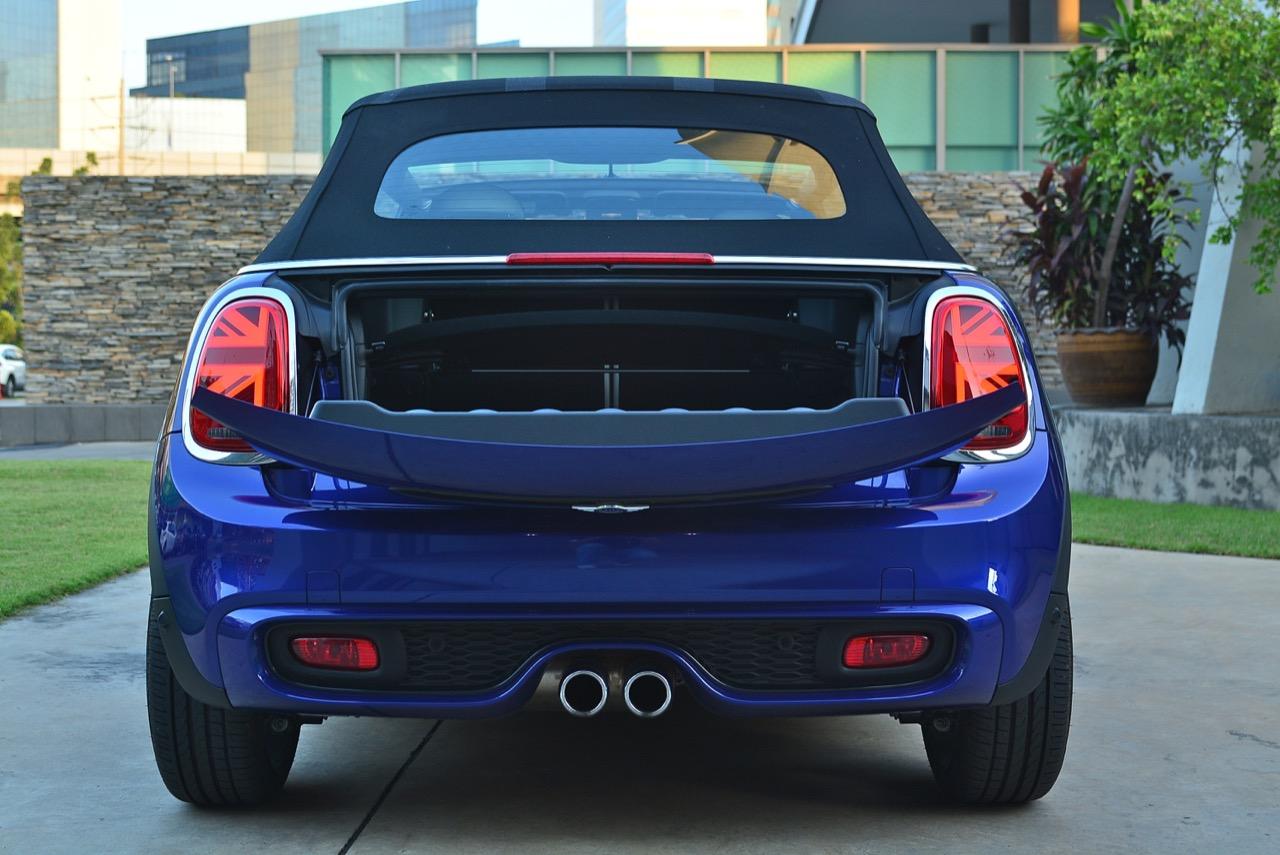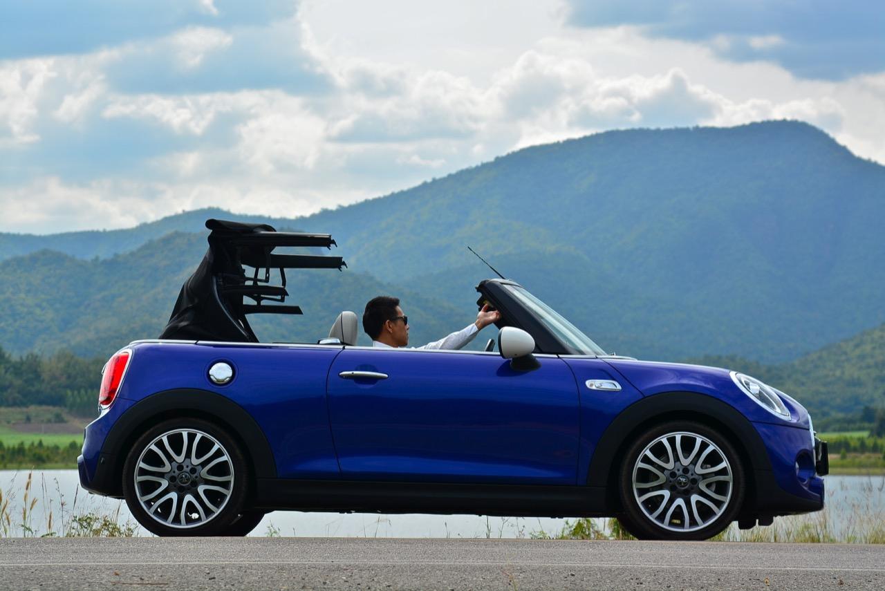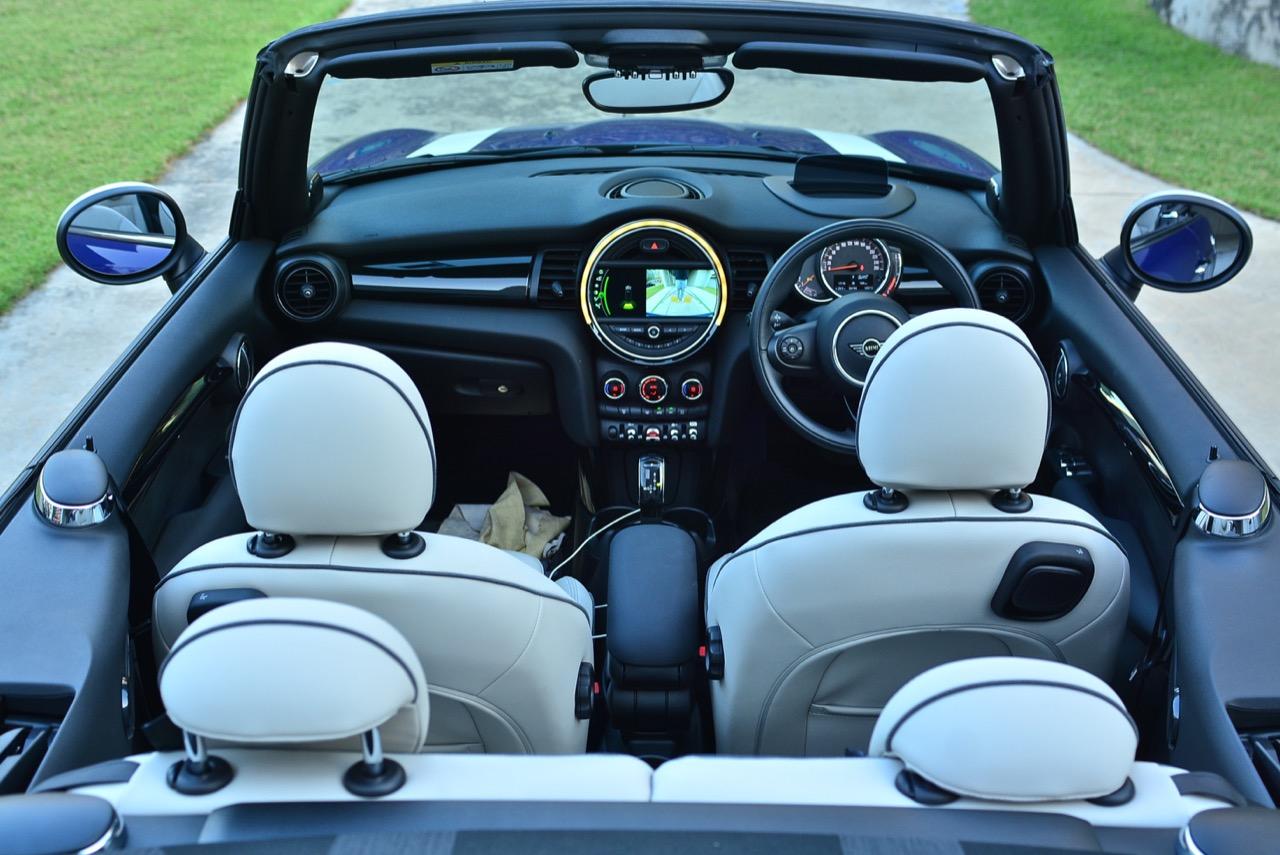 MINI Cooper S Convertible นำเสนอความเพลิดเพลินแบบเปิดโล่งที่แท้จริง อย่างแรกคือหลังคาผ้าใบประทับตราธงยูเนี่ยนแจ็คแบบซอฟต์ท็อปที่ขับเคลื่อนด้วยมอเตอร์และกลไกของการพับเก็บที่ค่อนข้างสลับซับซ้อน หลังคาผ้าทำงานด้วยระบบไฟฟ้านั้นแตกต่างจากหลังคาผ้าในอดีต กลไก Z-fold ที่ทำงานเงียบกริบ ไม่ว่าจะกดปุ่มเพื่อพับหลังคาเก็บสำหรับการขับกินลมชมวิวในช่วงอากาศเย็นแบบนี้ หรือกางออกเพื่อปิดคลุมห้องโดยสารในวันที่ร้อนจัด การทำงานแบ่งออกเป็น 3 ขั้นตอน จะเปิดแบบหลังคาถลกเหมือน MINI ในอดีตก็ยังได้ หรือพับเก็บทั้งหมดเพื่อแปลงร่างเป็นรถเปิดประทุนเต็มรูปแบบ หลังคาผ้าไฟฟ้าน้ำหนักเบาทำงานแค่ 18 วินาที คุณสามารถพับเก็บหรือกางออกที่ความเร็วไม่เกิน 30 กิโลเมตรต่อชั่วโมง กลางผืนหลังคาพ่นสีตราธง Union Jack เป็นเอกลักษณ์ที่บ่งบอกตัวตนของรถรุ่นนี้ได้เป็นอย่างดี หลังคาผ้าสามารถทำความสะอาดได้โดยใช้น้ำฉีดล้างเพื่อขจัดฝุ่นละออง
