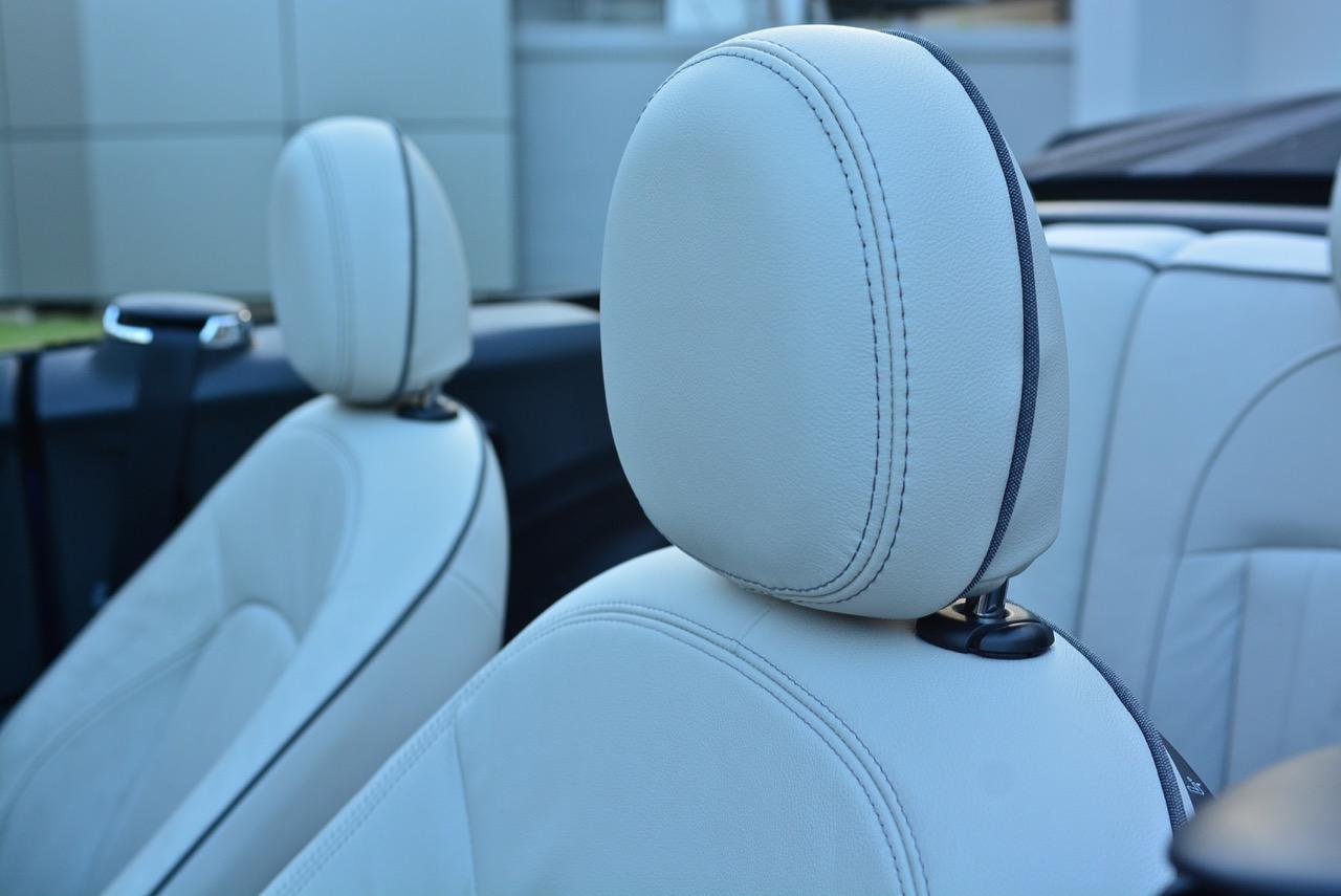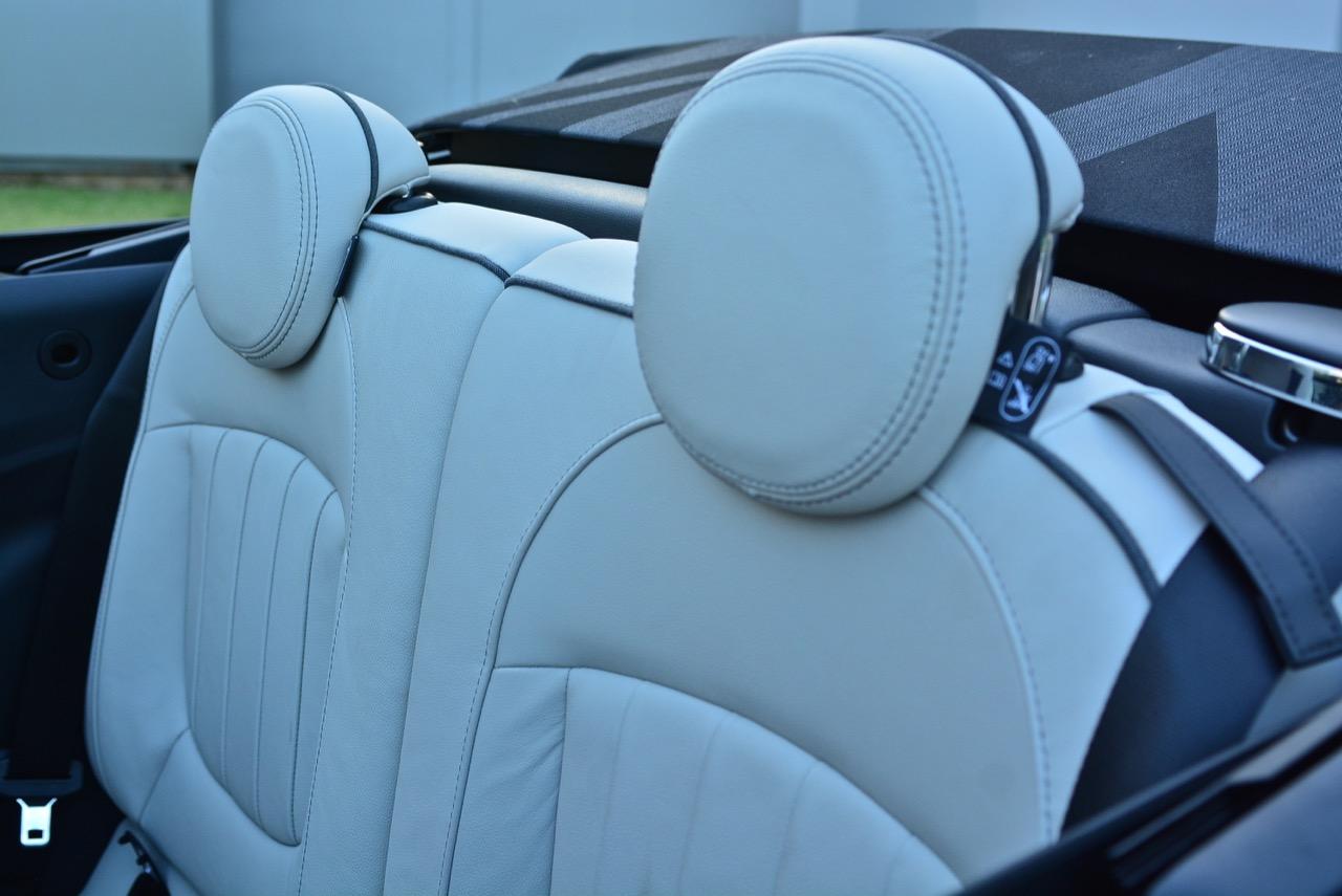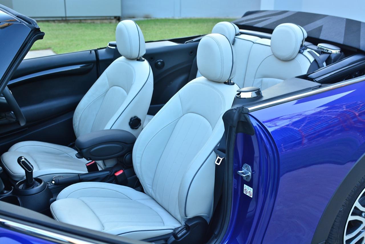 MINI Cooper S Convertible F57 เวอร์ชั่นปรับโฉม LCI มีเบาะนั่งสีขาวนุ่มนิ่มน่านั่ง เบาะสามารถปรับให้ท่านั่งขับต่ำเตี้ยติดพื้นแบบสปอร์ต เบาะคนนั่งและคนขับยังคงใช้การปรับเบาะด้วยมือล้วนๆ ผ่านกลไกการปรับเบาะสำหรับการเลื่อนเดินหน้า ถอยหลัง หรือยกขึ้นลงออกมาในแนวดิบๆ ตำแหน่งของการนั่งใน MINI Cooper S เวอร์ชั่นปรับโฉมให้สัมผัสที่พอดิบพอดีสำหรับคนที่มีรูปร่างปกติ เบาะแบบสปอร์ตหุ้มหนังแท้สีขาวสะอาดตา ตัวเบาะออกแบบให้โอบรัดแผ่นหลัง ทำให้รู้สึกถึงความกระชับยามนั่ง การออกแบบใหม่ในบางจุดโดยยังคงการจัดวางแบบเดิม ทำให้ห้องโดยสารของ Cooper S Convertible กว้างขึ้นเล็กน้อย ทรงของตัวรถที่สั้นและมีฐานล้อไม่ยาวเกินไป ทำให้ความรู้สึกไม่ว่าจะขับช้าหรือขับเร็ว ล้วนแล้วแต่ตอบสนองออกมาในแนวคล่องตัวว่องไว เหมาะกับการซอกแซกไปบนถนนเส้นเล็กๆ ในเมือง