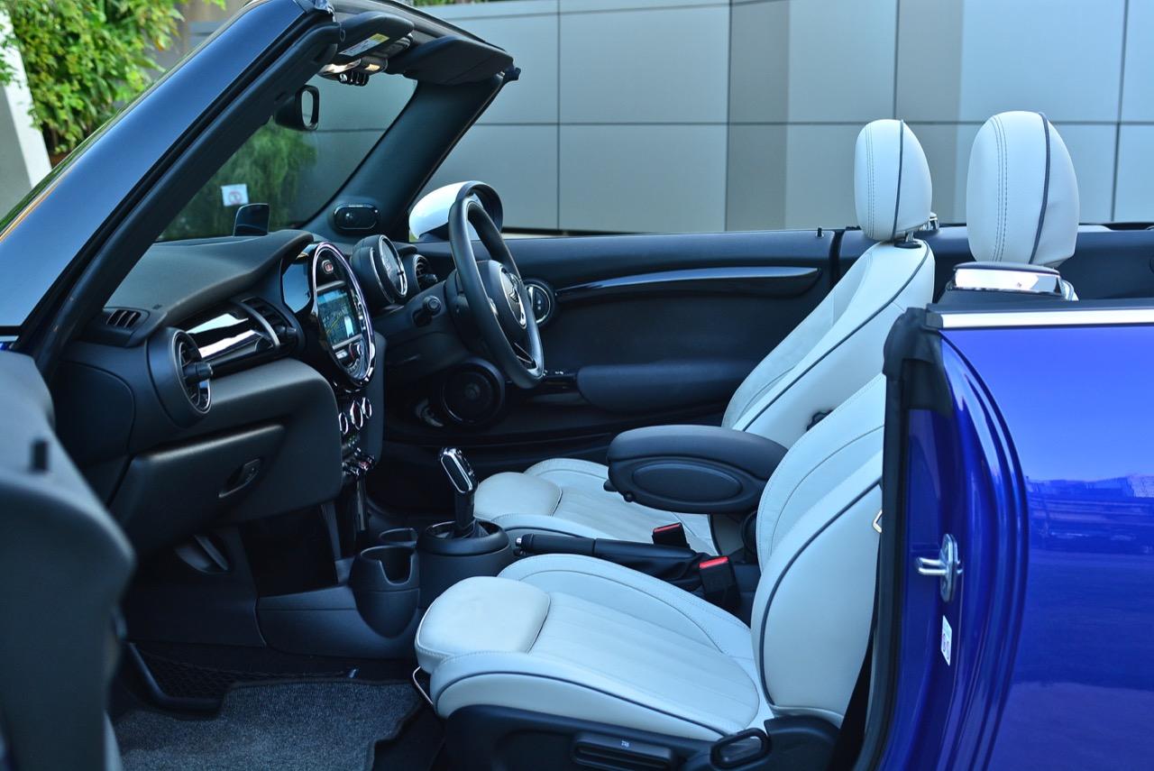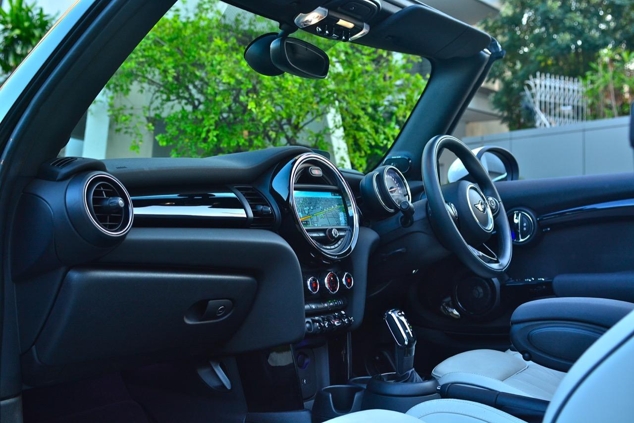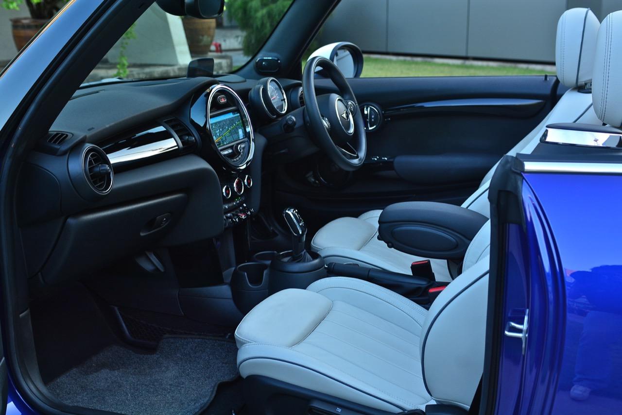 ดีไซน์ภายในของ MINI ใน Cooper S รุ่นเปิดประทุน Convertible ค่อนข้างโดนใจวัยรุ่นในปัจจุบันจากรูปแบบที่ทันสมัย มาพร้อมหน้าจอแสดงผล และคอนเซปต์การทำงานแบบใหม่ ความกว้างที่เพิ่มขึ้นมอบพื้นที่กว้างขวาง โดยเฉพาะในเบาะนั่งทั้งสี่ที่ ที่นั่งด้านหน้าปรับตำแหน่งได้ครอบคลุมทุกสรีระของผู้ขับ และเพิ่มพื้นที่เบาะโดยสารด้านหลังมากกว่าเดิมถึง 23 มิลลิเมตร แม้ขนาดตัวถังจะเล็กแต่ภายในที่ถูกขยับขยายพื้นที่ใช้สอยช่วยสร้างความรู้สึกโปร่งโล่งให้ผู้โดยสารตอนหลัง ด้วยพื้นที่ช่วงไหล่และพื้นที่วางขาที่เพิ่มมากขึ้น เบาะหลังยังสามารถพับแยกได้แบบ 60:40 สำหรับช่องเก็บสัมภาระที่กระโปรงหลังเพิ่มความจุมากขึ้น 51 ลิตร รวมเป็น 211 ลิตร เพิ่มพื้นที่เพื่อรองรับการบรรทุกสัมภาระ หัวใจสำคัญของการออกแบบใหม่ล่าสุดก็คือ หน้าจอแสดงผล และคอนเซปต์การทำงานรูปแบบใหม่ บนแผงหน้าปัดบริเวณแกนพวงมาลัย ด้วยหน้าปัดดีไซน์วงกลมสไตล์ MINI แสดงผลความเร็วอัตราเร่ง และมาตรวัดปริมาณน้ำมันเชื้อเพลิงแบบใหม่ล่าสุด