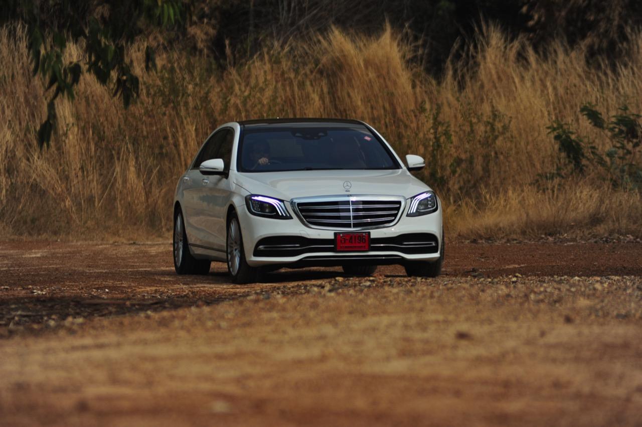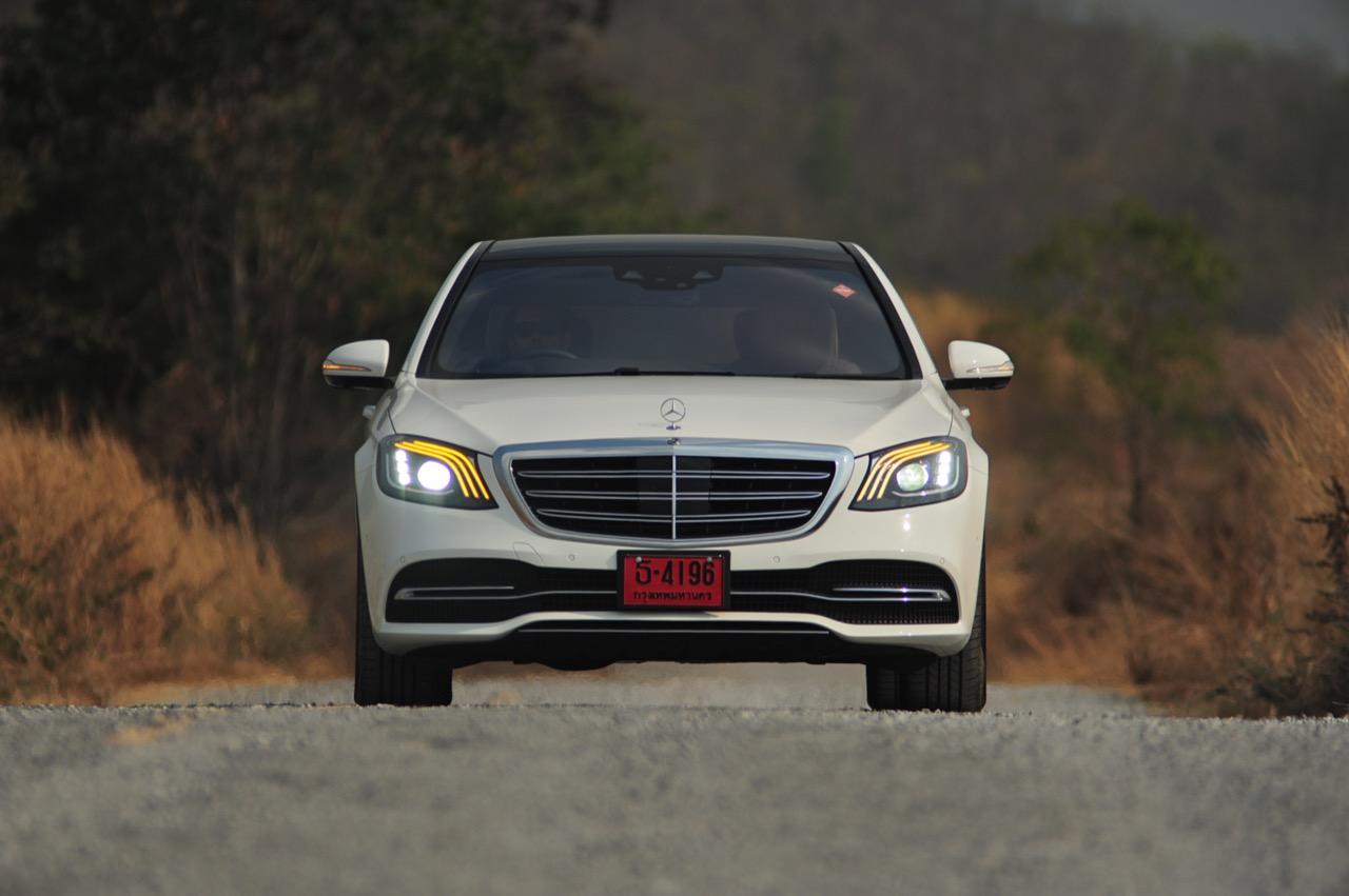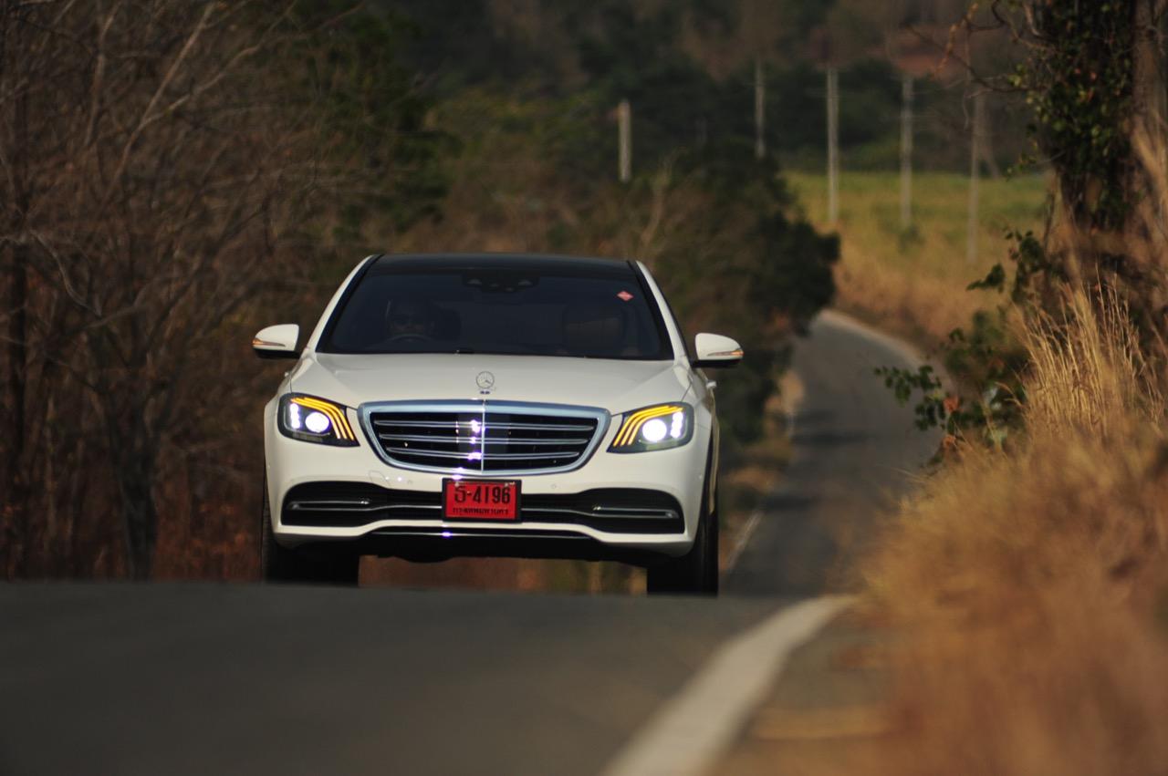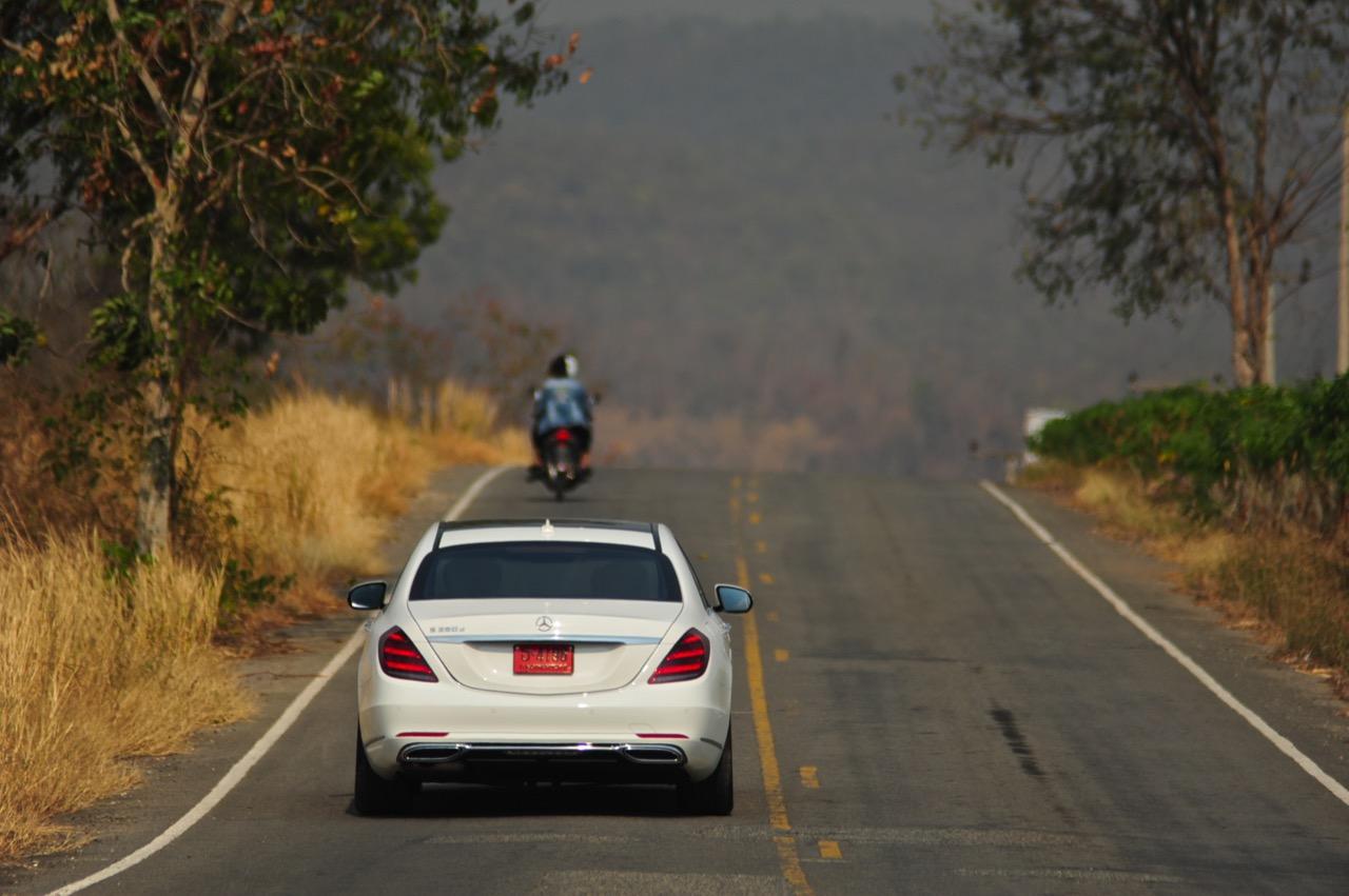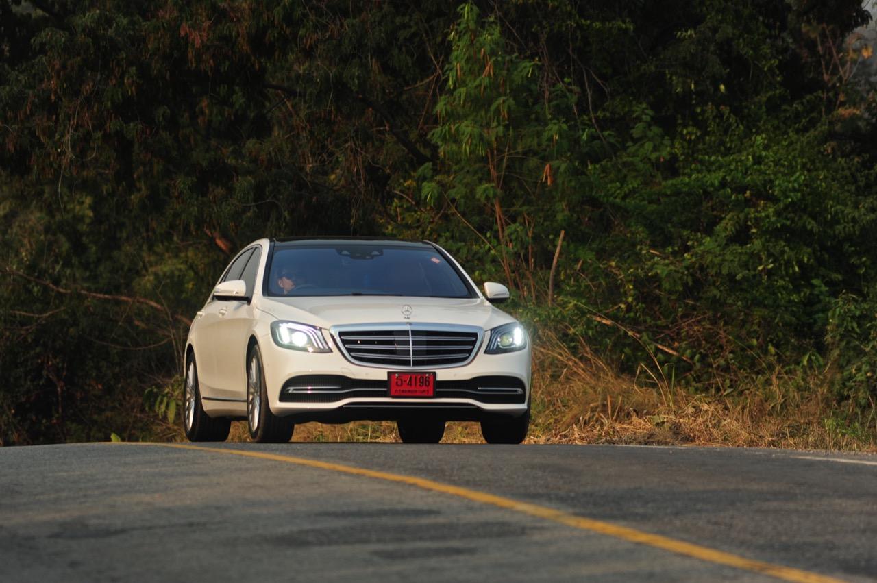 เมื่อกำลังโลดแล่นอยู่ในเรือธงตราดาวที่วิ่งได้อย่างนุ่มนวลบนถนนสองเลนที่ต้องขับขึ้น-ลงเนินเขาเตี้ยๆ ในเขตจังหวัดกาญจนบุรี ภายในห้องโดยสารรายล้อมไปด้วยงานลายไม้ พลาสติก ผ้าและหนังแท้นุ่มละมุน ระบบปรับอากาศที่มีฟังก์ชั่นเพียบ จอภาพ 12.3 นิ้วแสดงผลระบบนำทางด้วยดาวเทียมในรูปแบบ 3D ที่ชัดแจ๋ว ขณะที่เครื่องเสียง Burmester Audiosound System 13 Speaker กำลังเล่นเพลง Jazz และเมื่อมีเสียงโทรศัพท์เรียกเข้าก็แค่กดปุ่มรับสายในระบบบลูทูธ S-Class รุ่นปรับโฉมเป็นการนำเสนอสิ่งดีๆ ที่เคยโดดเด่นและโด่งดังของ Mercedes-Benz ให้กลับมายิ่งใหญ่เหมือนในอดีต ตัวถังช่วงฐานล้อยาว long wheelbase มีภายที่ที่หุ้มหนังแท้จากพื้นเกือบจะถึงเพดานรถ พรมหนาเป็นพิเศษเพื่อเพิ่มความนุ่มและช่วยลดเสียงแปลกปลอมจากภายนอก S350d Exclusive เป็นตัวอย่างที่ดีของการผสมผสานกันระหว่างสมรรถนะกับประสิทธิภาพ ความคล่องตัวกับความนุ่มนวล รวมถึงความเป็นส่วนตัวของผู้โดยสารตอนหลัง ช่วงล่าง AIRMATIC ใช้ถุงลมปรับระดับความสูง-ต่ำแบบอัตโนมัติหรือจะเลือกปรับเองก็ยังได้ ช่วยทำให้ S350d เป็นได้ทั้งยานพาหนะที่ใช้สำหรับขับทางไกลหรือแปลงกายเป็นออฟฟิศส่วนตัวสำหรับนั่งทำงานเวลาเดินทาง โหมด Comfort สบายคล้ายกับ Series-7 คุณจะสัมผัสได้ถึงความใหญ่โตและน้ำหนักของมันเมื่อต้องเลี้ยวโค้งในย่านความเร็วสูง โหมดสปอร์ตลดความสูงลงโดยอัตโนมัติและเปิดทุกสิ่งทุกอย่างเพื่อการขับที่เร็วขึ้น Sport Mode ให้ความรู้สึกถึงความมั่นคงของตัวถังและพวงมาลัยโดยไม่มีความจำเป็นต้องยัดล้อขนาดใหญ่ที่สิ้นเปลืองเชื้อเพลิงและขับยากจากแก้มยางที่ต่ำเตี้ย Sport Mode มีช่วงล่างที่ค่อนข้างยืดหยุ่น ซึ่งคุณสามารถปรับเอาไว้ตรงนั้นและไม่จำเป็นต้องไปยุ่งกับมันให้มากเรื่อง
