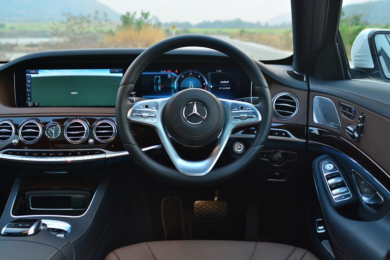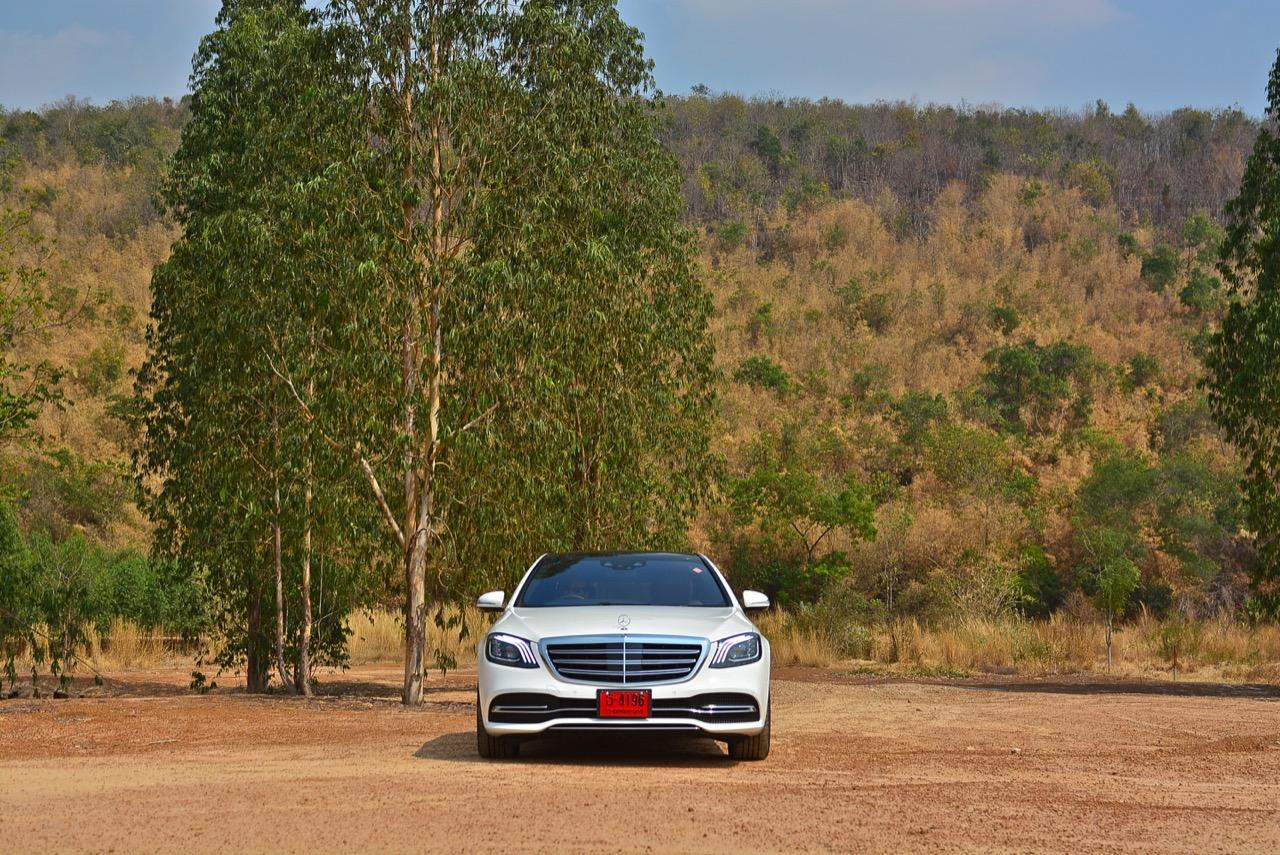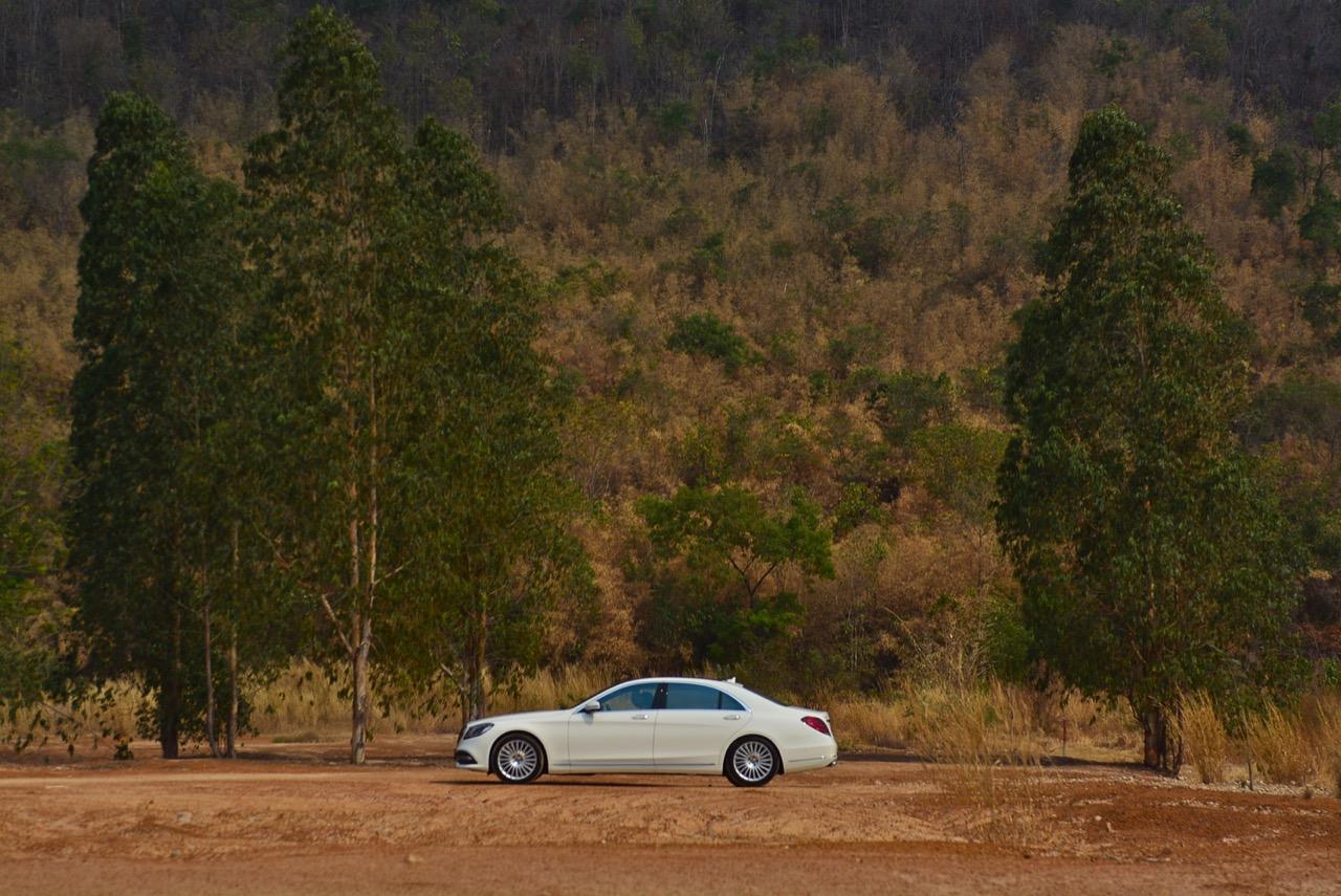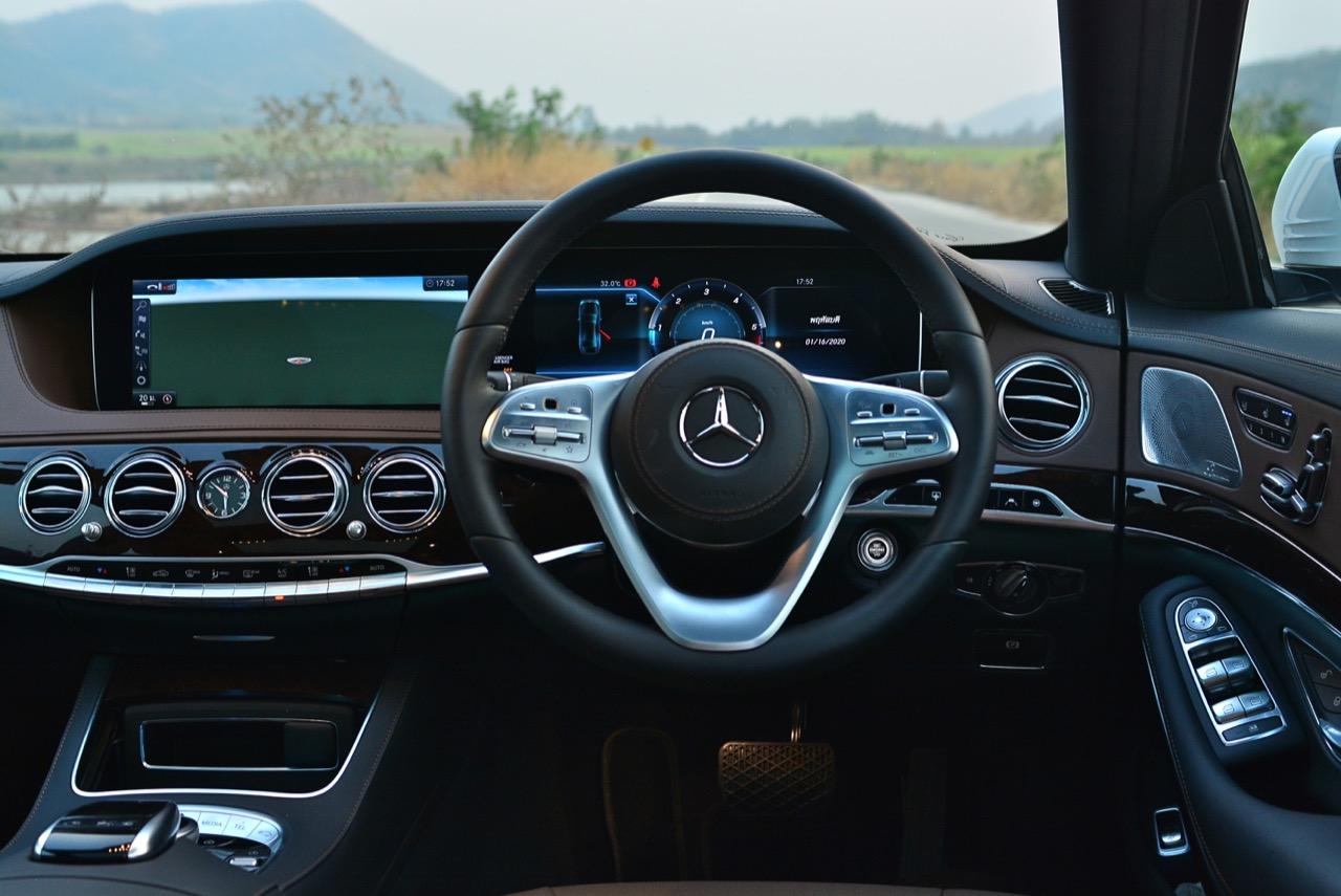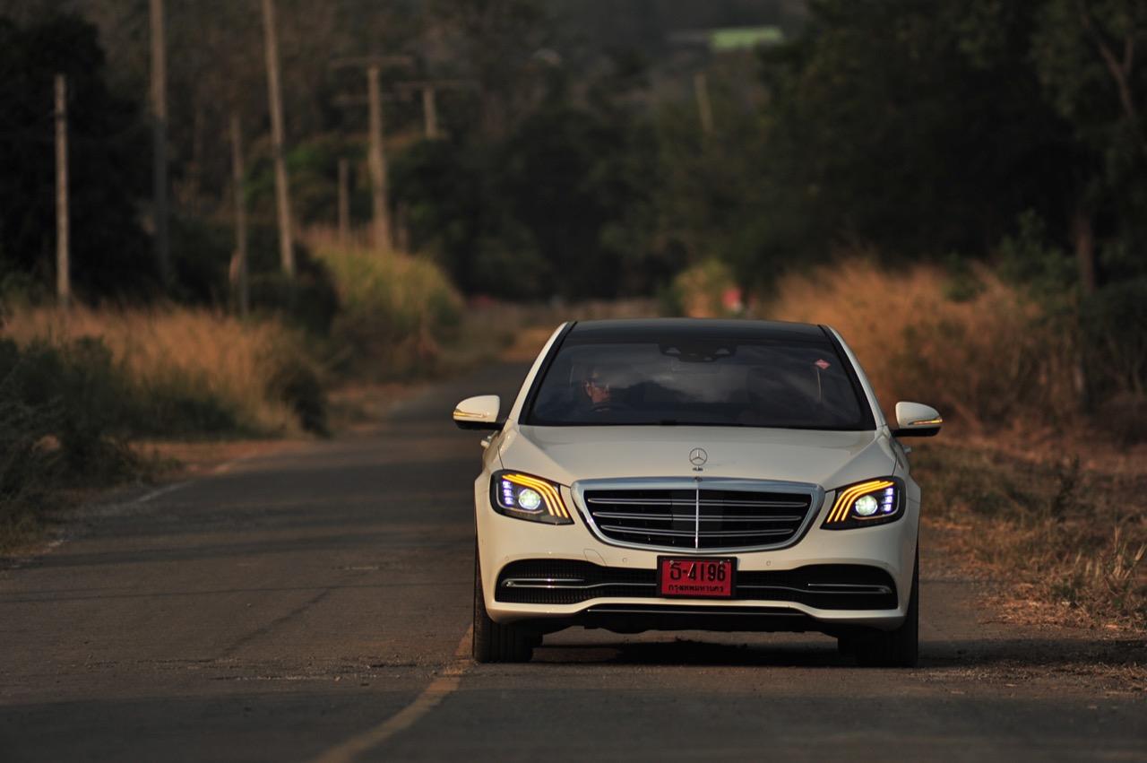 เมื่อกำลังโลดแล่นอยู่ในเรือธงตราดาวที่วิ่งได้อย่างนุ่มนวลบนถนนสองเลนที่ต้องขับขึ้น-ลงเนินเขาเตี้ยๆ ในเขตจังหวัดกาญจนบุรี ภายในห้องโดยสารรายล้อมไปด้วยงานลายไม้ พลาสติก ผ้าและหนังแท้นุ่มละมุน ระบบปรับอากาศที่มีฟังก์ชั่นเพียบ จอภาพ 12.3 นิ้วแสดงผลระบบนำทางด้วยดาวเทียมในรูปแบบ 3D ที่ชัดแจ๋ว ขณะที่เครื่องเสียง Burmester Audiosound System 13 Speaker กำลังเล่นเพลง Jazz และเมื่อมีเสียงโทรศัพท์เรียกเข้าก็แค่กดปุ่มรับสายในระบบบลูทูธ S-Class รุ่นปรับโฉมเป็นการนำเสนอสิ่งดีๆ ที่เคยโดดเด่นและโด่งดังของ Mercedes-Benz ให้กลับมายิ่งใหญ่เหมือนในอดีต ตัวถังช่วงฐานล้อยาว long wheelbase มีภายที่ที่หุ้มหนังแท้จากพื้นเกือบจะถึงเพดานรถ พรมหนาเป็นพิเศษเพื่อเพิ่มความนุ่มและช่วยลดเสียงแปลกปลอมจากภายนอก S350d Exclusive เป็นตัวอย่างที่ดีของการผสมผสานกันระหว่างสมรรถนะกับประสิทธิภาพ ความคล่องตัวกับความนุ่มนวล รวมถึงความเป็นส่วนตัวของผู้โดยสารตอนหลัง ช่วงล่าง AIRMATIC ใช้ถุงลมปรับระดับความสูง-ต่ำแบบอัตโนมัติหรือจะเลือกปรับเองก็ยังได้ ช่วยทำให้ S350d เป็นได้ทั้งยานพาหนะที่ใช้สำหรับขับทางไกลหรือแปลงกายเป็นออฟฟิศส่วนตัวสำหรับนั่งทำงานเวลาเดินทาง โหมด Comfort สบายคล้ายกับ Series-7 คุณจะสัมผัสได้ถึงความใหญ่โตและน้ำหนักของมันเมื่อต้องเลี้ยวโค้งในย่านความเร็วสูง โหมดสปอร์ตลดความสูงลงโดยอัตโนมัติและเปิดทุกสิ่งทุกอย่างเพื่อการขับที่เร็วขึ้น Sport Mode ให้ความรู้สึกถึงความมั่นคงของตัวถังและพวงมาลัยโดยไม่มีความจำเป็นต้องยัดล้อขนาดใหญ่ที่สิ้นเปลืองเชื้อเพลิงและขับยากจากแก้มยางที่ต่ำเตี้ย Sport Mode มีช่วงล่างที่ค่อนข้างยืดหยุ่น ซึ่งคุณสามารถปรับเอาไว้ตรงนั้นและไม่จำเป็นต้องไปยุ่งกับมันให้มากเรื่อง