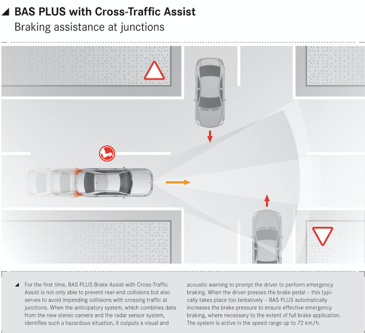 เทคโนโลยีที่ช่วยหลีกเลี่ยงการชนกับรถยนต์คันอื่นหรือคนเดินถนนในบริเวณทางแยก ใช้สัญญาณเรดาร์ที่ติดอยู่บริเวณกันชนด้านหน้าและกล้อง MPC ทำหน้าที่ตรวจจับเหตุการณ์ที่อาจก่อให้เกิดความเสี่ยงต่อการชน ระบบจะส่งเสียงเตือนให้เบรก หากคุณตอบสนอง ระบบจะช่วยเพิ่มกำลังเบรกจนเต็มประสิทธิภาพ แต่หากไม่มีการตอบสนอง ระบบจะช่วยเบรกอัตโนมัติตามแต่ละสถานการณ์ นอกจากนี้ในกรณีที่ระบบไม่สามารถหลบหลีกวัตถุด้านหน้าได้ทัน ระบบจะช่วยลดความเร็วลง เพื่อช่วยลดความรุนแรงของอุบัติเหตุ