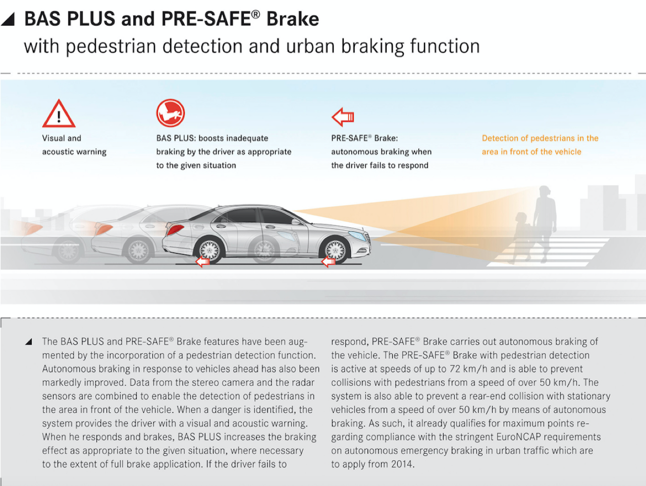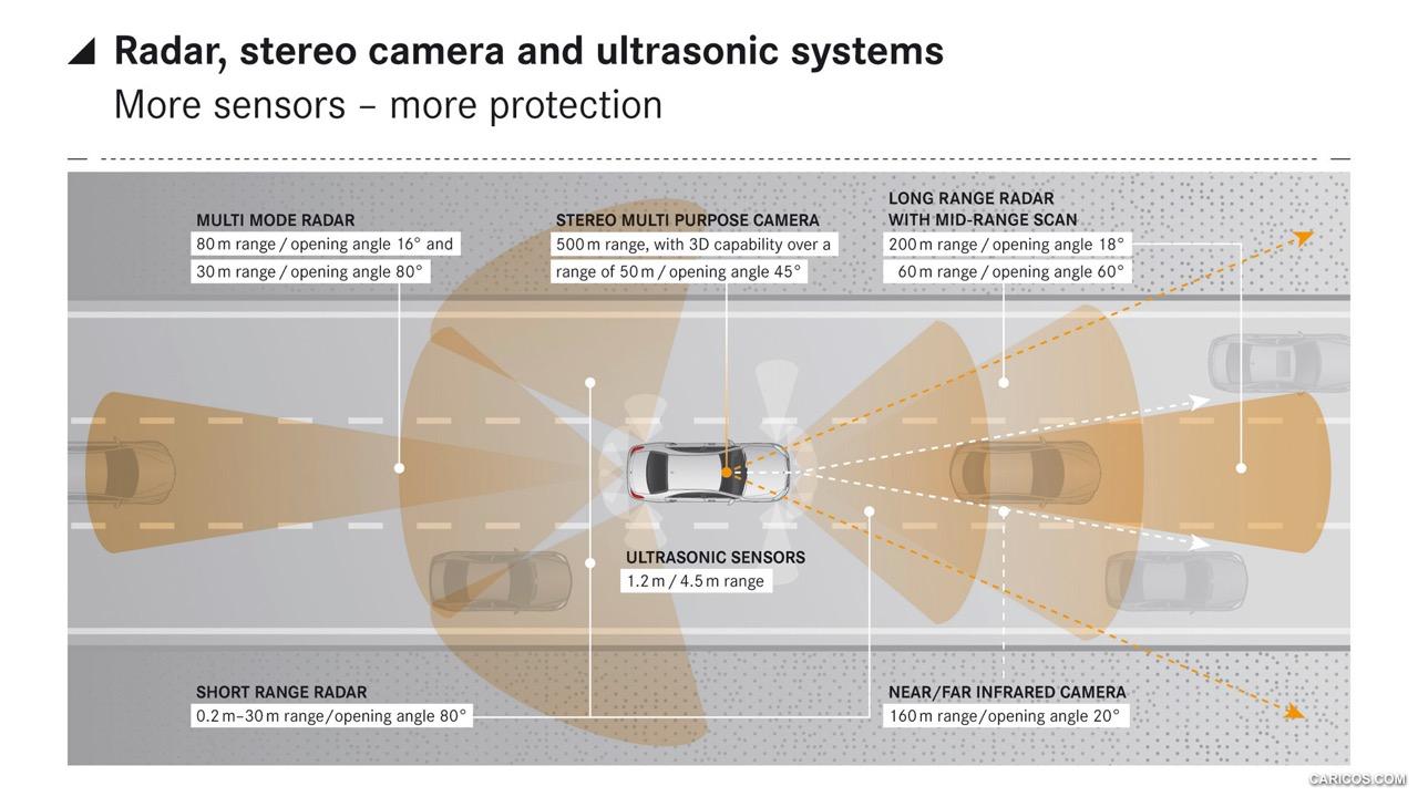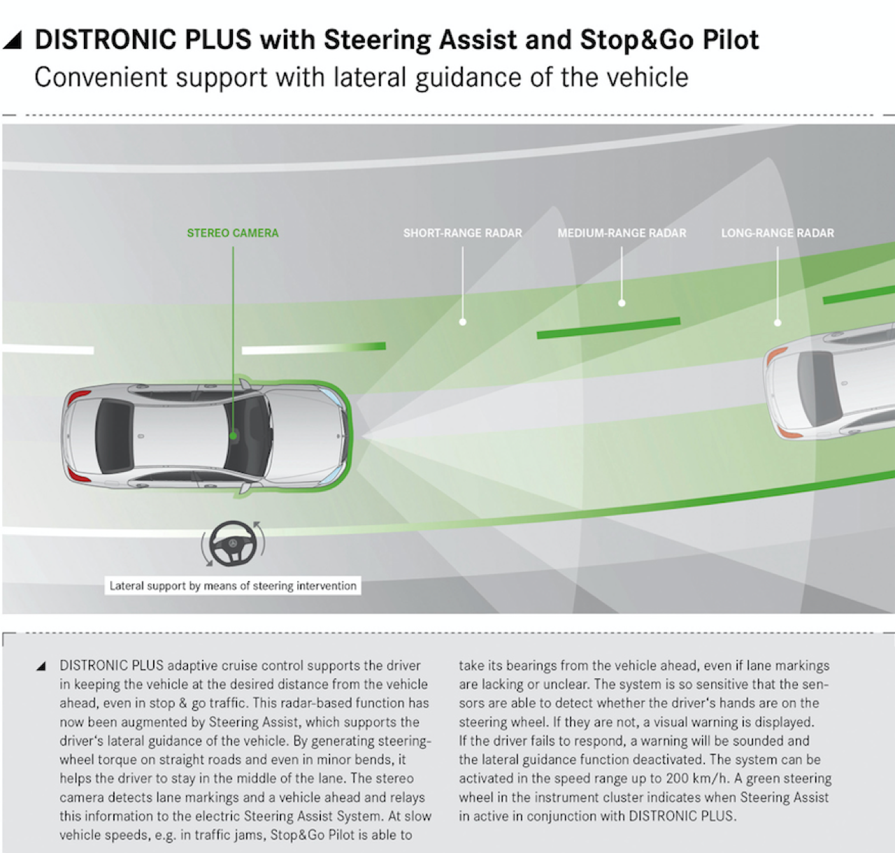 ระบบช่วยรักษาระยะห่างจากรถที่อยู่ด้านหน้า หรือ Active Distance Assist DISTRONIC ทำงานโดยใช้สัญญาณเรดาร์ที่ติดตั้งบริเวณกันชนหน้าในการคำนวณระยะห่างที่ปลอดภัยจากรถคันหน้าที่สัมพันธ์กับความเร็วของรถในขณะนั้น และลดความเร็วของรถโดยอัตโนมัติ รวมทั้งช่วยเบรกด้วยแรงเบรกประมาณ 50% ของแรงเบรกปกติ เพื่อรักษาระยะห่างตามที่ผู้ขับขี่กำหนด ระบบสามารถลดความเร็วของรถลงจนกระทั่งหยุดนิ่งตามรถยนต์คันที่อยู่ด้านหน้า ควบคุมรถให้เร่งออกตัวตามรถยนต์คันที่อยู่ด้านหน้า หากรถยนต์คันที่อยู่ด้านหน้าหยุดนิ่งเป็นเวลาไม่เกิน 3 วินาที แล้วเคลื่อนที่ต่อไป ระบบนี้ทำงานร่วมกับ Active Steering Assist นอกจากนี้ระบบ Active Distance Assist DISTRONIC จะวิเคราะห์ทางโค้งและการขับวนวงเวียนพร้อมควบคุมและปรับเปลี่ยนความเร็วในกรณีที่ไม่มีรถอยู่ด้านหน้า