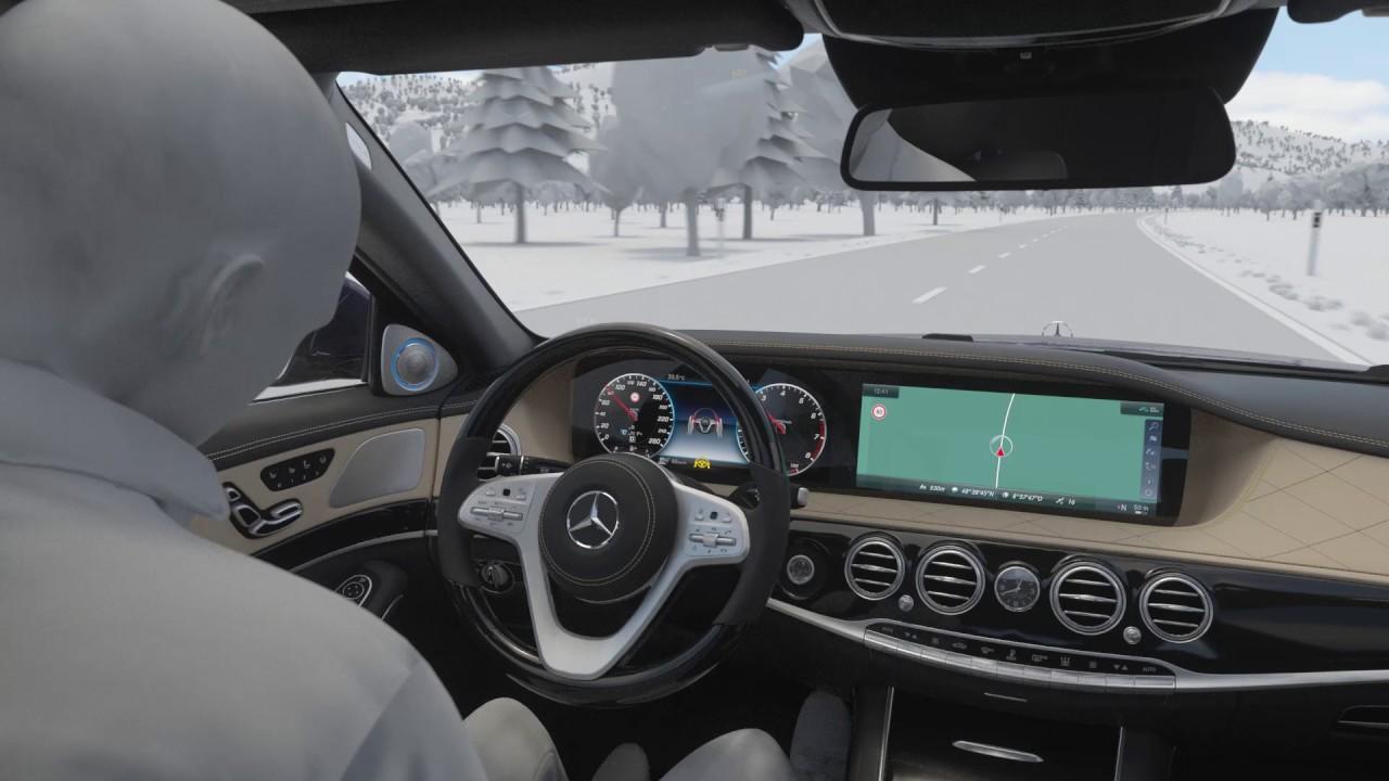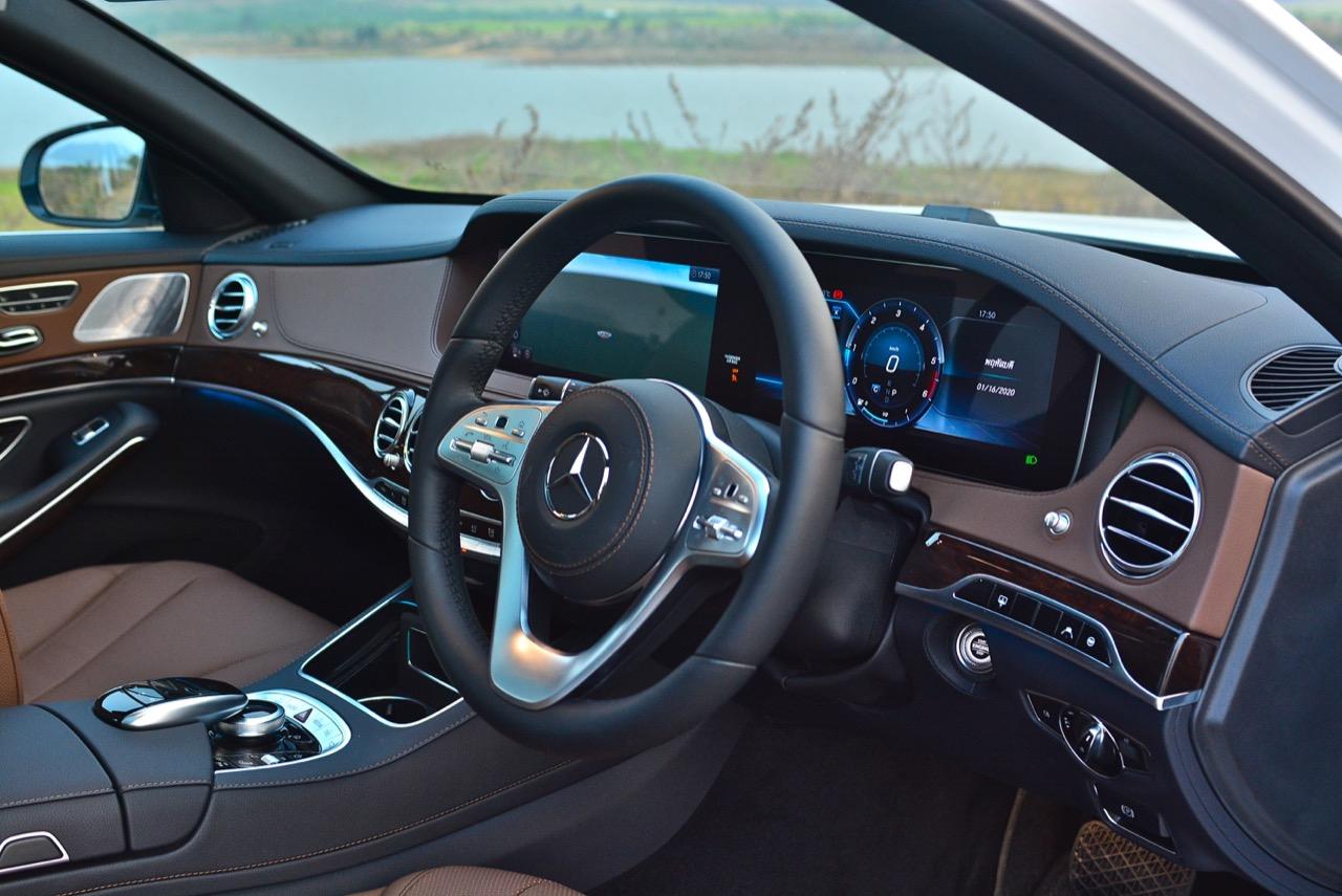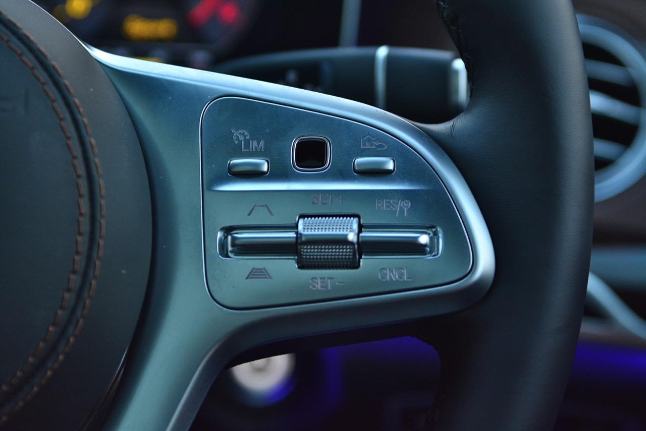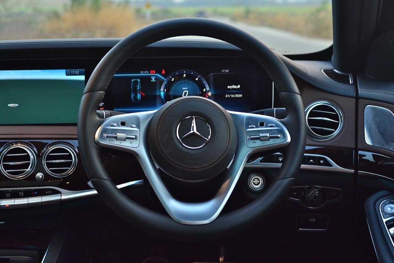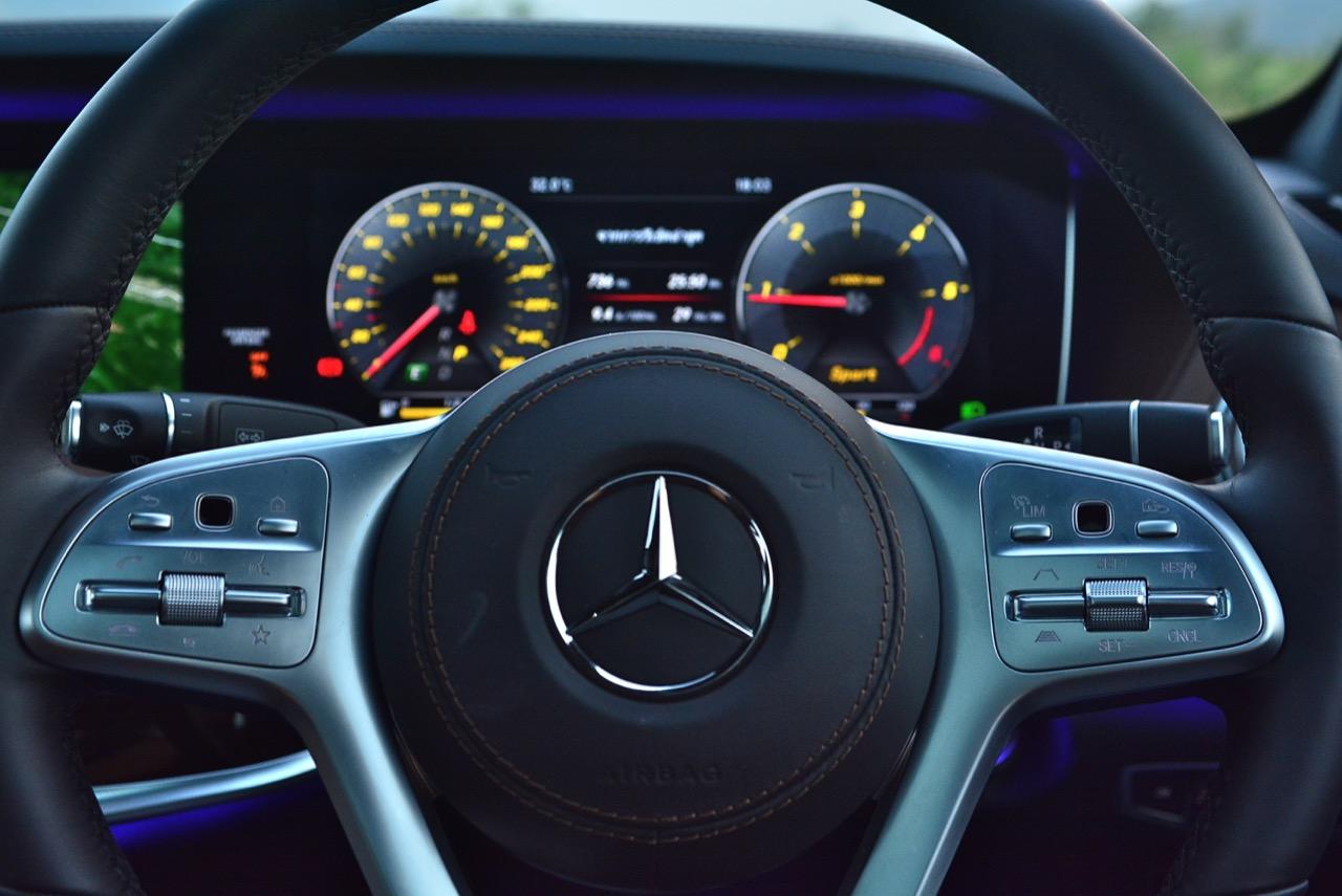 พวงมาลัยไฟฟ้าตอบสนองออกมาในลักษณะค่อยเป็นค่อยไปตามความยาว 5 เมตรกับอีก 20 เซนติเมตรของตัวถัง ระยะของการหมุนที่กระชับและรัดกุมเมื่อขับเร็วมีผ่อนสั้นผ่อนยาวน้ำหนักของพวงมาลัยแปรผันไปตามความเร็วที่ขึ้นตรงกับความแม่นยำ ฐานล้อยาวเหยียด ทำให้การเลี้ยวในที่คับแคบต้องใช้ความระมัดระวังเรื่องของการกะระยะกันพอสมควร แต่ก็ไม่ได้สร้างความยากลำบากในการควบคุมองคาพยพแต่อย่างใดทั้งสิ้น คุณสามารถหมุนพวงมาลัยในย่านความเร็วต่ำด้วยน้ำหนักที่เบาสบายข้อมือแต่กลับให้ความคล่องตัวสูง เนื่องจากการเซตรัศมีวงเลี้ยวไม่ให้กว้างมากจนเกินไปและสามารถกลับลำแบบยูเทิร์นได้อย่างรวดเร็ว พวงมาลัยมีระยะฟรีตรงกลางนิดเดียว ไม่ได้ตึงไม้ตึงมือเหมือนรุ่น AMG แต่ก็มีน้ำหนักที่เหมาะสม เมื่อขับเร็วหรือขับแบบเรื่อยๆ มันจะถ่ายเททั้งองศาของการหมุนที่ดีเยี่ยมและความรู้สึกที่มั่นคงเมื่อทำความเร็ว เป็นชุดบังคับเลี้ยวไฟฟ้าที่ทำออกมาได้ดี และทำให้การควบคุมเจ้าเรือธงเชื่องไม้เชื่องมือดีมาก