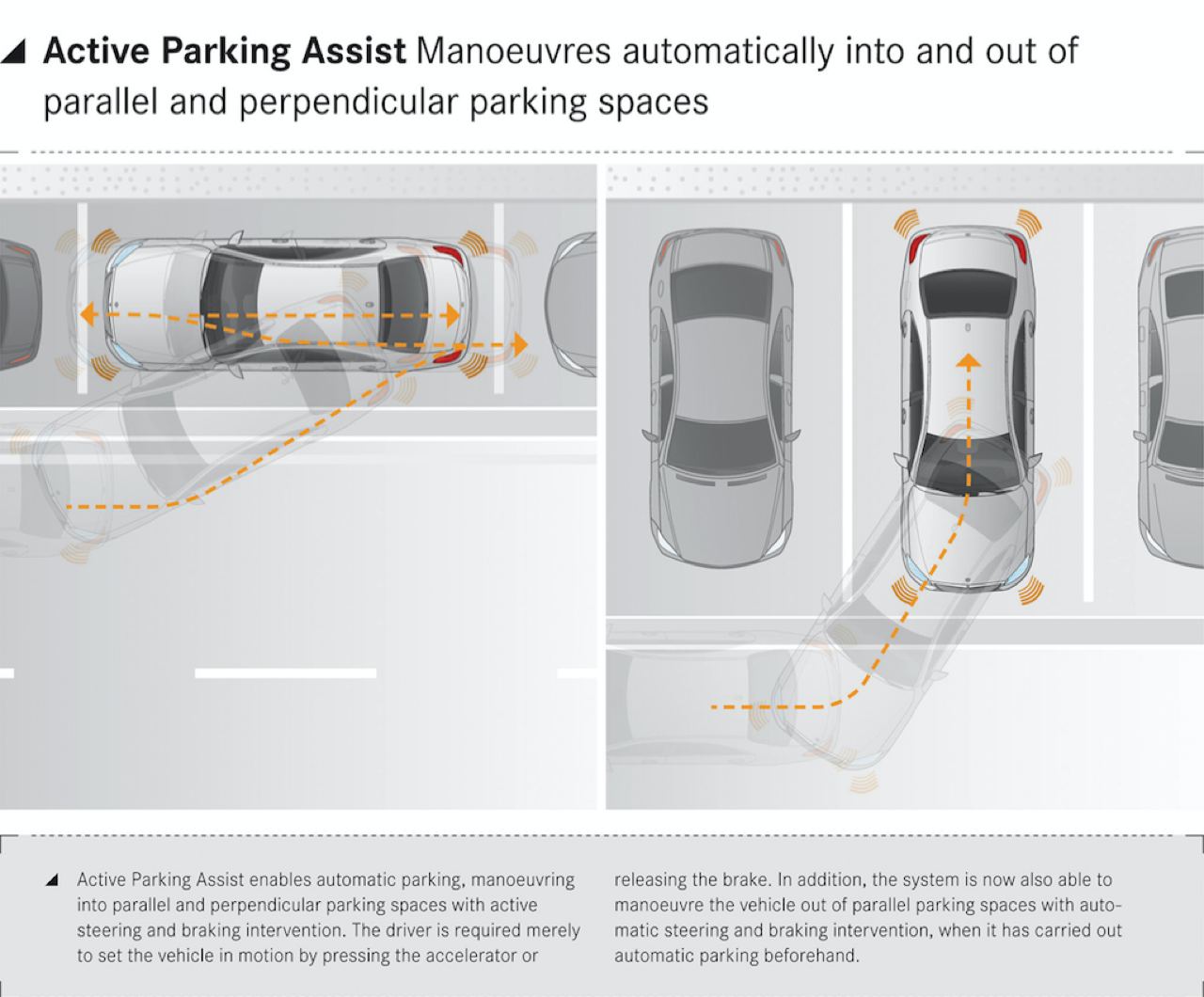 ระบบช่วยนำรถเข้า-ออกจากที่จอดอัตโนมัติ ทั้งการจอดแบบขนานและการจอดแบบเข้าซอง โดยกล้องแสดงภาพรอบทิศทาง 360 องศา จะแสดงภาพบริเวณรอบคันรถในจอแสดงผลรวมถึงภาพจากมุมสูง จึงช่วยให้เห็นสิ่งกีดขวางรอบคันรถ ระบบจะส่งสัญญาณเตือนทั้งภาพและเสียง ในขณะที่กำลังจอดรถด้วยความเร็วไม่เกิน 10 กม./ชม. โดยเป็นการประสานการทำงานของระบบ active steering ระบบ speed control และระบบเปลี่ยนเกียร์อัตโนมัติ แม้ในที่จำกัดหรือในกรณีที่ต้องขยับรถหลายครั้ง เพิ่มความปลอดภัยยิ่งขึ้นด้วยระบบ Drive Away Assist ที่ส่งสัญญาณเตือนเมื่อตรวจจับความเสี่ยงต่อการชนในขณะที่เหยียบคันเร่งหรือเบรกสลับกัน หรือเมื่อผู้ขับขี่เข้าเกียร์ไม่ถูกต้อง ระบบนี้เปิดโอกาสให้คนขับเป็นผู้ที่ควบคุมการตอบสนอง และจะปิดระบบโดยอัตโนมัติ