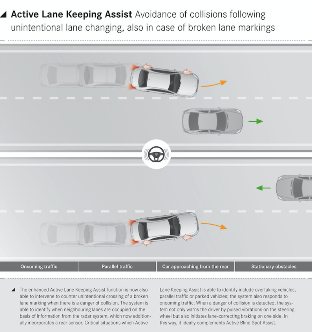 การเปลี่ยนช่องจราจรย่อมมีความเสี่ยงที่จะทำให้เกิดอุบัติเหตุ เรดาร์ของระบบ Active Lane Keeping Assist ทำหน้าที่ตรวจสอบความเสี่ยงในการชนกับรถยนต์ที่ตรวจจับได้ ระบบจะช่วยดึงรถกลับเข้าสู่ช่องจราจรเดิมโดยอัตโนมัติ ด้วยการเบรกล้อฝั่งที่อยู่ตรงข้ามกับรถยนต์ที่ตรวจจับได้ ระบบนี้ยังสามารถตรวจจับรถจักรยานยนต์ที่วิ่งมาด้านข้าง จึงทำให้การเปลี่ยนทิศทางมีความปลอดภัย โดยเฉพาะการขับขี่ในเมืองที่มีการจราจรคับคั่ง บนถนนใหญ่หรือทางด่วนที่มีหลายช่องจราจร