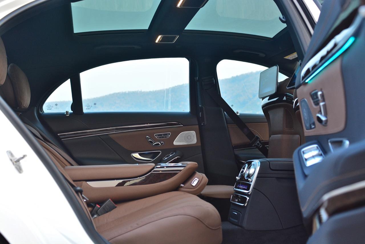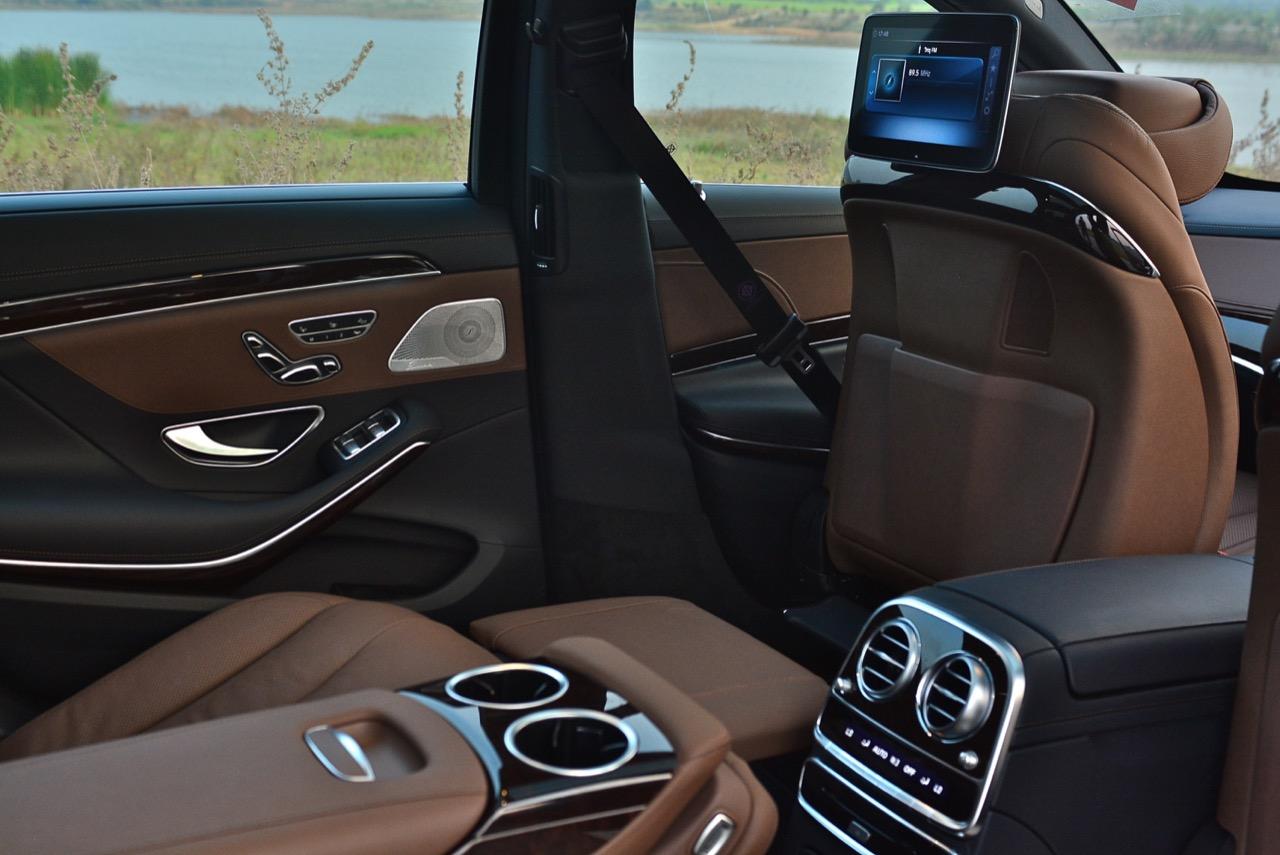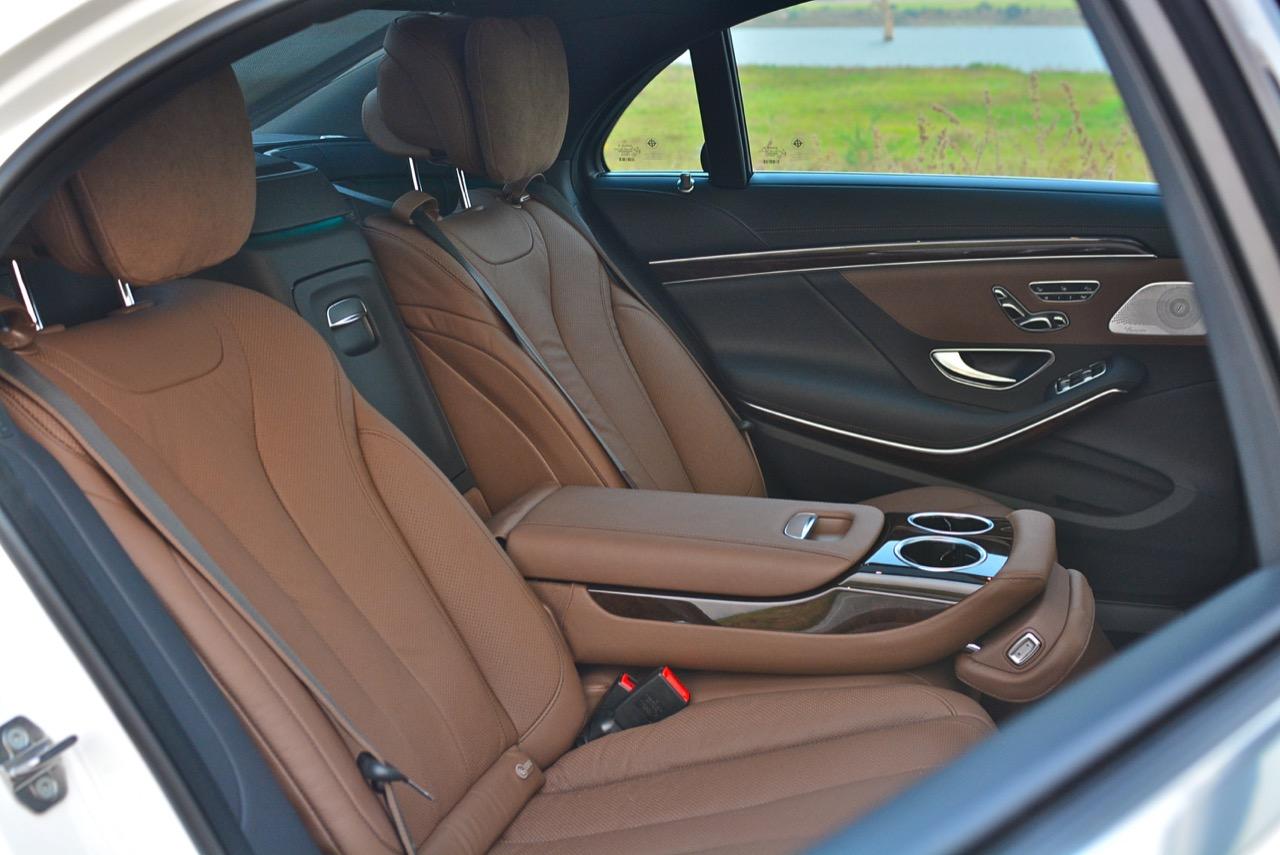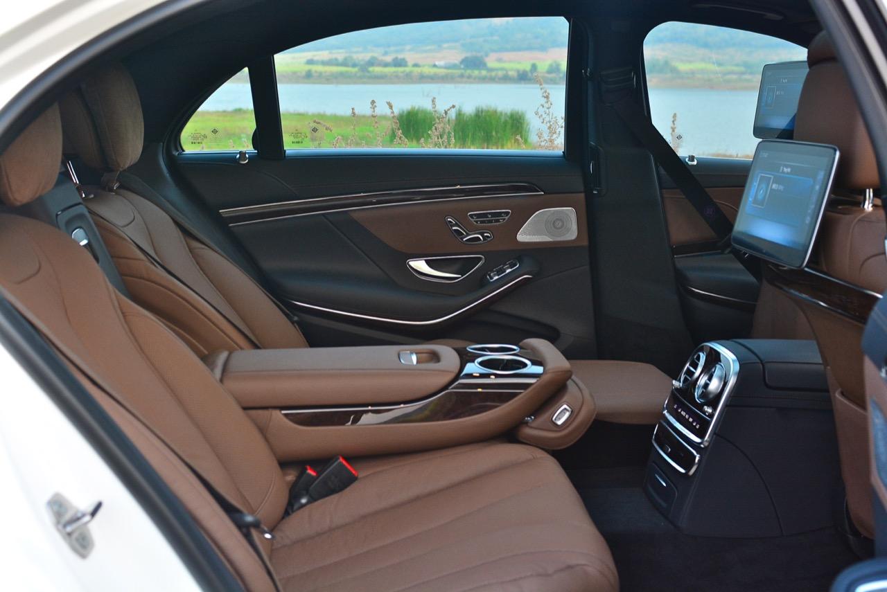 เบาะหลังออกแบบเพื่อความผ่อนคลายพร้อมความสบายในการนั่งโดยสาร เบาะหลังตำแหน่งซ้ายติดตั้งเบาะรองขาแบบไฟฟ้า สามารถปรับตั้งได้อย่างหลากหลายพร้อมๆไปกับการปรับเอนเบาะหลังโดยร่นเบาะผู้โดยสารตอนหน้าไปจนชิดกับคอนโซลหน้าเพื่อเปิดพื้นที่ของการวางเท้าแบบโซฟา! มีลายไม้เพิ่มเติมบริเวณแผงประตู ช่องแอร์สำหรับเพิ่มอากาศเย็นที่สดชื่นสำหรับผู้โดยสารตอนหลัง ติดตั้งทั้งบริเวณกึ่งกลางอุโมงค์เกียร์และที่เสากลาง Mercedes-Benz ออกแบบเบาะหลังของ S-Class ให้เป็นแบบ 3 ที่นั่งแต่เหมาะและลงตัวกับ 2 ที่นั่งมากกว่า เนื่องจากเมื่อกางพนักเท้าแขนออกมาผู้โดยสารทั้งซ้ายและขวาจะได้รับความสบายอย่างเต็มที่ เนื่องจากพื้นที่ที่มีอย่างเหลือเฟือนั่นเอง
