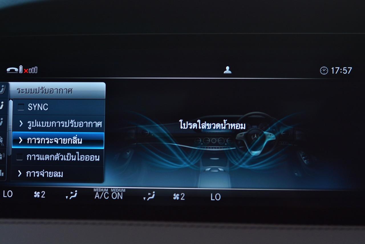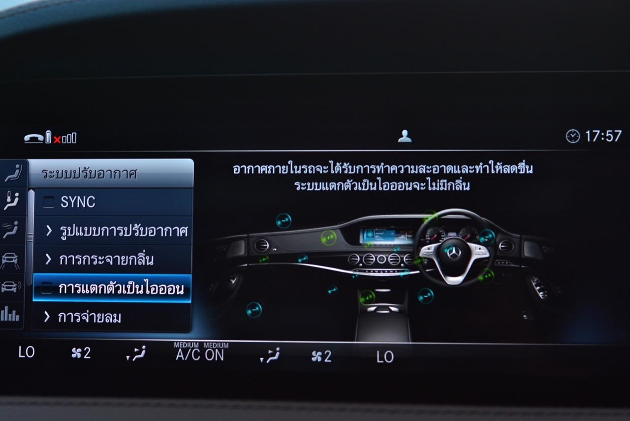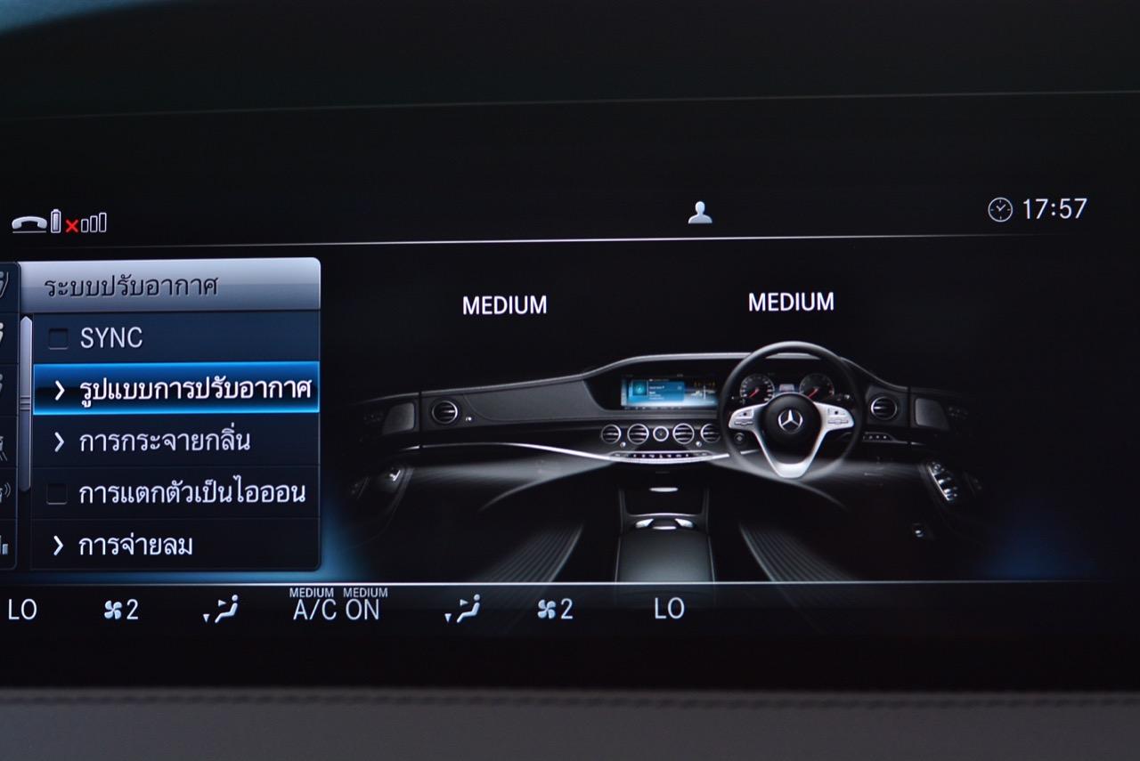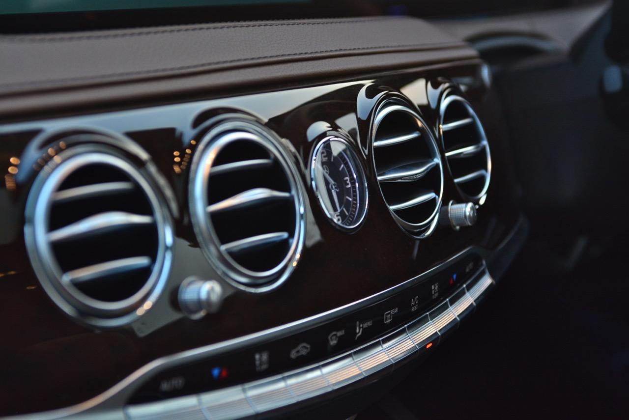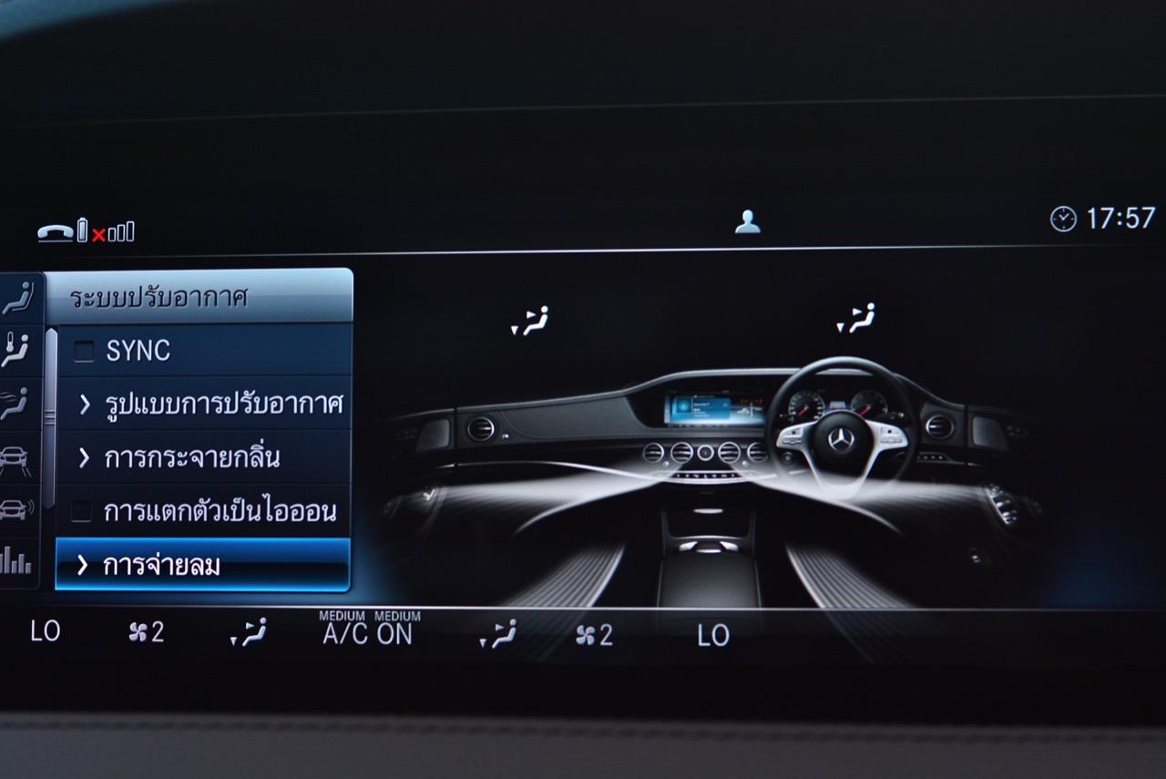 กลางคอนโซลคาดด้วยหนังสีน้ำตาลกับลายไม้โทนสีเข้ม ช่องแอร์สี่ช่องสำหรับคันขับและผู้โดยสารตอนหน้าปรับทิศทางได้อย่างหลากหลาย ระบบปรับอุณหภูมิภายในห้องโดยสารของ Mercedes-Benz S350d Exclusive มีฟังก์ชั่นแยกย่อยให้ใช้งานอีกเพียบ เช่น รูปแบบของการปรับอากาศ การกระจายกลิ่นน้ำหอมที่ติดตั้งอยู่บริเวณช่องเก็บของ แสงไฟสีเขียวและฟ้าพร้อมลมเย็นในฟังก์ชั่นใหม่ช่วยทำให้บรรยากาศภายในรถสะอาดและสดชื่น เนื่องจากระบบแอร์ของเรือธงลำนี้มีการติดตั้งตัวกรองอนุภาคฝุ่น PM 2.5 แม้จะเปิดให้อากาศภายนอกไหลเข้ามาในห้องโดยสารก็ยังต้องผ่านตัวกรองฝุ่นที่กรองได้ละเอียดระดับไมครอน แผงกลางคอนโซลบริเวณกลางช่องแอร์ทั้งสี่ยังติดตั้งนาฬิกาแบบอนาล็อกเพื่อบ่งบอกเวลาในสไตล์ย้อนยุค