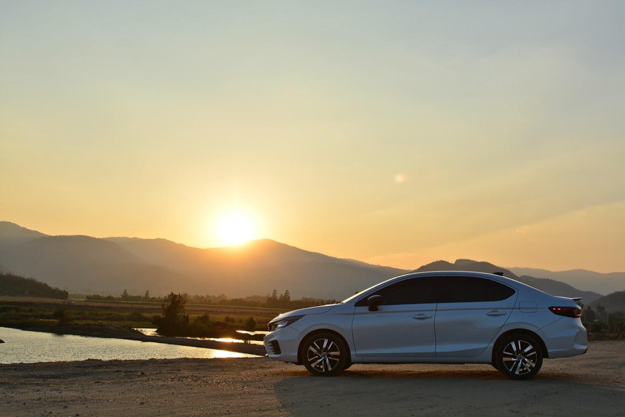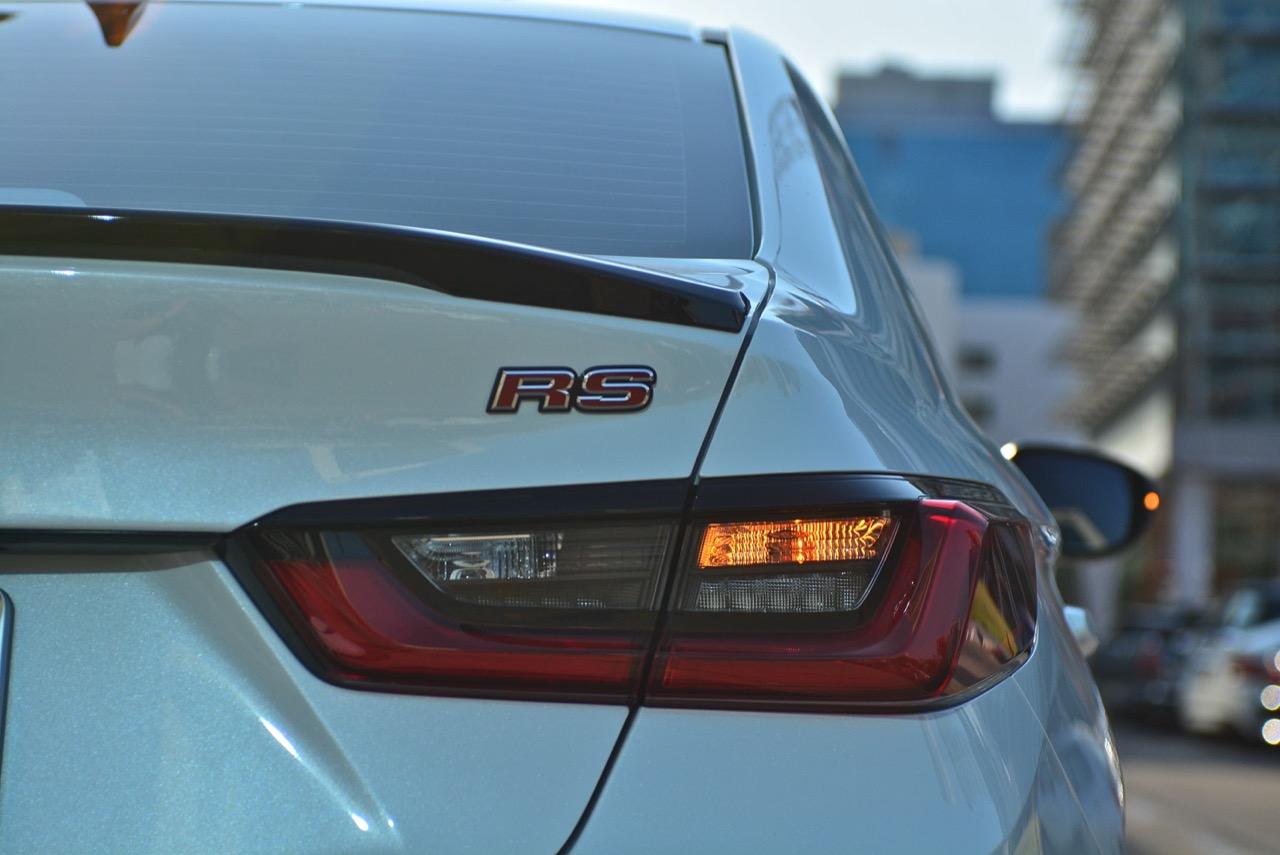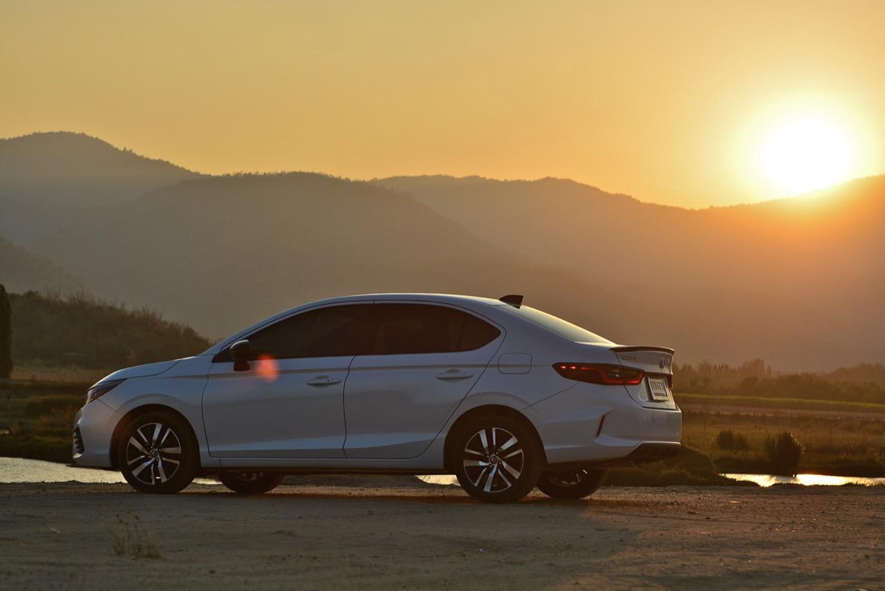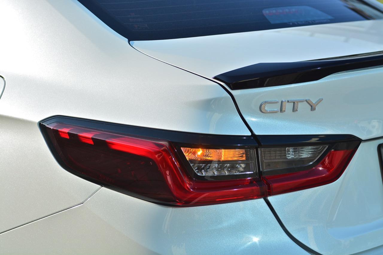 รถทดสอบ New City 1.0 Turbo RS CVT เป็นรุ่นที่น่าสนใจและมีอุปกรณ์เยอะสุด เจ้า RS มาพร้อมชุดแต่งสไตล์สปอร์ตรอบคัน เสาหน้าออกแบบองศาความลาดเอียงเพื่อลดแรงต้านของกระแสลม ผืนหลังคาค่อยๆลดระดับความลาดลงไปจนถึงเสาท้ายอย่างสวยงาม จุดนี้ถือว่า Honda ออกแบบได้ดี มือจับที่เปิดประตูสีเดียวกับตัวถัง กระจกมองข้างสีดำพร้อมไฟเลี้ยวในตัว บั้นท้ายสั้นราวกับรถแฮตชแบค แต่การออกแบบที่ดีทำให้พื้นที่เก็บสัมภาระใต้ฝาท้ายมีเหลือเฟือ คุณจะยัดกระเป๋าเดินทางใบใหญ่หรือถุงกอลฟ์ได้อย่างสบายๆถึง 3 ถุง! จากความลึกของห้องเก็บสัมภาระ