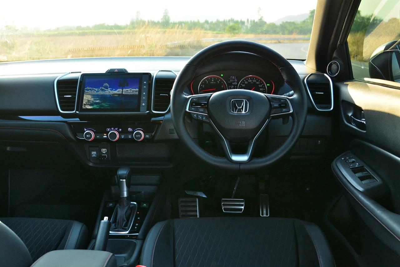 พวงมาลัยทรงสามก้านหุ้มหนังแท้เกรดดี พอจับพวงมาลัยก็จะรู้สึกได้ถึงหนังที่ใช้หุ้ม ความนุ่มกระชับด้วยการออกแบบรอบวงที่พอดีไม่ใหญ่หรือเล็กเกินไปจนจับถือไม่ถนัดมือ พวงมาลัยทรงสปอร์ตของ Honda New City RS มีการติดตั้งสวิตช์มัลติฟังก์ชั่นคอยสั่งงานระบบต่างๆ เช่น ปรับแต่ระบบเสียงหรือเลือกเล่นเพลงผ่านอุปกรณ์ต่างๆ ปุ่มรับหรือวางสายโทรศัพท์ระบบบลูทูธ ปุ่มปรับตั้งความเร็วอัตโนมัติ Cruise Control แป้นเปลี่ยนตำแหน่งเกียร์ Paddle Shift มีขนาดเล็กแต่อยู่ในตำแหน่งที่ใช้นิ้วกดเพื่อเปลี่ยนเกียร์ได้ง่าย หนังชั้นดีที่ใช้หุ้มรอบวงเย็บเดินตะเข็บด้วยด้ายสีแดงตามลักษณะของรถยนต์ Honda ในเวอร์ชั่น RS