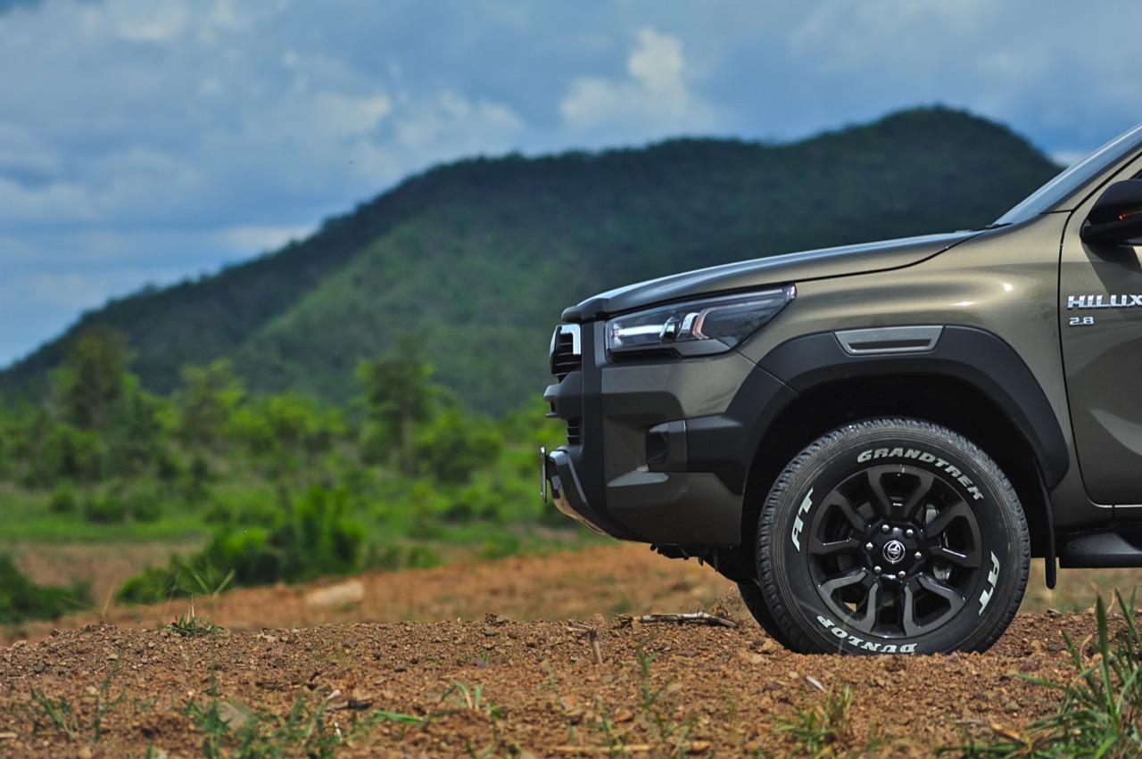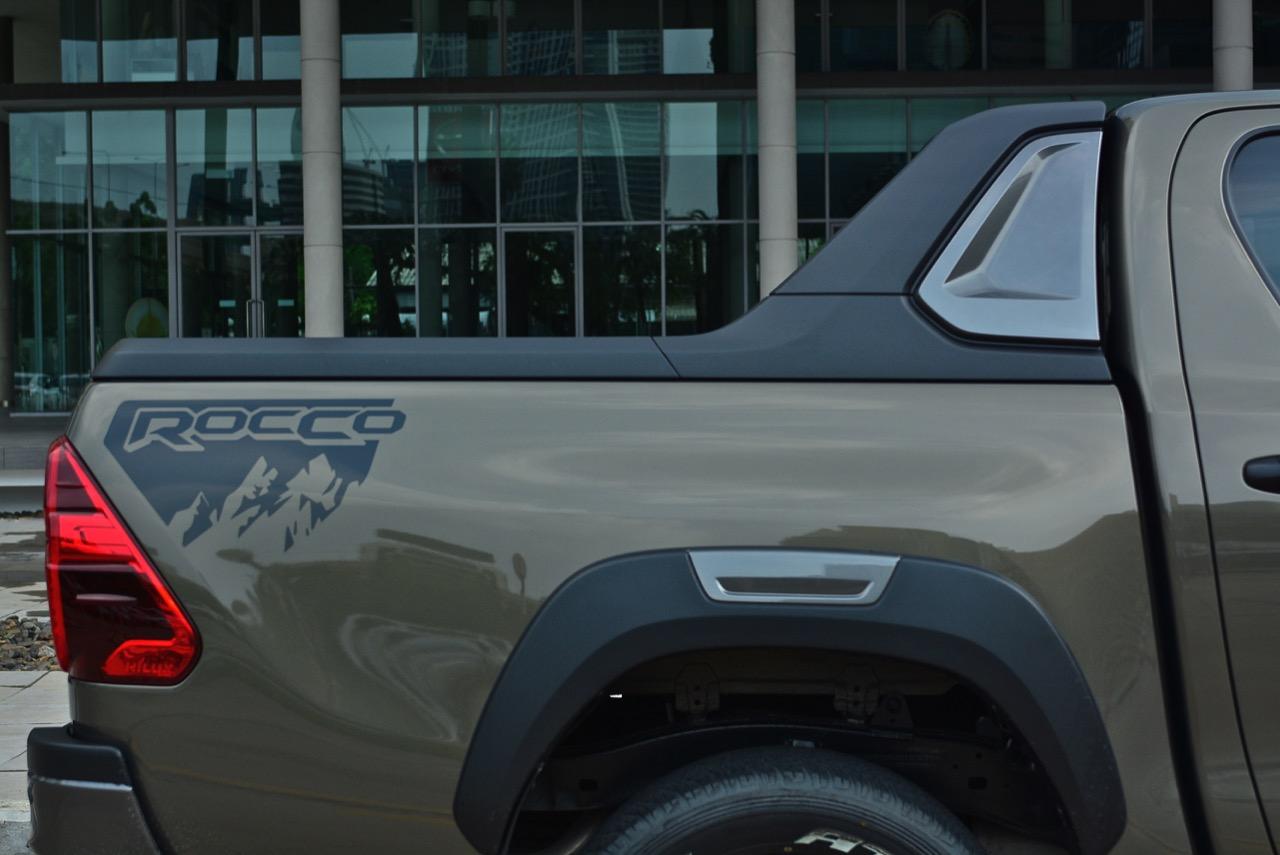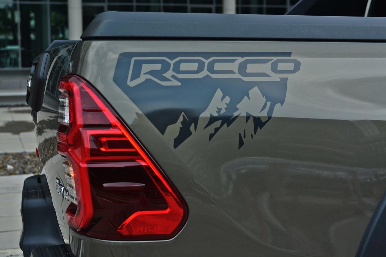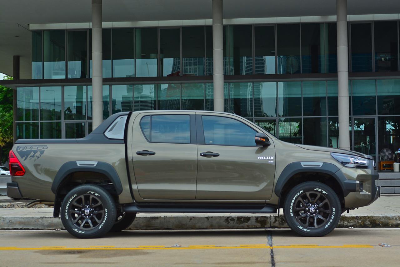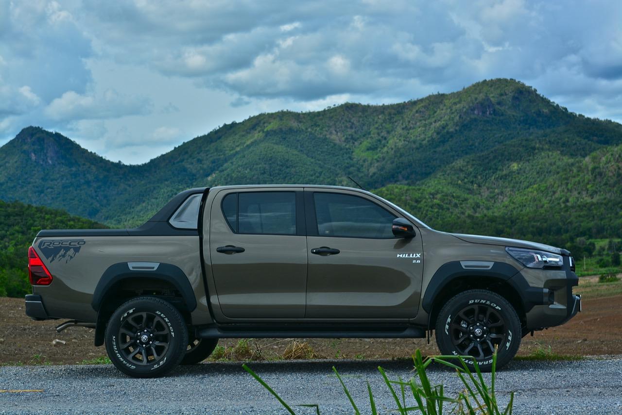 หลังจากทดสอบสั้นๆ ที่ Toyota Driving Experience Park แถบบางนา ค่ายสามห่วงส่งรถทดสอบรุ่นท็อปสุด Hilux Double Cab 4x4 2.8 Rocco AT พร้อมระบบเกียร์อัตโนมัติ 6 จังหวะ กับ Sequential Shift และระบบขับเคลื่อน 4 ล้อ เป็นกระบะยกสูงขับสี่ที่มีราคาถึง 1,239,000 บาท การเปลี่ยนแปลงครั้งใหญ่ไล่จากด้านหน้าที่ดูดีขึ้นมาก ใบหน้าใหม่ของ REVO Rocco โดนใจคนใช้รถกระบะในประเทศไทยมากกว่าหน้าเดิมแบบมู่ทู่ของรุ่นที่แล้ว มิติตัวถังของ REVO Rocco 2.8AT 4X4 ยาว 5,325 มิลลิเมตร กว้าง 1,900 มิลลิเมตร สูง 1,810 มิลลิเมตร ความยาวฐานล้อ 3,085 มิลลิเมตร ระยะห่างล้อหน้า 1,540 มิลลิเมตร ระยะห่างล้อหลัง 1,550 มิลลิเมตร ความสูงจากพื้นถึงใต้ท้องรถ 216 มิลลิเมตร กระบะยาว 1,840 มิลลิเมตร กว้าง 1,540 มิลลิเมตร สูง 480 มิลลิเมตร ล้ออะลูมิเนียมสีเทาดำ ห่อรัดด้วยยางรุ่นพิเศษ Dunlop Grandtrek ไซล์ 265/60R18 110H AT25