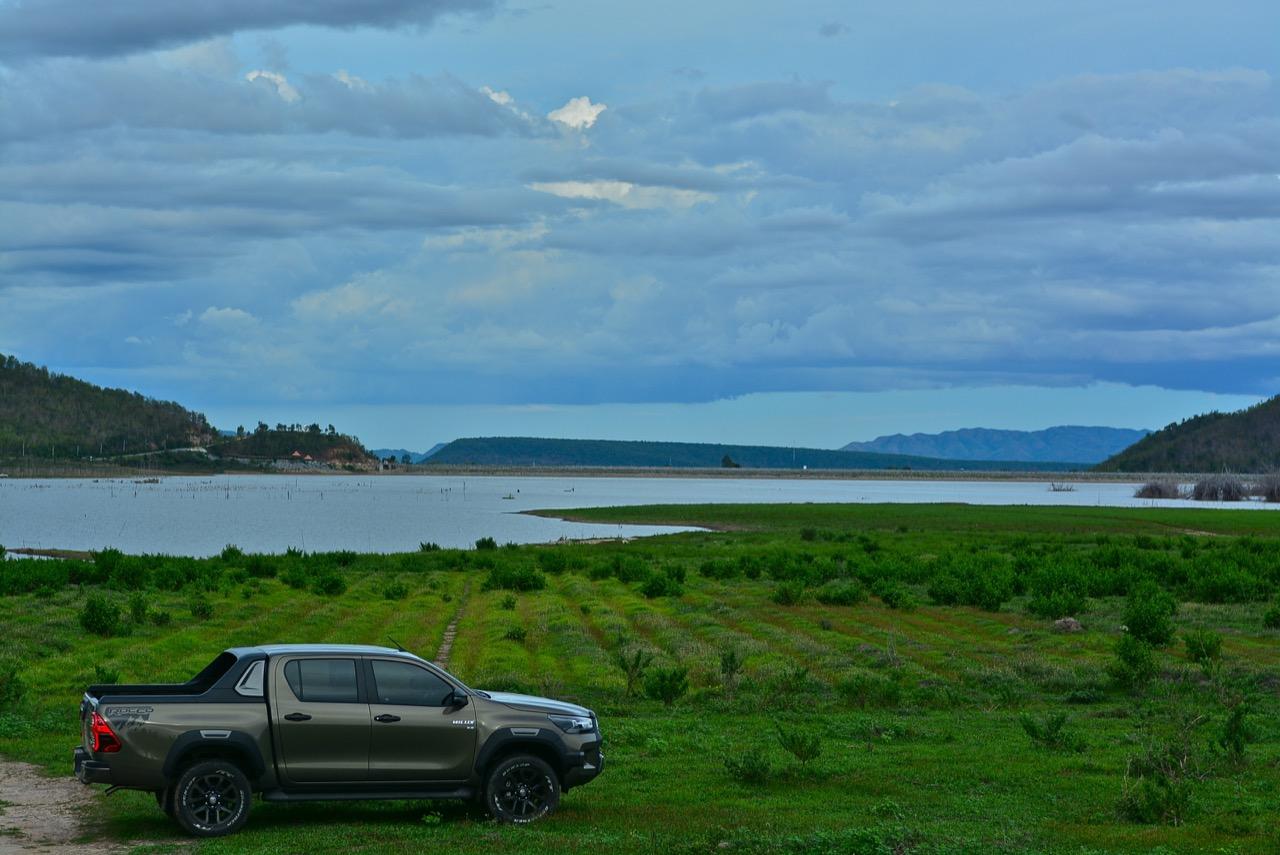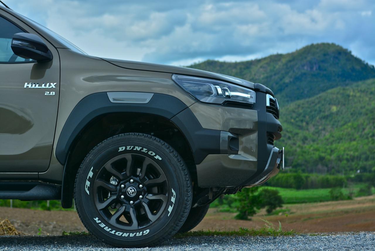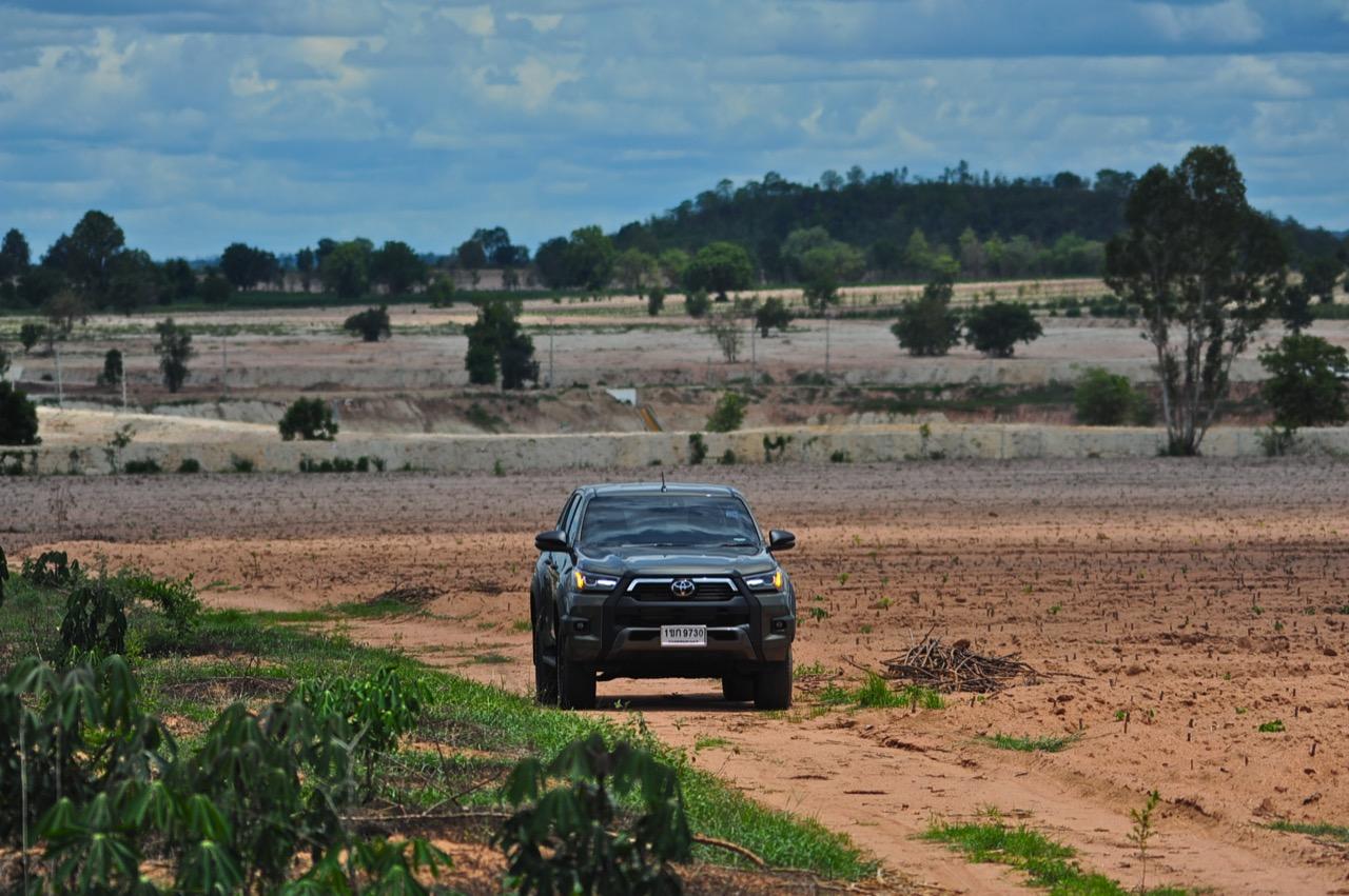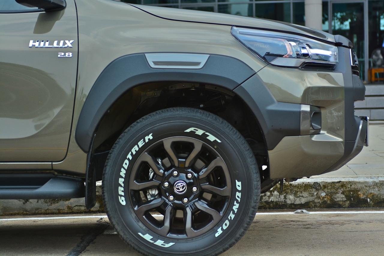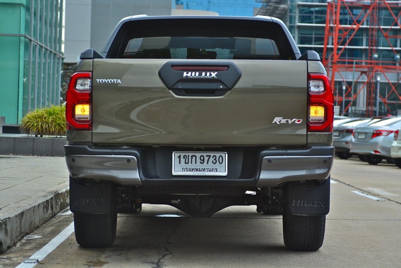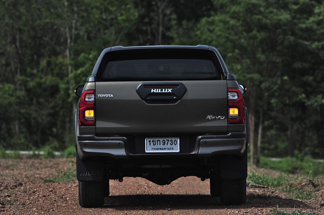 หลังจากทดสอบสั้นๆ ที่ Toyota Driving Experience Park แถบบางนา ค่ายสามห่วงส่งรถทดสอบรุ่นท็อปสุด Hilux Double Cab 4x4 2.8 Rocco AT พร้อมระบบเกียร์อัตโนมัติ 6 จังหวะ กับ Sequential Shift และระบบขับเคลื่อน 4 ล้อ เป็นกระบะยกสูงขับสี่ที่มีราคาถึง 1,239,000 บาท การเปลี่ยนแปลงครั้งใหญ่ไล่จากด้านหน้าที่ดูดีขึ้นมาก ใบหน้าใหม่ของ REVO Rocco โดนใจคนใช้รถกระบะในประเทศไทยมากกว่าหน้าเดิมแบบมู่ทู่ของรุ่นที่แล้ว มิติตัวถังของ REVO Rocco 2.8AT 4X4 ยาว 5,325 มิลลิเมตร กว้าง 1,900 มิลลิเมตร สูง 1,810 มิลลิเมตร ความยาวฐานล้อ 3,085 มิลลิเมตร ระยะห่างล้อหน้า 1,540 มิลลิเมตร ระยะห่างล้อหลัง 1,550 มิลลิเมตร ความสูงจากพื้นถึงใต้ท้องรถ 216 มิลลิเมตร กระบะยาว 1,840 มิลลิเมตร กว้าง 1,540 มิลลิเมตร สูง 480 มิลลิเมตร ล้ออะลูมิเนียมสีเทาดำ ห่อรัดด้วยยางรุ่นพิเศษ Dunlop Grandtrek ไซล์ 265/60R18 110H AT25