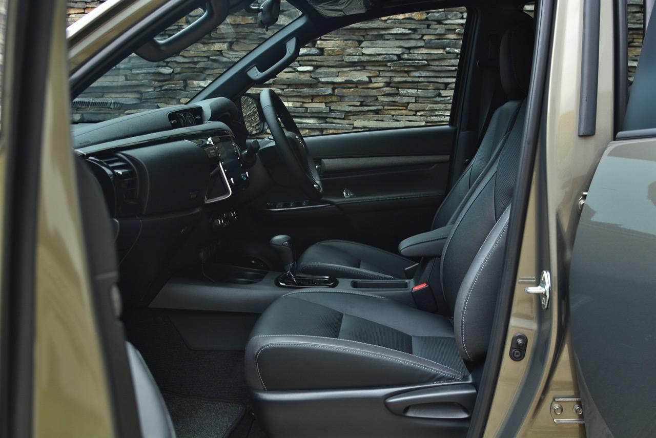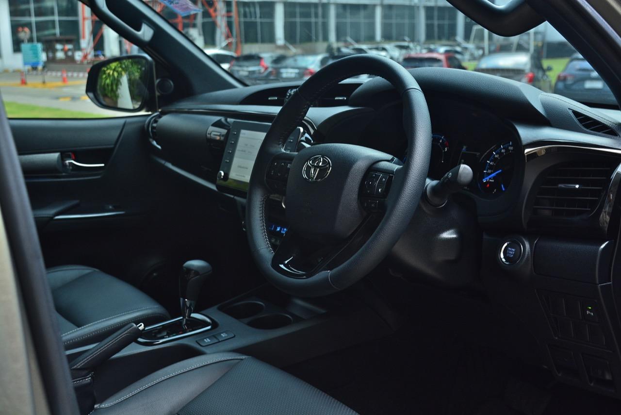 ห้องโดยสารของ Hilux REVO Rocco รุ่นสูงสุด 4x4 2.8G AT Double Cab ไม่ได้น้อยหน้ารถคู่แข่งในด้านของอุปกรณ์อำนวยความสะดวก แม้จะทำตัวเป็นรถปิกอัพของขาลุย เป็นกระบะที่มีขนาดห้องโดยสารพอฟัดพอเหวี่ยงกับรถกระบะ 4 ประตูขับเคลื่อน 4 ล้อของคู่แข่งทุกค่าย จากรูปแบบของคอนโซลกลาง การจัดวางตำแหน่งของซุ้มเกียร์ จอภาพมัลติฟังก์ชั่นระบบสัมผัส พวงมาลัยสไตล์บึกบึนแบบ 4 ก้าน เบาะโดยสารหุ้มด้วยหนังสีดำ รวมถึงแผงประตูและวัสดุห่อหุ้มหลังคาโทนสีดำ ภายในของเจ้า Hilux REVO Rocco รุ่นปรับโฉมมีความเปลี่ยนแปลงน้อยมาก มันเหมือนการยกอุปกรณ์ของรถเก๋ง Toyota มาไว้ในรถกระบะ จอภาพกลางคอนโซลที่ยื่นออกมาเพื่อทำให้การสัมผัสสั่งงานลงไปบนจอภาพแบบใหม่มีความสะดวกสบายไม่ต้องเอื้อมมือกันให้มากเรื่อง ที่ชอบและโดนก็คือคอนโซลที่แตกต่างจากรถปิกอัพคู่แข่งอย่างชัดเจนในเรื่องของดีไซน์ สีสัน และความสะดวกในการใช้งานอุปกรณ์ที่ติดตั้งอยู่ในคอนโซลทั้งจอภาพ ช่องแอร์กรุขอบด้วยพลาสติกสีดำเงา ชุดควบคุมอุณหภูมิภายในห้องโดยสารเป็นแบบดิจิตอลทั้งหมด ช่องแอร์ด้านบนมีนาฬิกาดิจิทัลอยู่ตรงกึ่งกลาง การออกแบบให้ชิ้นงานบางชิ้นมีความละเอียดน่าใช้เช่น จุดที่โดนใจนักเลงรถก็คือหน้าปัดมาตรวัดของเจ้า Hilux REVO Rocco 2.8G AT ที่มีรายละเอียดและสีสันภายในสวยงามน่ามอง