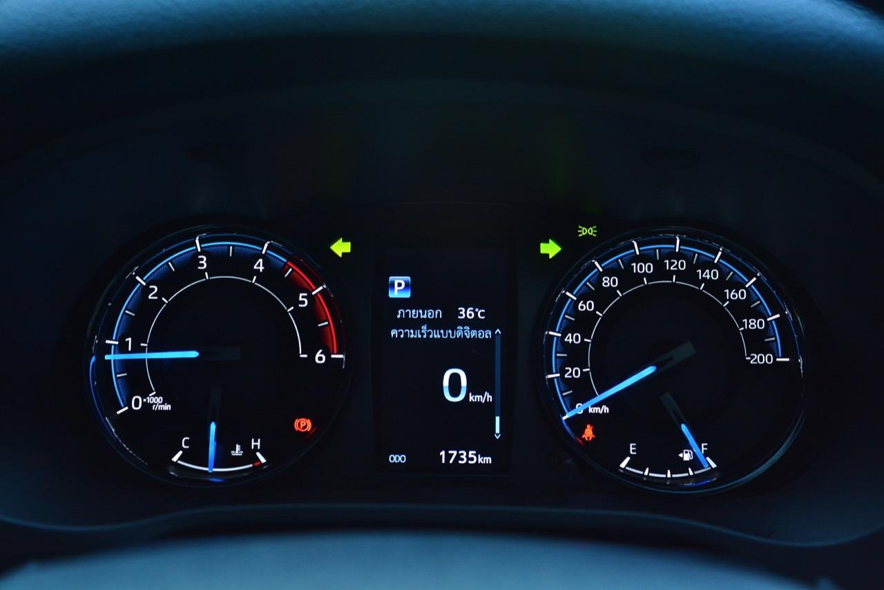 มาตรวัดเรืองแสงเปลี่ยนจากโทนสีขาวมาเป็นสีฟ้าอมน้ำเงิน ใช้ตัวเลขสีขาวบนพื้นสีดำแบบเรืองแสงกับเข็มสีฟ้าเพื่อให้ง่ายและมองเห็นได้ชัดเจนต่อการอ่านค่า ทั้งมาตรวัดความเร็วด้านขวามือกับมาตรวัดรอบเครื่องยนต์ด้านซ้าย กึ่งกลางของมาตรวัดทั้งสองวาง MID หรือ Multi information display ซึ่งใช้จอภาพแบบ TFT หรือ Thin film transistor เมื่อกดดูรายละเอียดการแจ้งเตือนต่างๆ ของจอภาพขนาดเล็กก็จะพบว่าจอ MID ของเจ้า REVO Rocco รุ่นท็อปยัดความสามารถในการแจ้งค่าต่างๆ ของตัวรถมาให้เพียบ เช่น ตำแหน่งของการเปิดประตูแต่ละบาน / ทริปมิเตอร์ a/b / อุณหภูมิภายนอก / คำนวณปริมาตรการใช้เชื้อเพลิงเป็นหน่วยลิตรต่อกิโลเมตร / เชื้อเพลิงภายในถังต่อระยะทางที่สามารถวิ่งไปถึง / สถานะของการขับขี่และการให้คะแนนความประหยัดในโหมด ECO / ตำแหน่งของเกียร์ออโต 6 สปีด ที่เพิ่มเข้ามาให้ใช้ก็คือ กราฟิกจำลองมุมของล้อหน้าเมื่อขับลุยฝ่าทางวิบาก ช่วยเพิ่มมุมมองให้รับรู้ทิศทางของล้อได้ดีเมื่อไต่เนินสูงชันหรือปีนข้ามสิ่งกีดขวาง ช่วยให้การวางตำแหน่งรถมีความแม่นยำขณะขับฝ่าทางที่เต็มไปด้วยเนินสูงและหล่มลึก