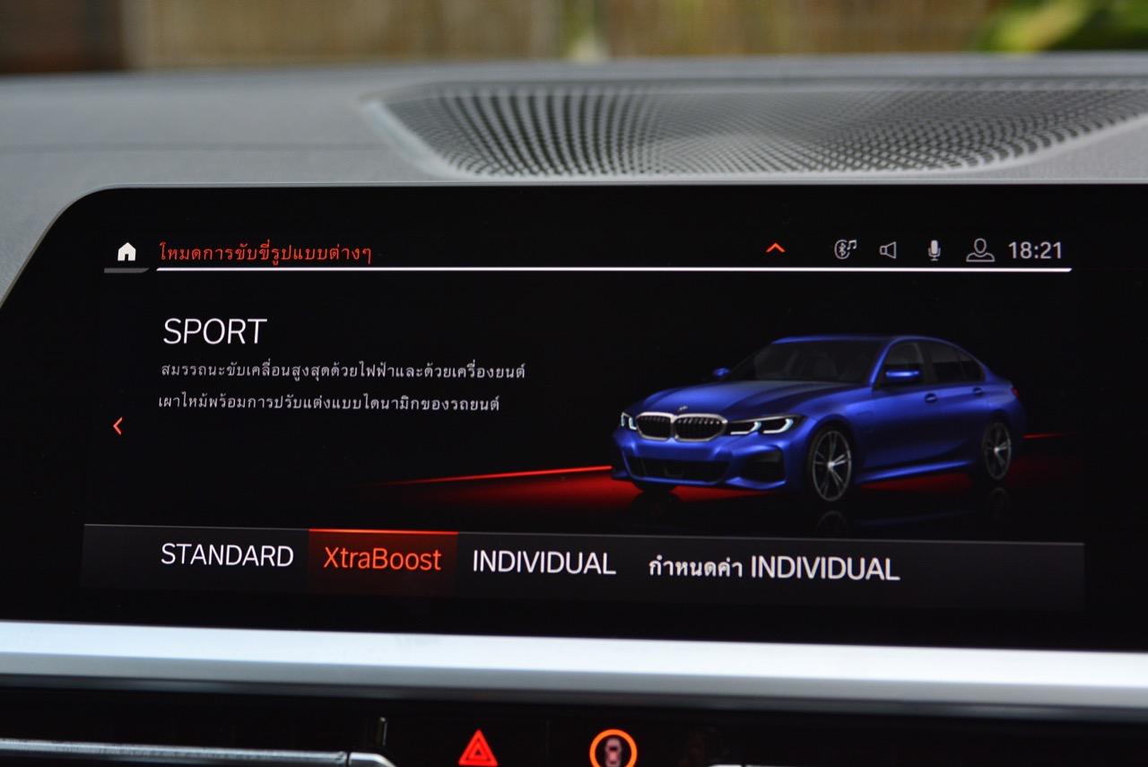 ไม่พูดพร่ำทำเพลง รับรถมาแล้วก็ขึ้นไปเหยียบคันเร่งกันเต็มๆ บนไฮเวย์ในโหมด SPORT เพื่อดูการตอบสนองของระบบต่างๆ 330e เป็นรถซีดานที่ดึงหนักอย่างโหดโดยเฉพาะการกดเลือกใช้โหมด Extraboost ที่ซ่อนตัวอยู่ในโหมด Sport คุณต้องกดสวิตช์โหมด Sport สองครั้งเพื่อเข้าสู่โหมดบ้าพลังอย่าง Extraboost ฝูงม้าทั้ง 292 ตัวทั้งมอเตอร์และเครื่องยนต์ที่คอยกระหน่ำเทแรงบิดจนไหลทะลักออกมาอย่างต่อเนื่อง คุณสามารถลากรอบเล่นได้หากมีที่ว่างข้างหน้ามากพอก็กดคันเร่งให้จมมิดได้เลย Extraboost นอกจากจะเป็นโหมดสูงสุดแล้ว ยังไปเปิดท่อ bypass valve ของระบบระบายไอเสีย เสียงท่อที่เคยเงียบหรือติ๋มๆ หงิมๆ ในโหมดอื่น เจ้า Extraboost จะเปลี่ยนเป็นเสียงท่อของรถแต่งในทันทีทันใดที่คันเร่งถูกกระตุ้น ประสิทธิภาพในการเทแรงบิดจากเครื่องยนต์ผ่านระบบเกียร์ 8 สปีด ออกมาในแบบกระชากกระชั้นดันไปข้างหน้า มันสามารถไต่ความเร็วได้ดีมากจนต้องใช้ความระวังมากกว่าขับ 320d